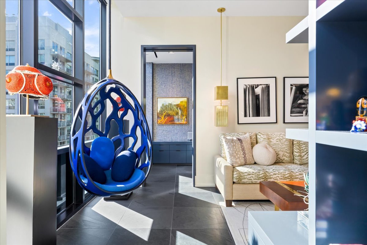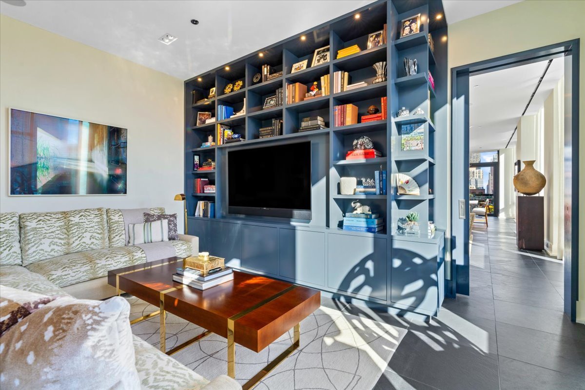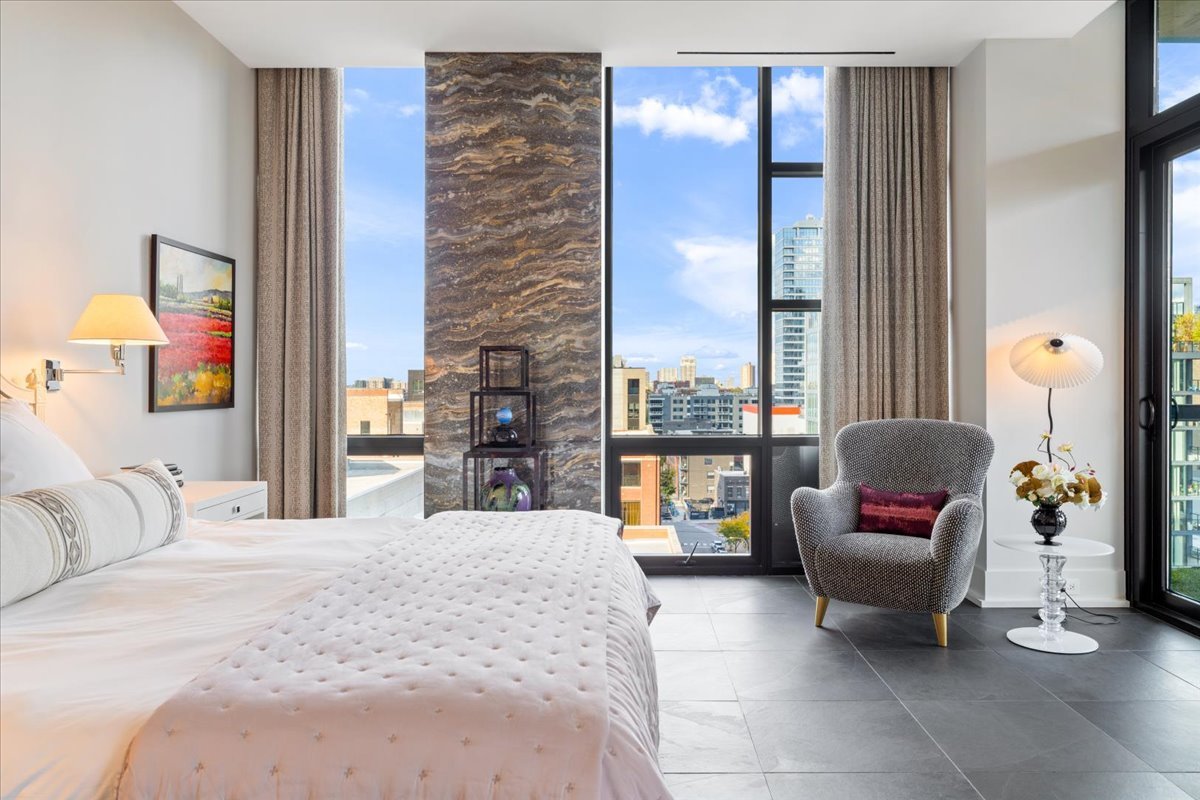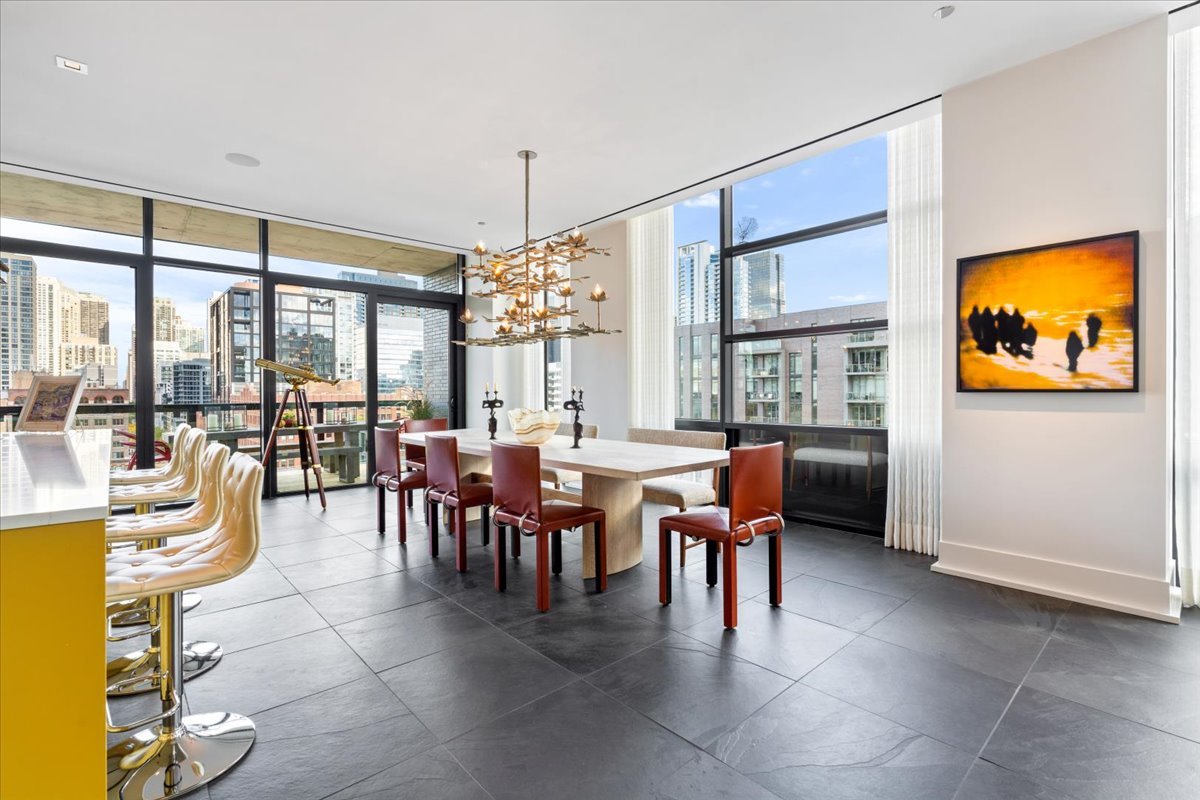 Design-forward and contemporary with flawless fixtures and finishes throughout, 400 W. Huron St., unit 801, is a 3,065-square-foot, 3 bed/3 bath luxury condo in the heart of River North with an impressive indoor-outdoor footprint. Located on a posh stretch of Huron, close to lifestyle amenities at BIAN and East Bank Club, this professionally designed home begins with an open foyer that features high ceilings, Venetian plasterwork, dark gray slate flooring, and an adjacent, custom-designed coat closet that links to a bonus, walk-in storage room. Via an interior gallery hall that affords access to a jewel box powder room with a hand-painted wallcovering by de Gournay, the entry also connects to a natural-light-filled, 20′ x 36′ great room that encompasses a trio of elevated spaces for entertaining and everyday living: a grand living room, a corner-positioned dining room, and a modern chef’s kitchen. The living room boasts beautiful, built-in bookshelves including a custom magazine rack and floor-to-ceiling windows that frame spectacular skyline views. The dining room delights with a custom Parisian chandelier and space for a 10-person table. The beautifully appointed, custom kitchen features seamless Italian cabinetry, white quartzite countertops, Miele appliances including a double oven, a large island that seats four, and a built-in bar with floating glass shelves. Better still, the kitchen and dining room connect to an incredible 9′ x 46′ terrace with an abundance of space for outdoor dining, lounging and grilling. Both of this home’s secondary bedrooms are exquisitely designed and offer access to full baths with polish and personality. (One of the two secondary bedrooms is currently styled as a fashionable library with a custom media center with shelving and cabinetry, but the room can easily be transitioned back to a bedroom based on preference.) There’s also a tucked-away home office with a built-in, L-shaped desk for working from home. On the opposite side of the floor plan, this home presents a spectacular primary suite that begins with a long hallway with more built-in custom storage (both cabinets and drawers) that’s followed by a corner bedroom with two full walls of windows, a seating area, decorative eglomise (gilded glass) wall panels, a custom 11′ x 17′ dressing room with styling island, and a spa-like marble ensuite bath with dual vanity, soaking tub, a deluxe shower, and a separate water closet. Callout details include custom millwork, paint, and wallcoverings throughout, designer lighting and window treatments, high-end custom finishes and plasters by Simes Studios, handmade laser-cut light panels, state-of-the-art AV, and full home automation including electric shades and mood lighting. Building amenities include an incredibly chic lobby with door staff, a fitness center, a dog run, private wine lockers for 80 bottles, and two garage parking spaces. (Pets allowed.) Steps to James Beard Award-winning restaurant Obelix, blocks from the Chicago River and the Design District, and minutes from the world-class shopping, dining and culture that surround the Mag Mile, 400 W. Huron St., unit 801, is one-of-a-kind luxury living with total privacy, turnkey comforts, and high style.