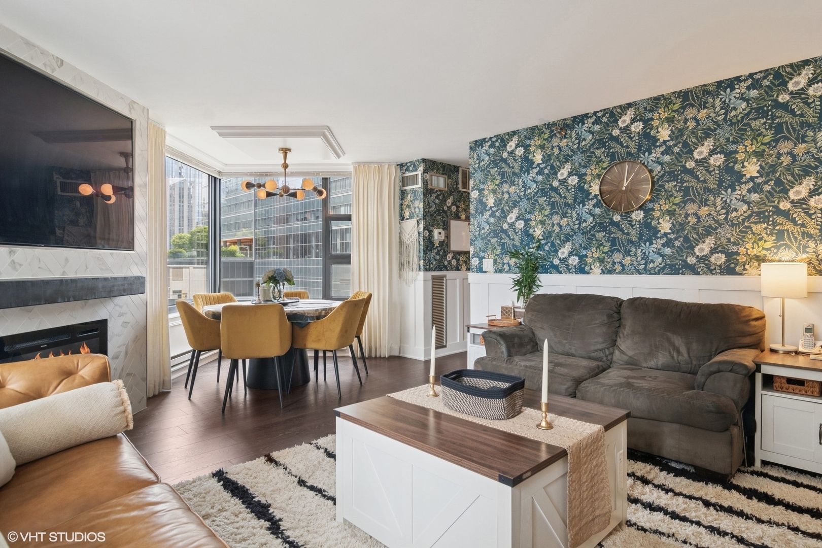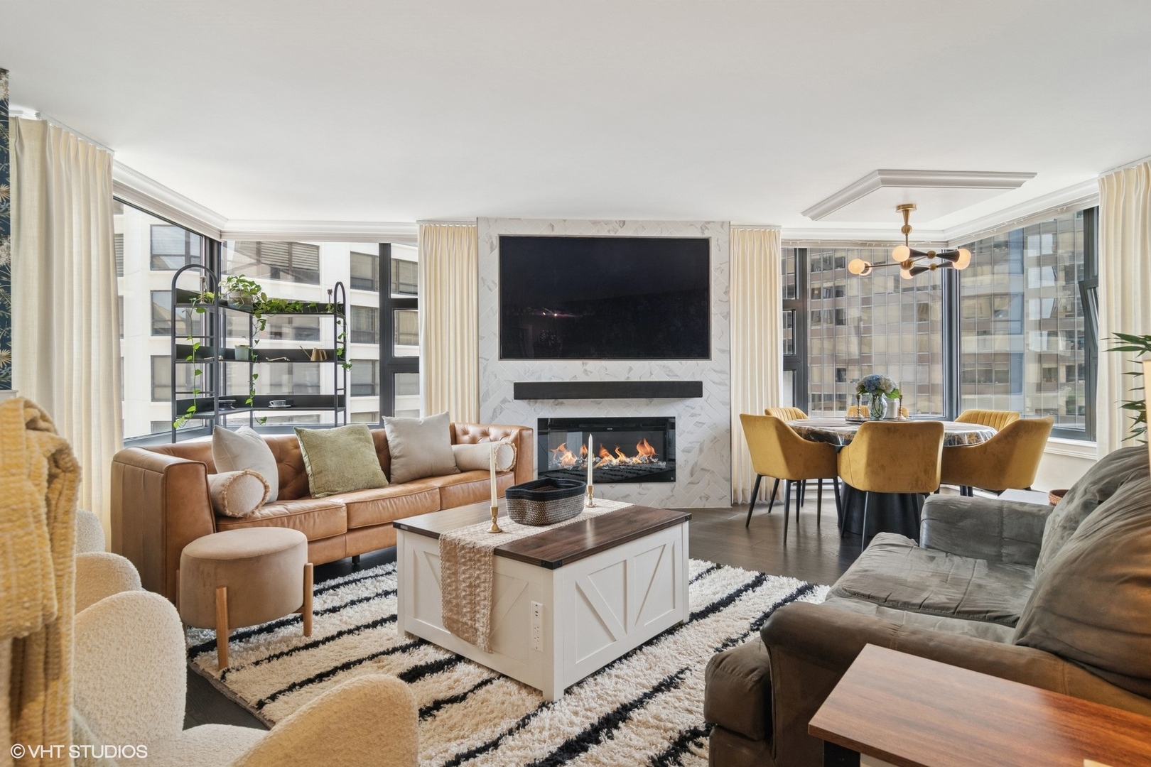 Designer renovated 2 bed 2 bath condo in the heart of Streeterville. Welcome to Residence 1202 at 401 E Ontario – a truly sophisticated condo in a premier full-amenity building with garage parking included. This gorgeous home has been thoughtfully reimagined with every detail in mind – eclectic grandmillenial style, high-end finishes, and modern conveniences throughout. Step into a sun-drenched corner unit featuring all-new wide-plank flooring, elegant custom millwork and moldings, custom lighting and window treatments that frame the city views. The spacious living area centers around a show-stopping custom fireplace wall with built-in TV, offering a perfect blend of comfort and contemporary flair. The defined dining space surrounded by windows offers plenty of seating. The sleek, upgraded kitchen boasts new marble countertops, a new refrigerator, dishwasher and microwave, and refined cabinetry-ideal for everyday cooking and entertaining alike. Both bathrooms have been fully redone with modern vanities, designer tile, and high-end fixtures, including luxe gold rainfall shower heads for a spa-like experience. Additional upgrades include added storage and closet systems, providing exceptional organization and function. Building amenities include 24-hour door staff, indoor pool, jacuzzi, two expansive sun decks, resident lounge, a fully equipped fitness center, sauna, and on-site management. Located just one block from Lake Michigan, the lakefront trail and beach, steps to Navy Pier, Whole Foods, Trader Joes, restaurants, coffee shops, movie theatre, museums, and transportation. Don’t miss this rare opportunity to own a fully upgraded residence in one of Chicago’s most sought-after neighborhoods.