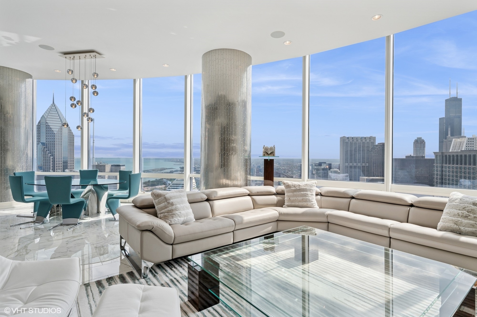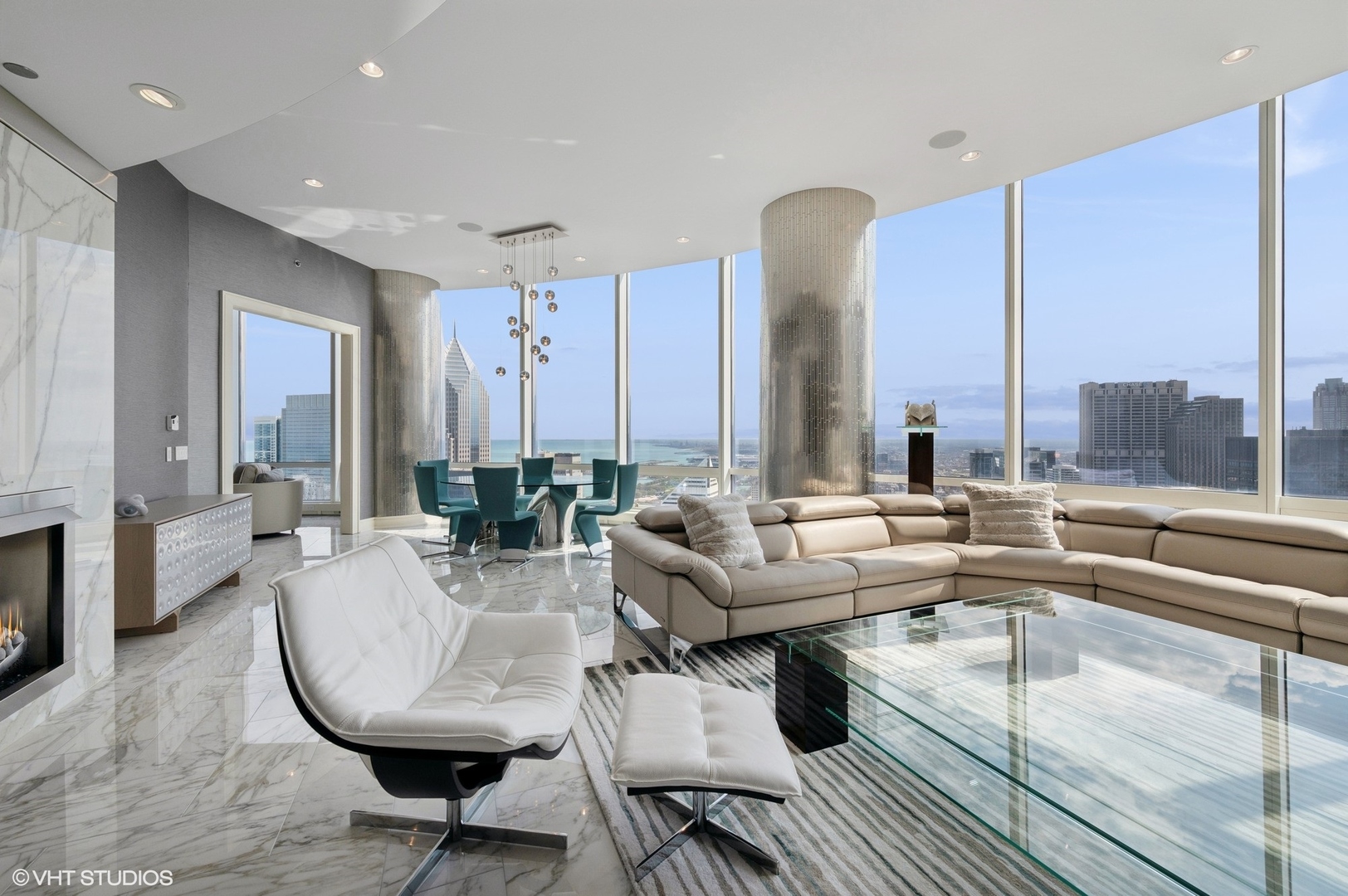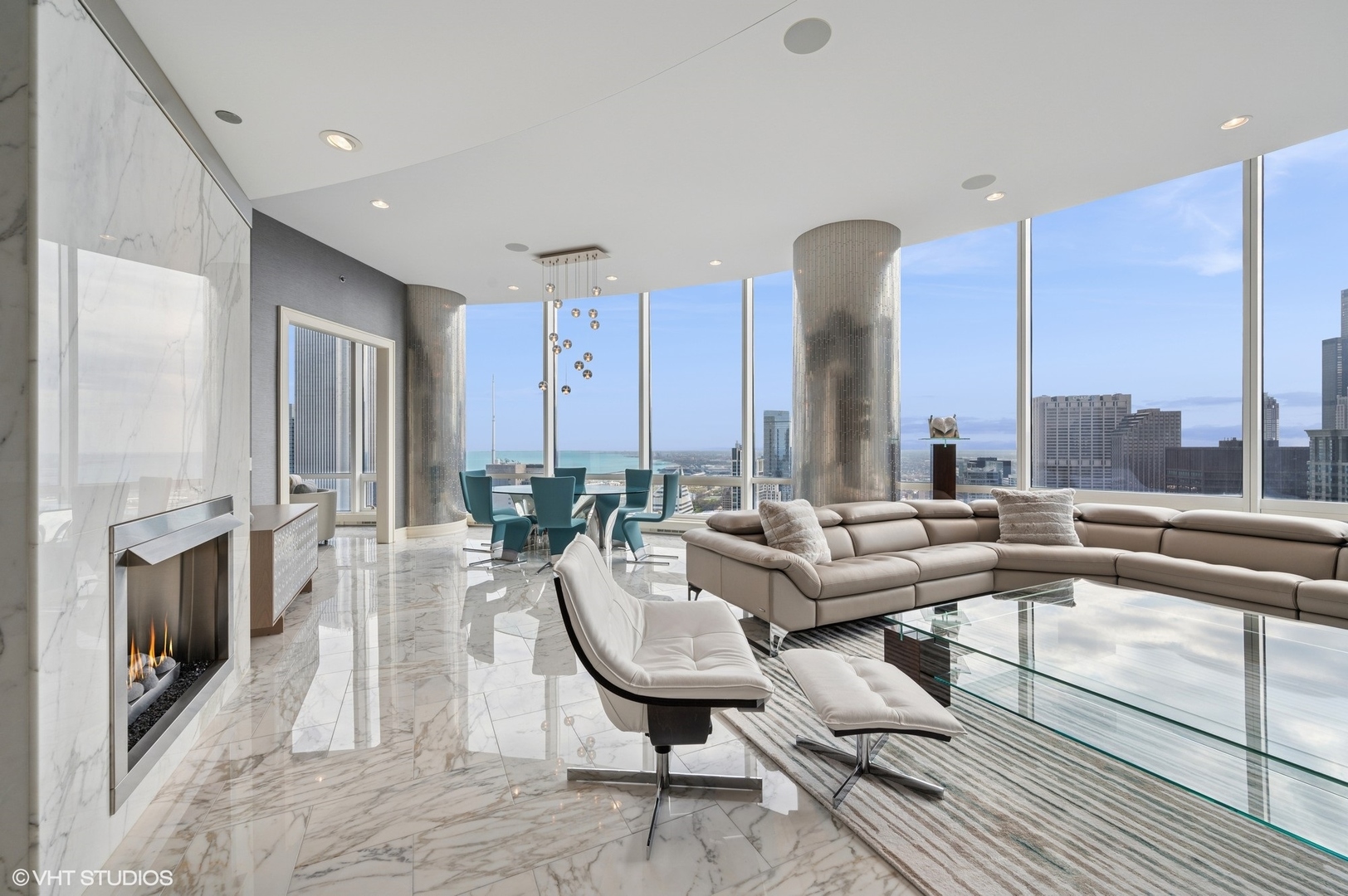 Once-in-a-Lifetime Opportunity at Trump Tower – Designed by Adrian Smith. Introducing Unit 49G, the only residence in the building offering this extraordinary combination of volume, custom finish, and jaw-dropping views. Spanning approximately 2,750 square feet, this fully remodeled home features soaring 12-foot ceilings-a rare architectural highlight that transforms the space and elevates the experience. From the moment you enter, you’re greeted by a dramatic sense of scale, light, and design rarely found anywhere in Chicago. This expansive 2-bedroom + large den, 3 full-bath layout showcases wraparound views of the Chicago River, Lake Michigan, and the skyline through sweeping floor-to-ceiling windows. The chef’s kitchen is centered around an oversized island and flows effortlessly into a spacious den-perfect for entertaining. Thoughtfully curated finishes include designer Calacatta Gold tile, wide-plank hardwood floors, two fireplaces, and a custom wine storage room. Every space has been designed with purpose, elegance, and comfort in mind. The primary suite is a luxurious retreat, offering dual walk-in closets, a spa-inspired bathroom with dual vanities, and extensive built-in storage. This residence also includes three parking spaces, one of which is a private garage that fits two cars (one inside, one just outside), and four oversized storage rooms, all professionally organized by Closet Works. Residents enjoy access to world-class amenities, including a state-of-the-art health club and spa, indoor pool, private dog walk, in-residence dining and room service, valet dry cleaning, bellman service, and 24-hour door staff. This is a truly rare opportunity to own a fully customized, irreplaceable home in one of Chicago’s most iconic and architecturally celebrated towers.