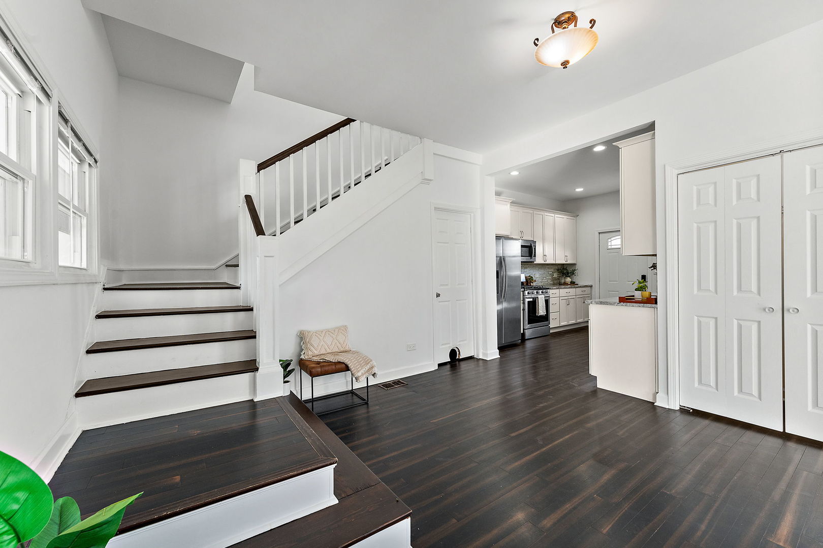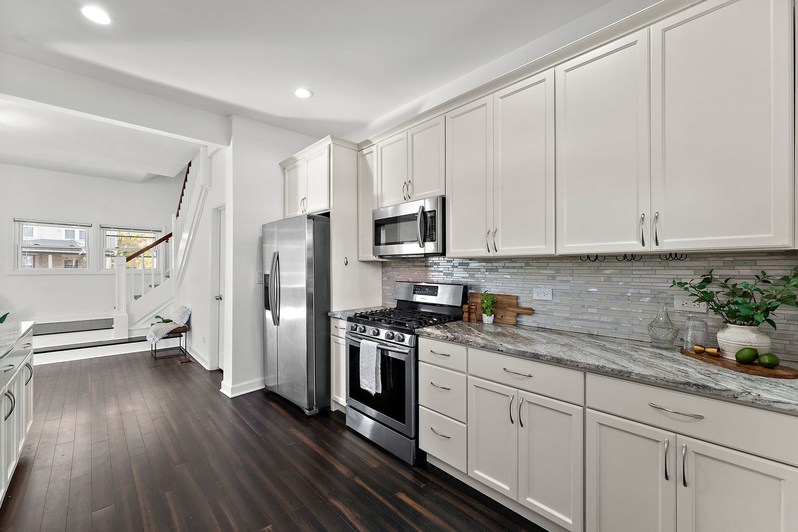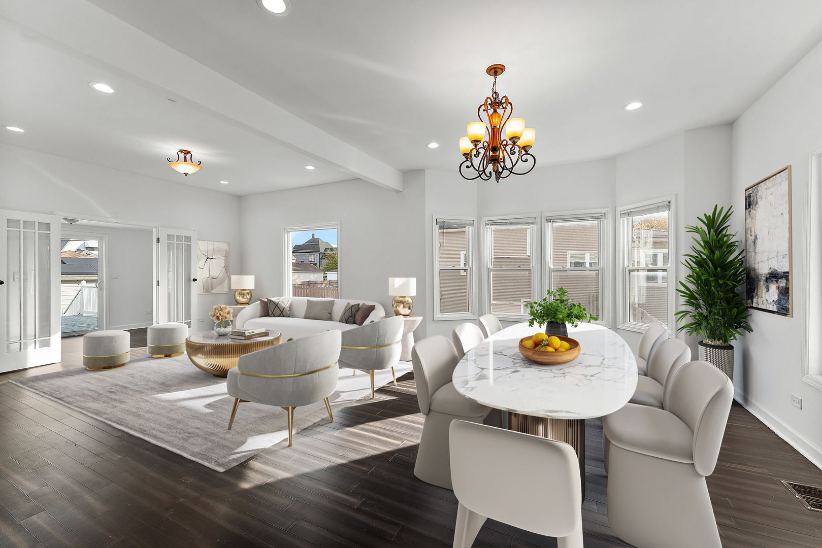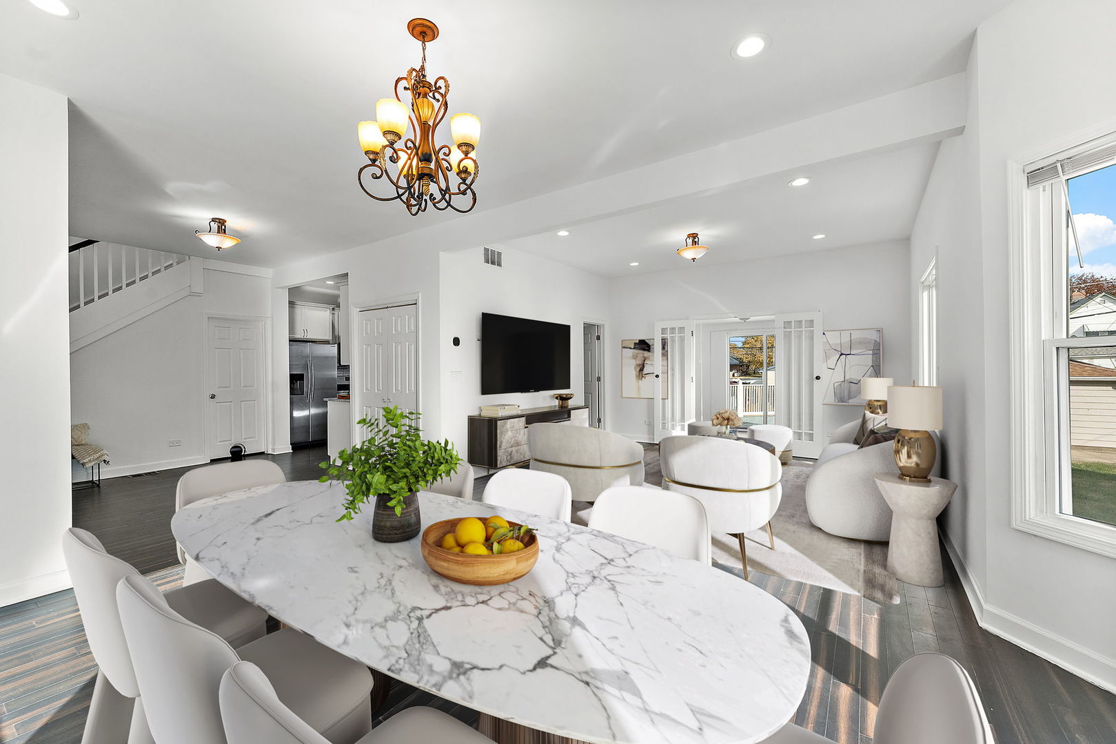 Step into the timeless elegance of this fully renovated 1908 three-story home, perfectly situated on a beautiful corner lot in Chicago’s historic western suburb, Maywood. Reimagined in 2019 with brand new everything, this residence blends the warmth of turn-of-the-century architecture with the sophistication of today’s high-end design. From the moment you arrive, the quaint covered porch invites you to slow down – the perfect spot for a morning coffee or a relaxing afternoon on your porch swing as sunlight filters through the trees. Inside, the home opens to soaring 10-foot ceilings and a bright, airy layout filled with character and light. The open staircase, adorned with its original vintage newel post details, sets a striking tone that blends history and craftsmanship. The spacious living and dining areas flow effortlessly together, anchored by a charming bay window dining nook that creates the perfect setting for intimate dinners or morning brunches bathed in natural light. The modern kitchen is a true showpiece – designed with stone countertops, sleek stainless steel Samsung appliances, a designer glass backsplash, and elegant 42″ cabinetry that adds height and drama to the space. Engineered bamboo floors stretch across the main level, complementing the home’s sophisticated palette and airy feel, along with a main floor bathroom with a step-in shower with custom tile surround. French doors greet you to the perfect main floor sunroom or office, that gives bright natural light through the sliding doors and access to your large back deck! Upstairs, 3 spacious bedrooms + an office space and a second bathroom has been meticulously appointed with fine tilework, charming vanity, and contemporary fixtures. The finished third story offers a sprawling fifth bedroom, creative studio, or private retreat – a cozy hideaway tucked above it all with lots of storage. Head down to the walkout basement, which is bright and spacious, and has been extended to a fully functional height. It features a fully waterproofed and reinforced foundation with a lifetime transferable warranty. Outside, the fully fenced yard and 2.5-car garage within the fence line offer privacy and convenience. A refinished front porch and back deck extend the living space outdoors, perfect for gatherings or quiet evenings under the stars. With a newer roof, windows, mechanicals, and systems throughout, every detail has been completed with care and craftsmanship. This home is a perfect balance of storybook charm and modern ease – a place where history meets harmony. With a straight shot down 290 to the city, you will enjoy the ideal suburban lifestyle with al of the amenities of beautiful Chicago at your fingertips!