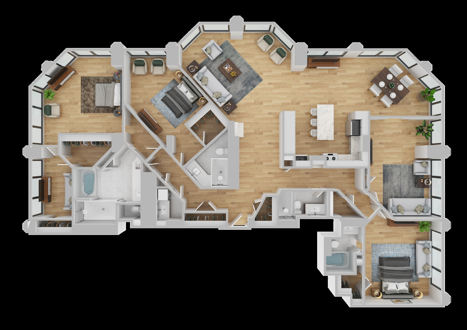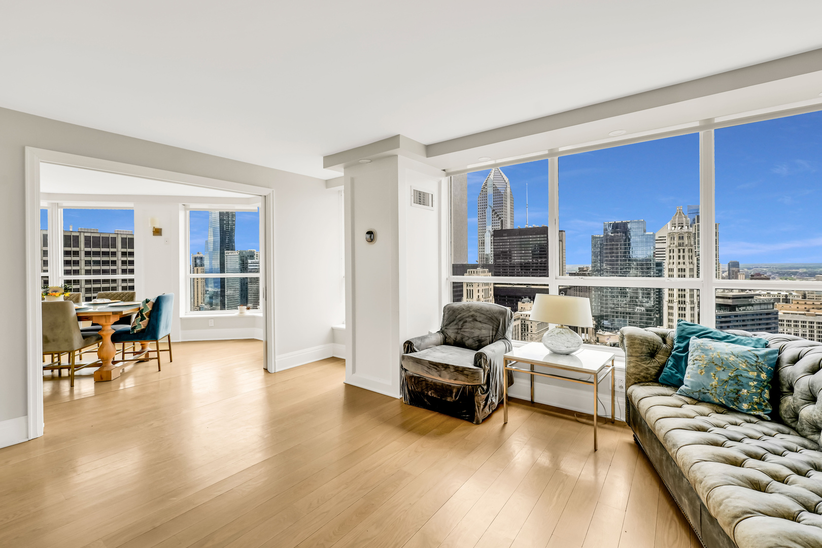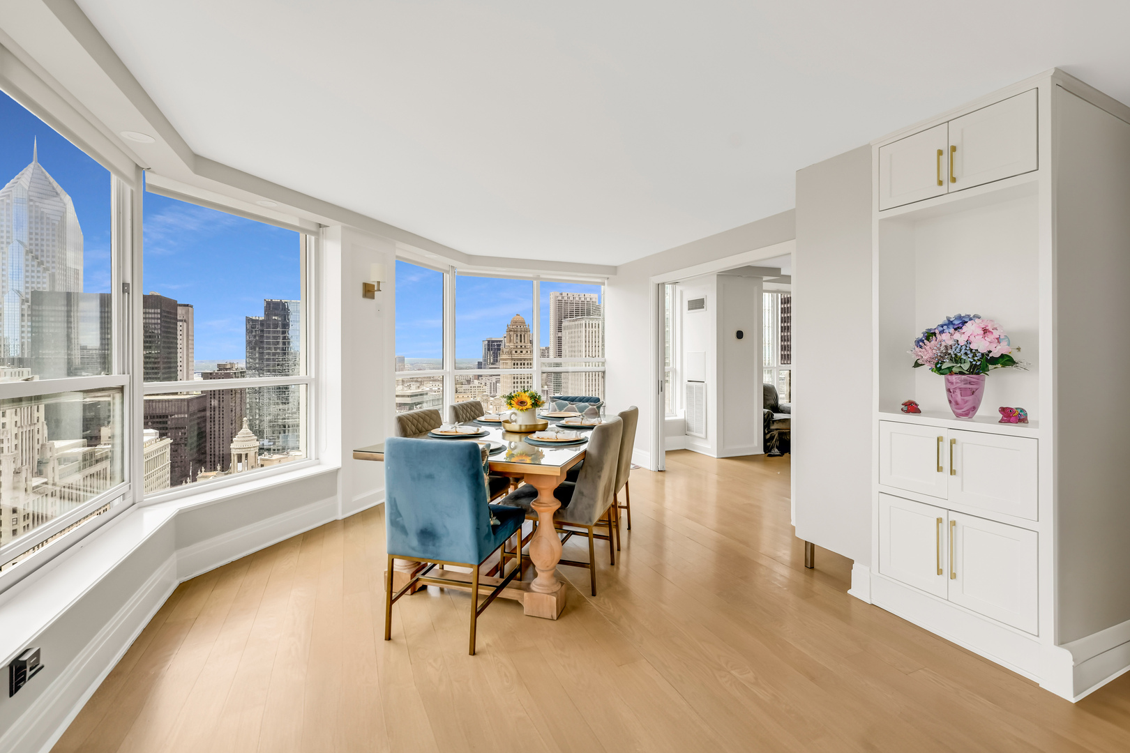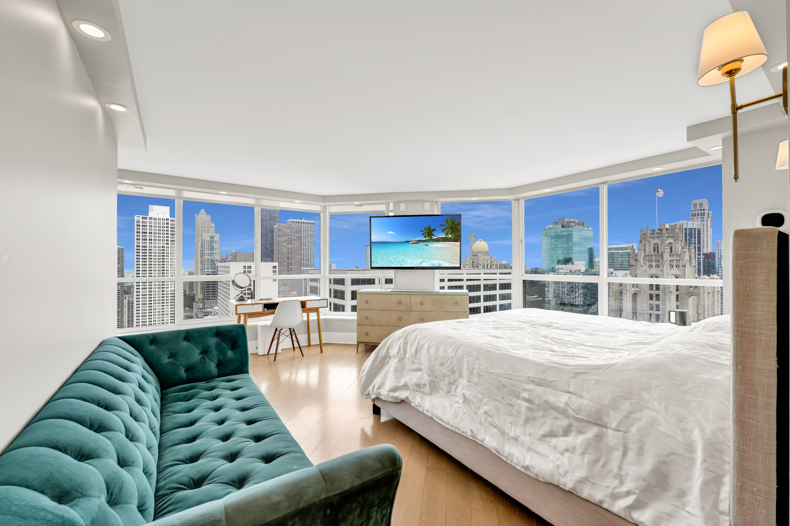 This extraordinary residence seamlessly combines multiple units into a single, stunning home, offering sweeping views from north to east to south, capturing the Chicago skyline, Lake Michigan, and the Chicago River. The home features 4 spacious bedrooms (3 ensuite) and 4 full baths, each equipped with high-end fixtures and wall-hung toilets. Upon entry, a grand foyer greets you, featuring ample space, an innovative 360-degree rotating shoe closet, and walls ideal for showcasing artwork. The north hallway leads to a custom coat closet, laundry room, the 2nd bedroom, and the remarkable 900 sqft Master Suite. The south hallway provides access to the 4th full bathroom, 3rd bedroom, and concludes with the sun-filled 4th ensuite bedroom. The home includes a custom insulated, cedar-lined wine closet for your extensive wine collection. The main living room, perfect for entertaining or relaxation, features a central coffee and wet bar with expansive east-facing windows framing stunning, unobstructed views of Chicago’s cityscape, lake, and river. The chef-inspired kitchen boasts a substantial island with seating, a prep sink, smart appliances, touch faucets, extensive storage, and inspiring sun filled Views facing East. Nearby, the dining room provides an intimate and sophisticated setting with picturesque southeast views. Indulge in the expansive Master Suite, a private sanctuary offering captivating north and east vistas, space for seating, and a desk area. Luxurious features include dual sinks, a separate water closet with a Toto wall-hung bidet toilet, a deep soaking air and light therapy tub, and a 40 sq ft walk-in STEAM shower with 4 functions. The master closet includes custom his-and-her sections, a 360-degree rotating shoe rack, and room for a home office or workout area. The 2nd bedroom provides an ensuite bathroom, large walk-in shower, Toto bidet toilet, custom cabinetry, and direct eastern views of the iconic Tribune building. The 3rd bedroom, currently a cozy TV room, boasts remarkable southern views, including the Chicago River and prominent architectural landmarks. The 4th ensuite bedroom enjoys abundant sunlight and southern exposure, with custom closets, a 360-degree rotating shoe rack, deep soaking air tub, custom lighting and captivating city and river views. Elegant 5″ wide plank WHITE OAK floors, Porcelanosa bathroom tiles, custom cabinets, quartz countertops, all new electric and plumbing complement this home. Sophisticated custom closets, including four 360-degree rotating shoe racks, and 120 smart-controlled LED recessed lights throughout, enhance convenience and comfort. The residence is fully wired for ethernet and centralized smart home connectivity. Enjoy panoramic views of iconic Art Deco buildings such as the Tribune Tower, Wrigley Building, Jewelers Building, and London Guarantee Building, all easily visible from your windows. Ideally located near Michigan Ave shopping, Northbridge Mall, and the Apple Store-truly a must-see property. River Plaza is a full-amenity building offering exceptional conveniences, 24-hour door staff, on-site management and maintenance, a fitness center, indoor pool, hot tub, sun deck, package room, hospitality room, and an on-site laundry. Ideally situated, you will appreciate the building’s prime location within walking distance to the Chicago River, Lake Michigan, the Magnificent Mile, premier dining, high-end shopping, and an array of vibrant attractions. RARE BONUS OPPORTUNITY: Purchase the highly upgraded adjacent Jr. 1-bedroom unit-perfect as a guest suite or investment property to offset your living expenses. This unit features high-end finishes throughout, a beautifully updated bathroom with a luxurious walk-in shower, and a modern kitchen boasting stunning southern views. Currently rented for $2100 and will offset your monthly overhead making this a unique setup.