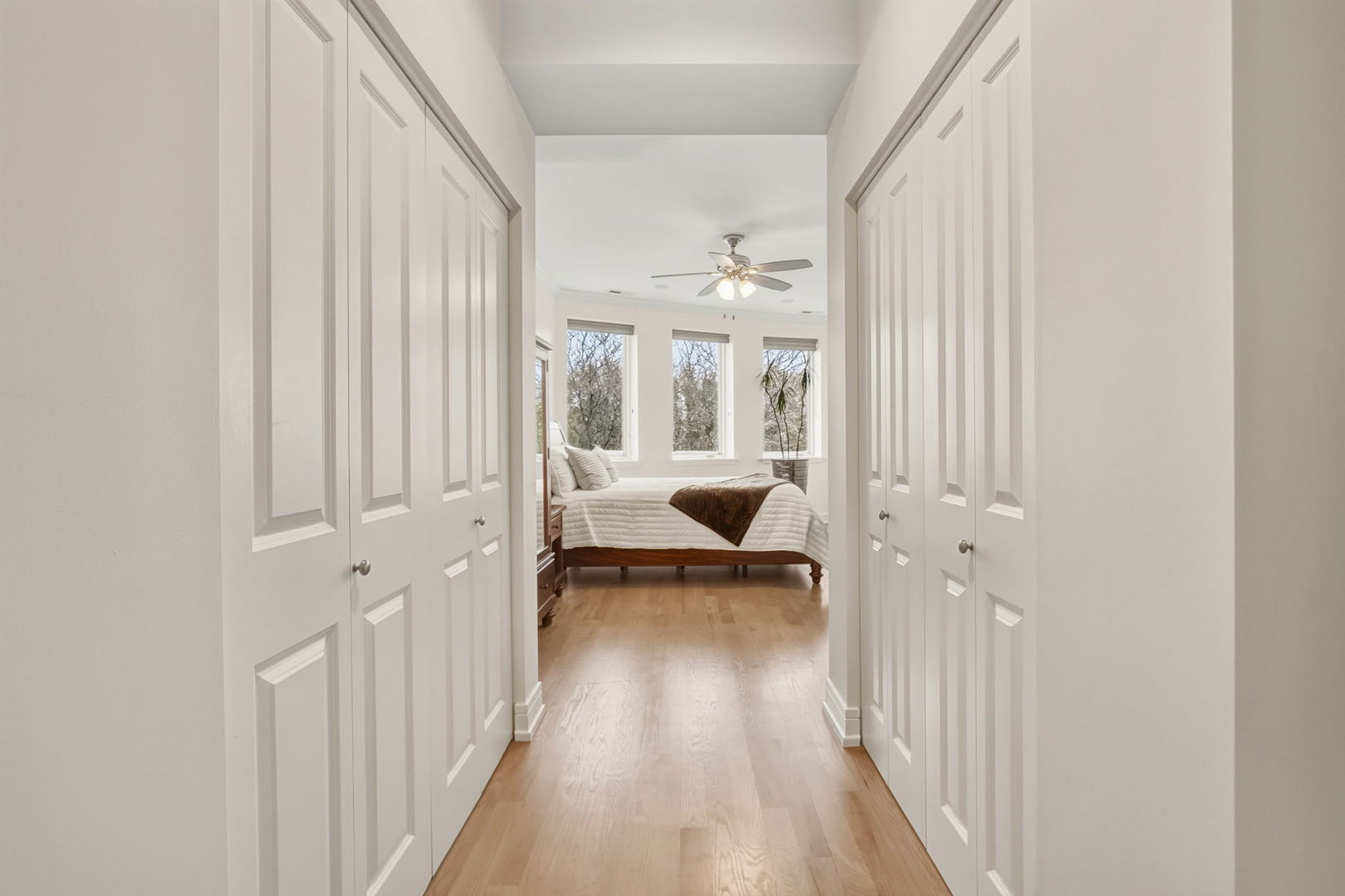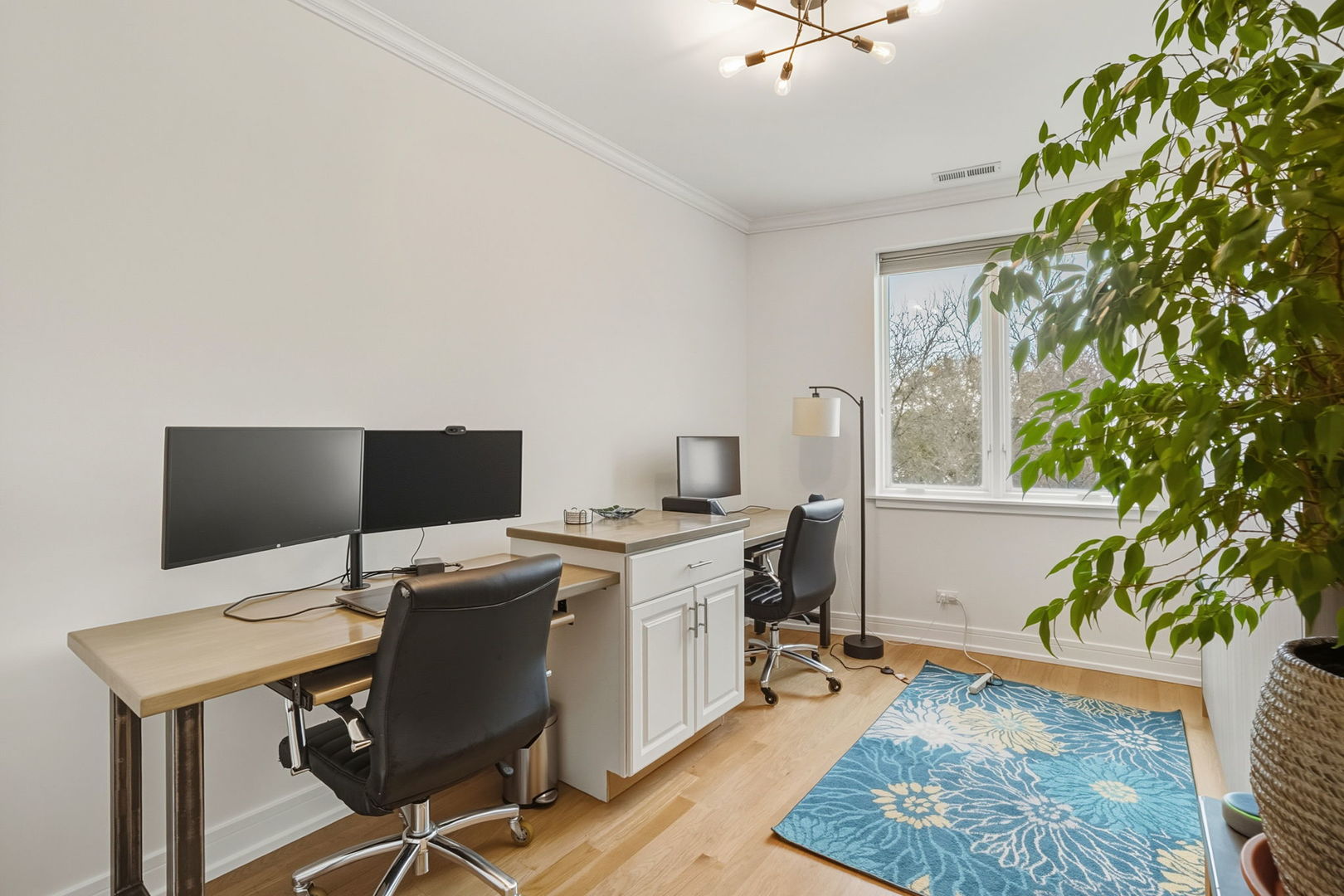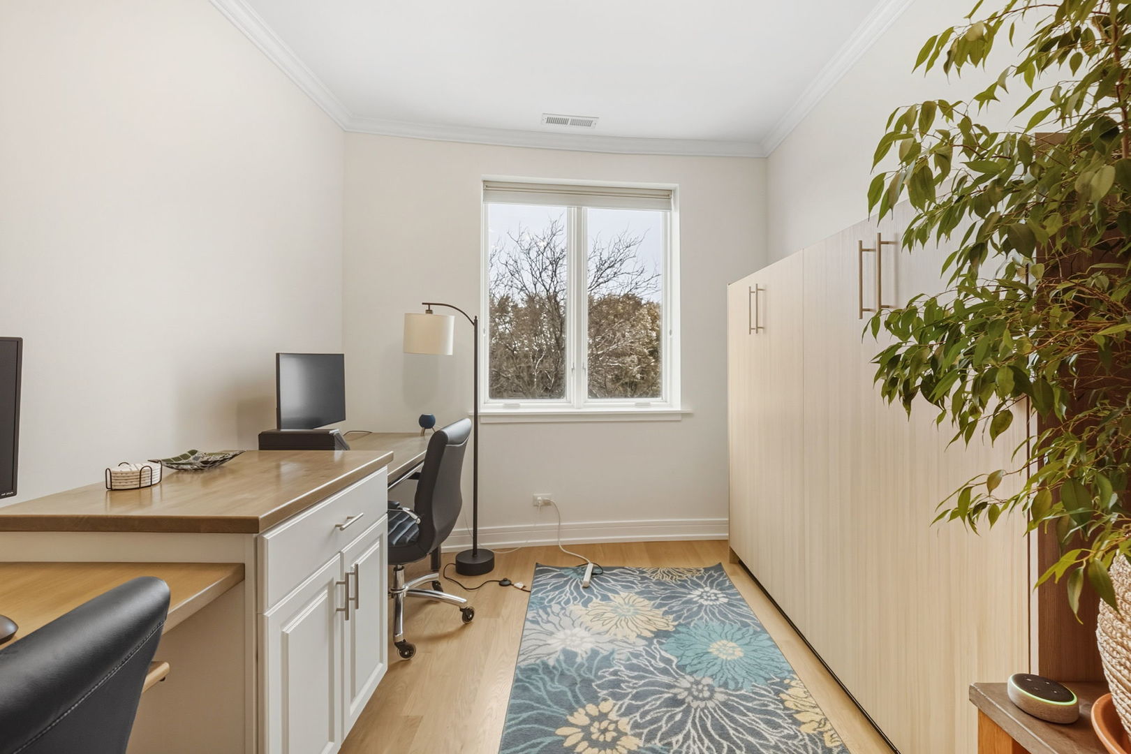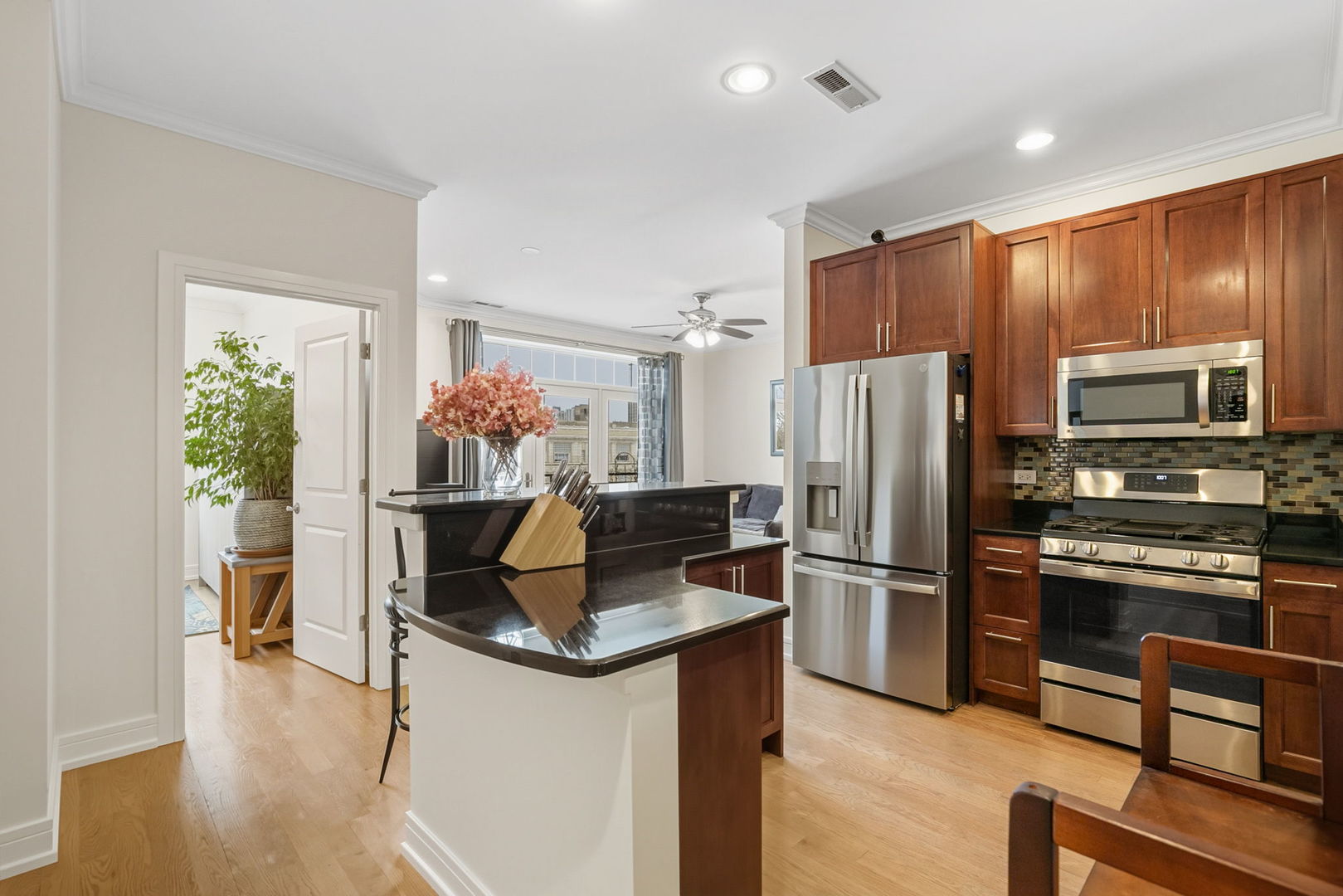 Welcome to this beautifully appointed TOP FLOOR 2-bedroom, 2-bath condo overlooking scenic Buena Circle Park. The home features elegant hardwood flooring throughout and a bright living room with glass doors, a large transom window, a cozy fireplace, and access to a private balcony-perfect for relaxing or entertaining. The modern kitchen boasts a spacious island, breakfast bar, and stainless steel appliances. The primary bedroom offers generous closet space and an ensuite bath with a double vanity, while the second bedroom-complete with a convenient Murphy bed-provides exceptional flexibility for guests, a home office, or a creative workspace. A second full bath ensures comfort and convenience. Additional features include in-unit laundry and a deeded parking space in a heated garage. Every window offers tranquil park views, and the location provides easy access to the Red Line, multiple bus routes, the Lakefront Trail, and the nearby dog park. Recent improvements include crown molding, dimmer switches, and wiring for whole-home audio and ethernet-adding both style and functionality to this inviting home.