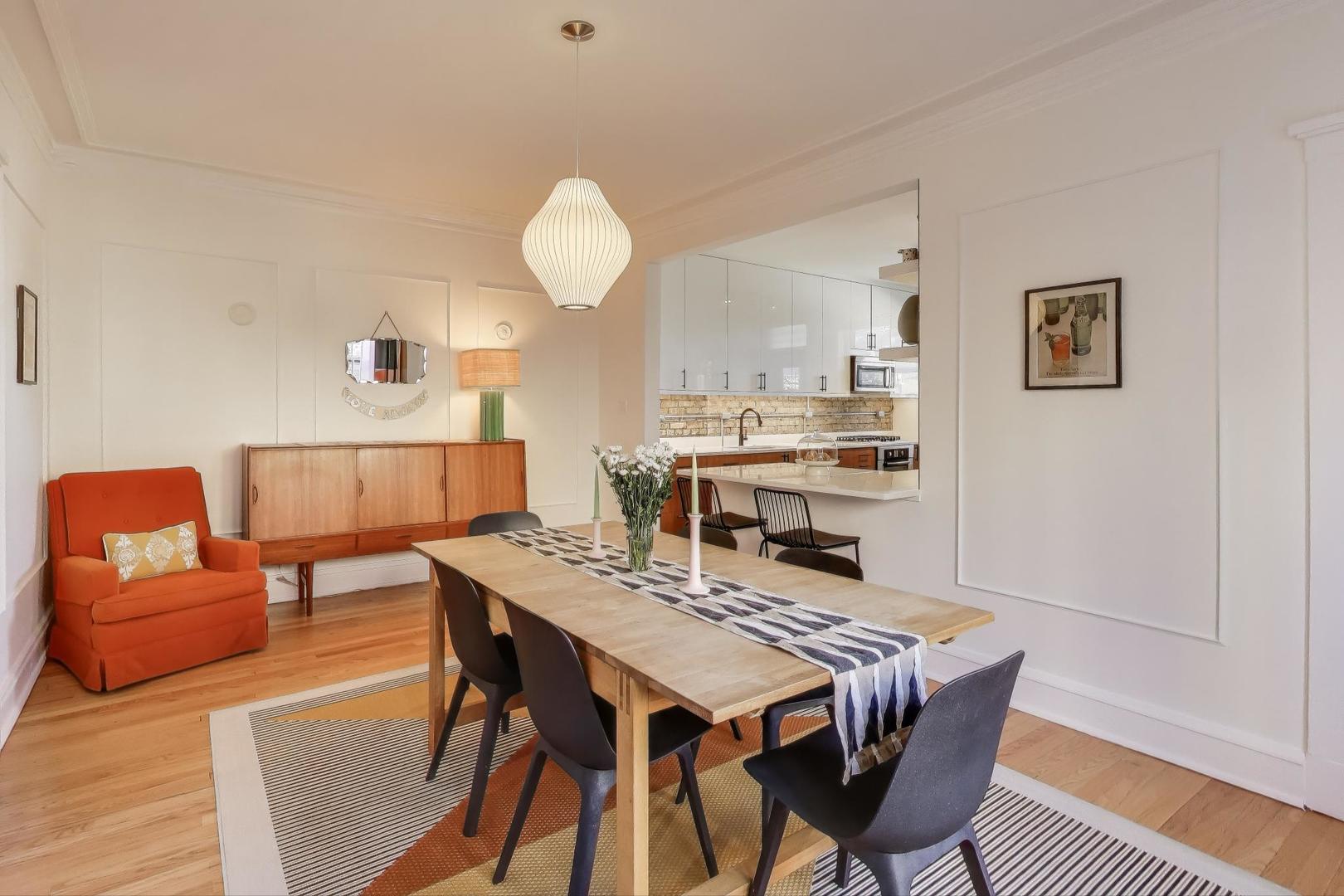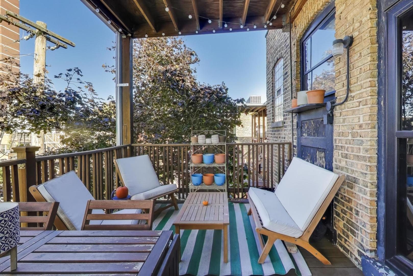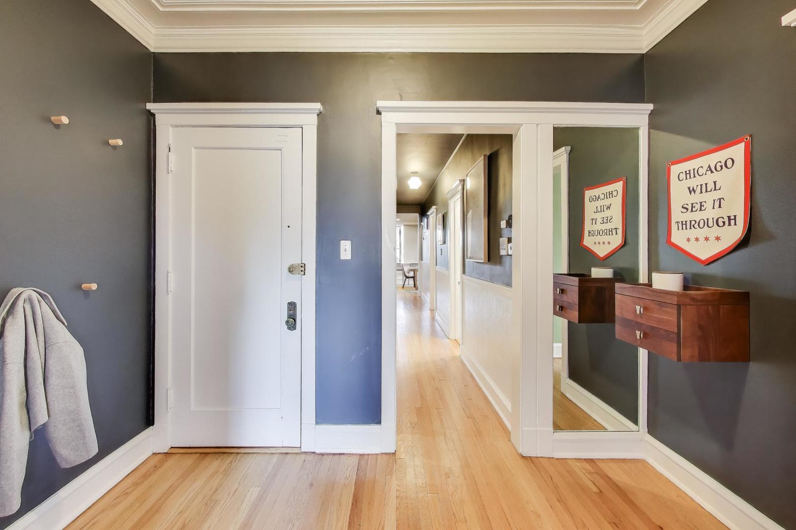 Modern Comforts meets Classic Charm. Nestled in the heart of Buena Park, this bright and spacious top-floor home blends vintage character with thoughtful modern updates. The open-concept kitchen (remodeled 2022) flows seamlessly into the dining area, featuring custom cabinetry, new flooring, and premium appliances including a Samsung refrigerator, Bosch dishwasher, LG washer/dryer, and disposal. A newly added laundry room with ample storage enhances everyday convenience. Recent upgrades include SpacePak central air (2024), re-tiled sunroom (2024), new closet doors in the primary (2025), utility closet shelving (2023), and electric installed over the fireplace (2025). The building is impeccably maintained with major projects completed: roof (2022), boiler (2024), water heater (2025), tuckpointing (2024), and deck staining/reinforcement (2024). Experience the best of Buena Park-tree-lined streets, easy lakefront and Lake Shore Drive access, and proximity to shops, dining, and transportation, all from a home that’s been lovingly cared for and move-in ready. Free street parking in the neighborhood, and several rented parking options around within a block or two.