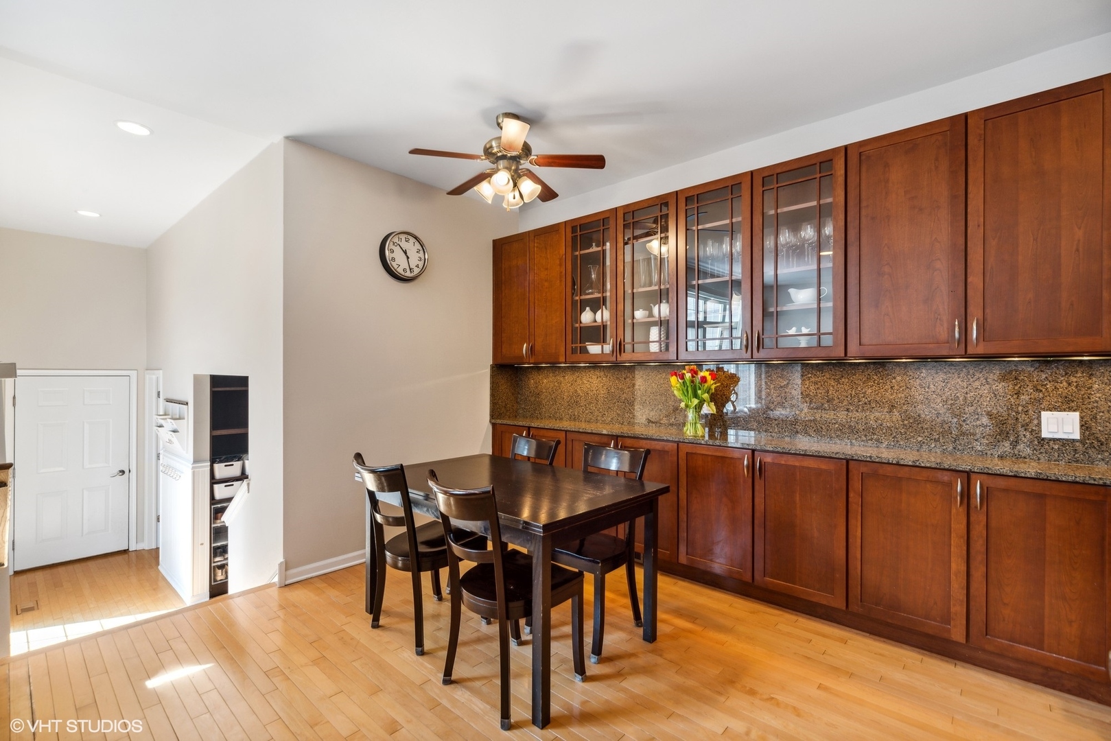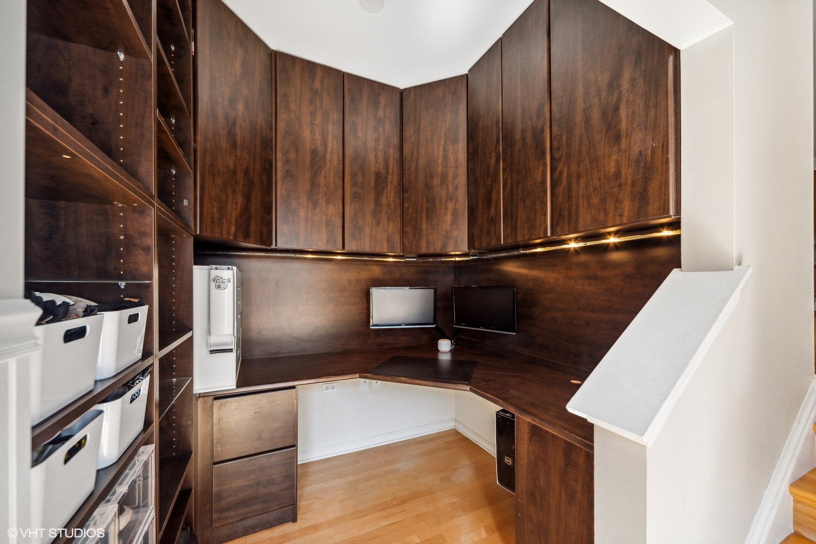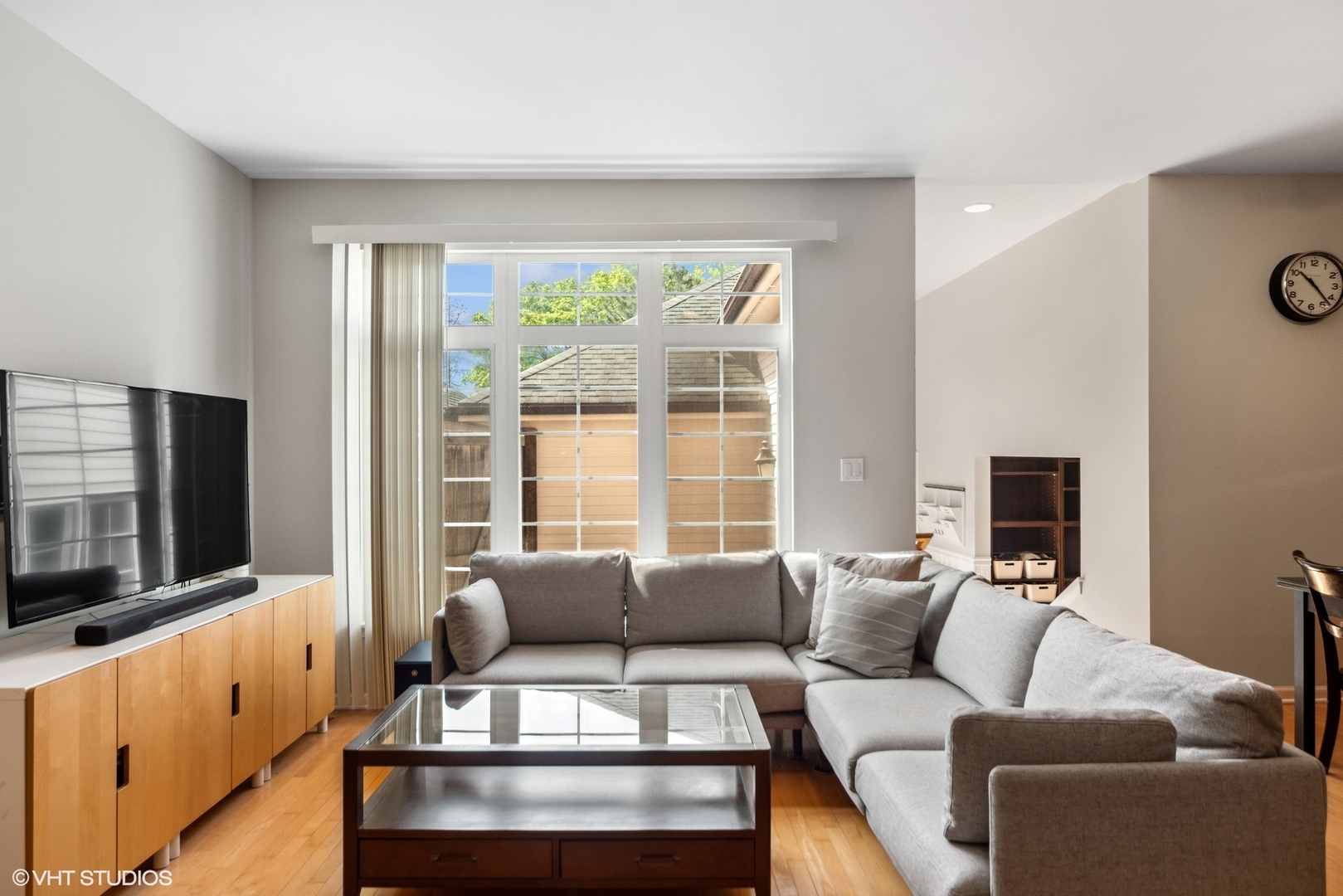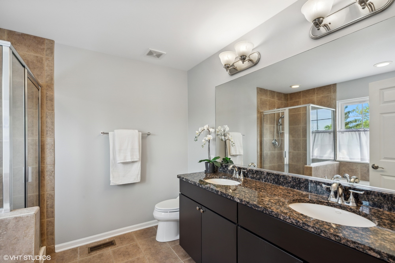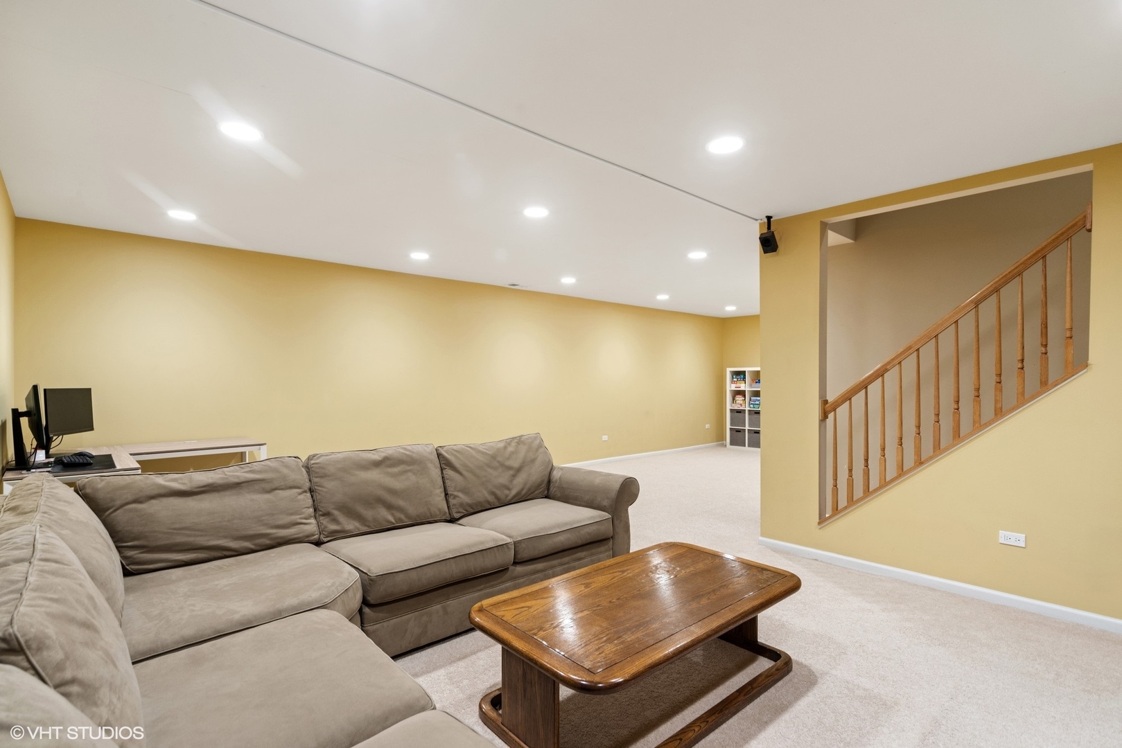 Welcome to a home that balances modern functionality with timeless sophistication. The main level flows seamlessly through sunlit spaces adorned with rich hardwood flooring, beginning with an inviting foyer that opens into a gracious living room featuring a see-through granite-surround fireplace and a sleek wet bar with wine storage-perfect for evening gatherings. The dining room transitions effortlessly to the chef’s kitchen appointed with granite countertops, under-cabinet lighting, and a full suite of stainless-steel appliances including an LG refrigerator (2024), KitchenAid oven and cooktop, Samsung microwave, and KitchenAid dishwasher (2020). A central island with seating for three anchors the space, complemented by an adjoining eating area and a cozy family room with recessed lighting for relaxed entertaining. A built-in office nook provides a much sought after secluded workspace, while a powder room with a neutral vanity and Kohler fixtures completes this level. Upstairs, the primary suite is a serene retreat boasting hardwood floors, a spacious walk-in closet with custom organizers, and a spa-like bath with dual granite-topped vanities, a whirlpool tub, and a separate shower. Two additional bedrooms, each with double closets and ceiling fans, share a beautifully appointed hall bath with granite finishes. The conveniently located 2nd floor laundry room is equipped with an LG washer (2022), LG dryer (2025), and built-in storage. The finished lower level extends the living space with a large recreation room, an additional bedroom, a walk-in closet, and a full bath with ceramic tile surround. Outdoor living shines with a brick paver patio accessed via a sliding glass door from the mudroom nook, surrounded by landscaped grounds ideal for entertaining. Additional highlights include a two-car heated garage, Carrier furnace, AO Smith 75-gallon water heater (2018), sump pump with battery backup, and Hunter Douglas blinds in the bedrooms. A polished blend of comfort, style, and craftsmanship-this home effortlessly captures the art of maintenance free living.