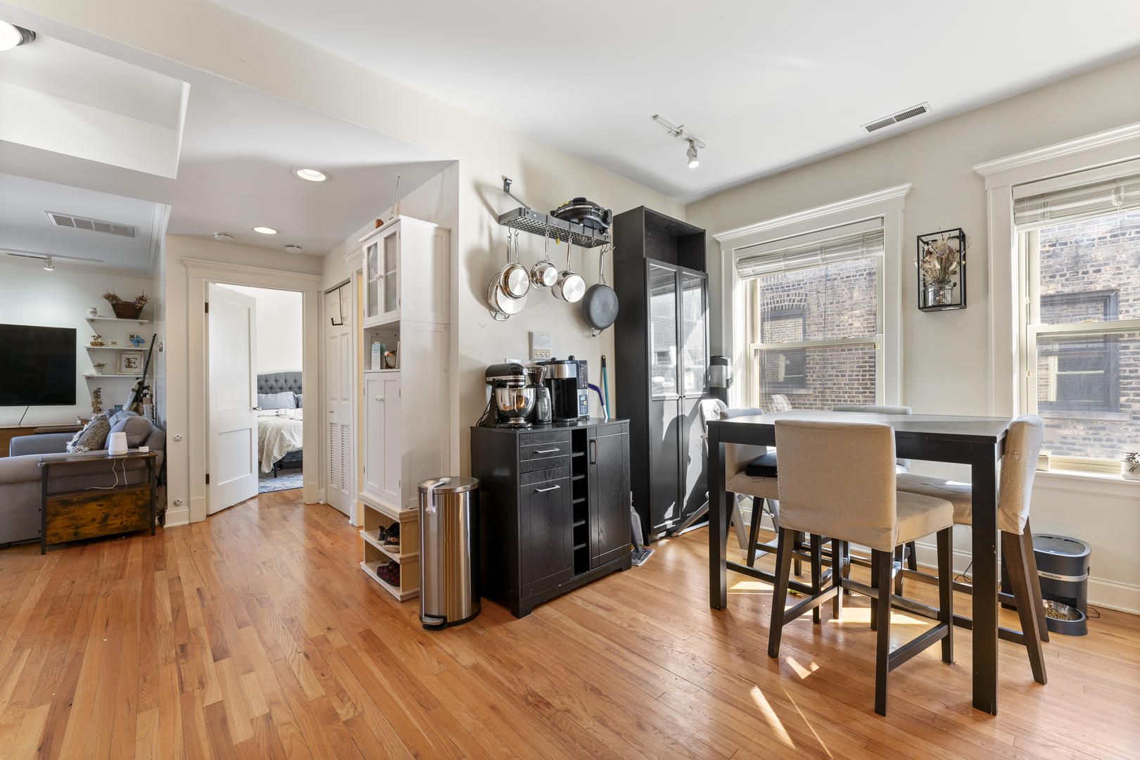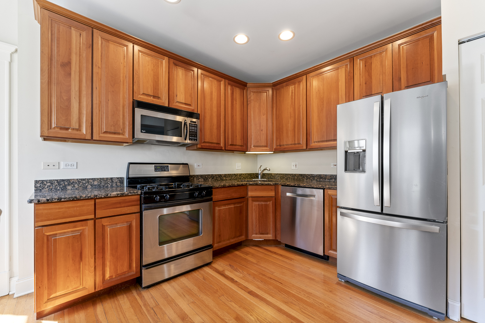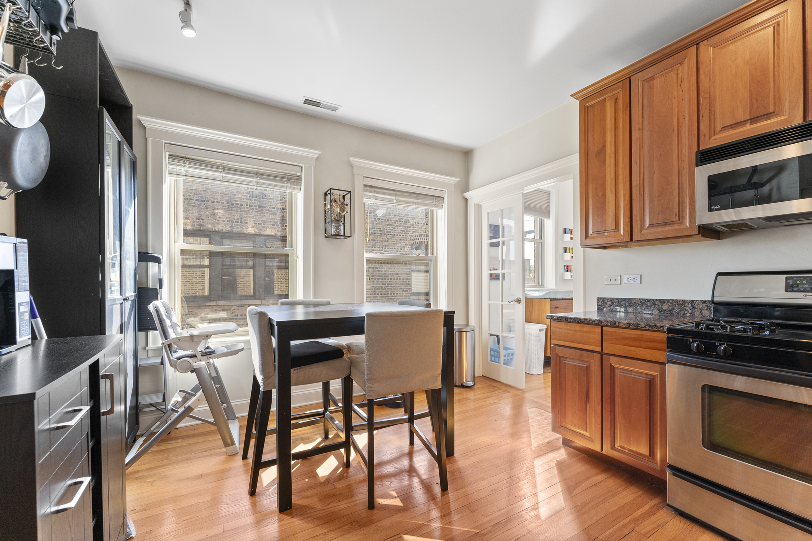Bright and beautifully updated top-floor 2-bedroom, 1-bath condo in the heart of Ravenswood/North Center. The open-concept layout features cherry cabinetry, granite countertops, and new stainless steel appliances including a Whirlpool refrigerator (2022) and Bosch 800 Series dishwasher (2023). The spacious dining area opens into a sun-filled living room with crown molding and hardwood floors throughout. The second bedroom with French doors is perfect for a home office or guest room and opens to a deck. Enjoy in-unit laundry, a Nest smart thermostat, and a new HVAC system installed in 2023 for peace of mind. Four exposures fill the home with natural light, and the full-size basement storage unit with custom shelving provides extra space. Easy street parking and an unbeatable location close to the Brown Line, Spacca Napoli, Bien Me Sabe, Small Cheval, and Dovetail Brewery. Low HOA, pet-friendly building, and truly move-in ready.