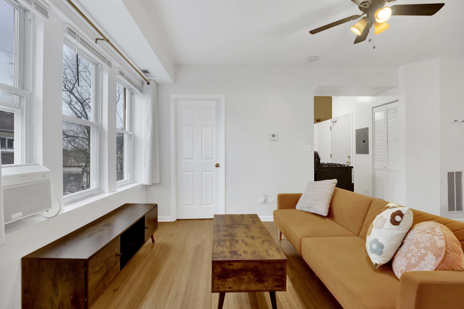 This charming top-floor one-bedroom condo is located in a secure, gated building offering some of the lowest property taxes and monthly assessments in the city-an exceptional value for both owner-occupants and investors. With no rental restrictions, this unit presents a strong opportunity for long-term or rental income. Situated on the top floor, the home offers added privacy and quiet living with no neighbors above. The pet-friendly building welcomes animal lovers and features a peaceful interior courtyard, providing a rare outdoor retreat in an urban setting. Inside, the unit is filled with natural light and showcases hardwood floors throughout along with fresh, neutral paint. The kitchen is fully equipped with stainless steel appliances, offering both style and functionality. Additional highlights include in-building laundry, generous closet space, and oversized basement storage. Ample street parking is available, and the location is exceptionally convenient-just steps from bus routes with easy access to the Blue, Brown, and Red Line CTA trains. The low monthly assessment includes water, common-area insurance, lawn care, trash service, and snow removal, making for easy, low-maintenance living. All of this at an affordable price point makes this home a standout opportunity.