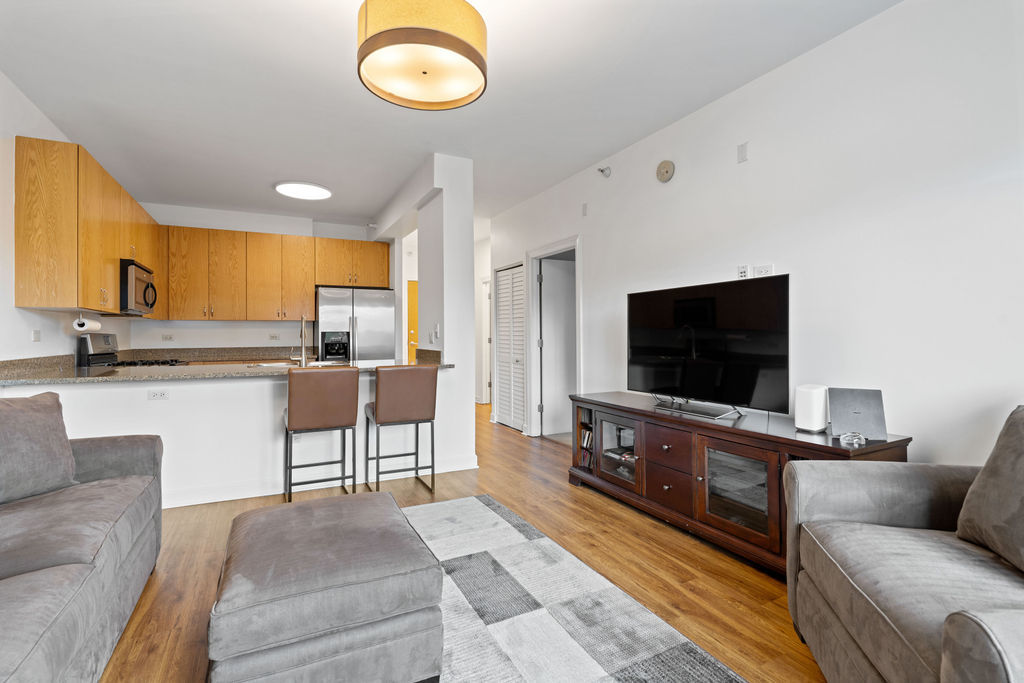 Amazing Large 1 bedroom, 1 bath condo in the perfect pocket of River North with tons of natural light. This home offers an open floor plan with a Chef’s kitchen granite countertop, breakfast bar seating, stainless steel appliances, an abundance of cabinetry storage. A large living room and private balcony makes for the perfect entertaining space with new custom Hunter Douglas Silhouette blinds on sliding glass door. The bedroom is massive with an incredible walk in closet and plantation shutters. A convenient oversize hall bath offers a dual sink vanity, jacuzzi tub, and separate shower. In-unit laundry, and a huge entry walk-in closet that can be converted into a home office. This building is a 4-pipe building so you can control the temperature (heat & air) in your unit. This impressive full-amenity building offers 24-hour door staff, fitness center, on-site manager, storage lockers, and Pressbox laundry pick up onsite. The assessment also include cable, internet, gas, and heat. Located only a short walk to Montgomery Park, River Walk, Larrabee Dog Park, and easy access to public transportation, all the incredible shops, restaurants, and nightlife that River North has to offer! 1-parking spot for $25,000 #120 on the 4th floor.