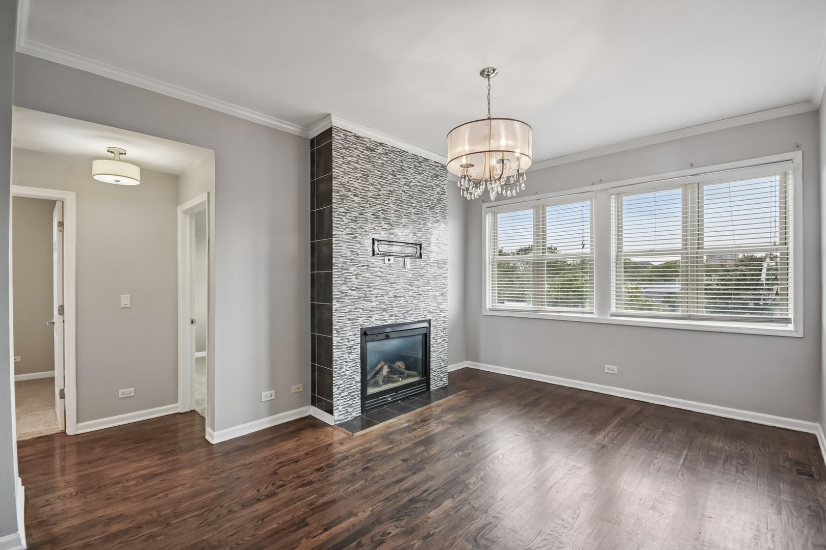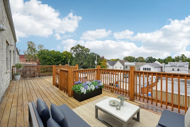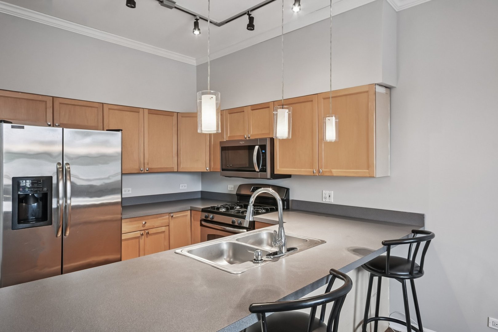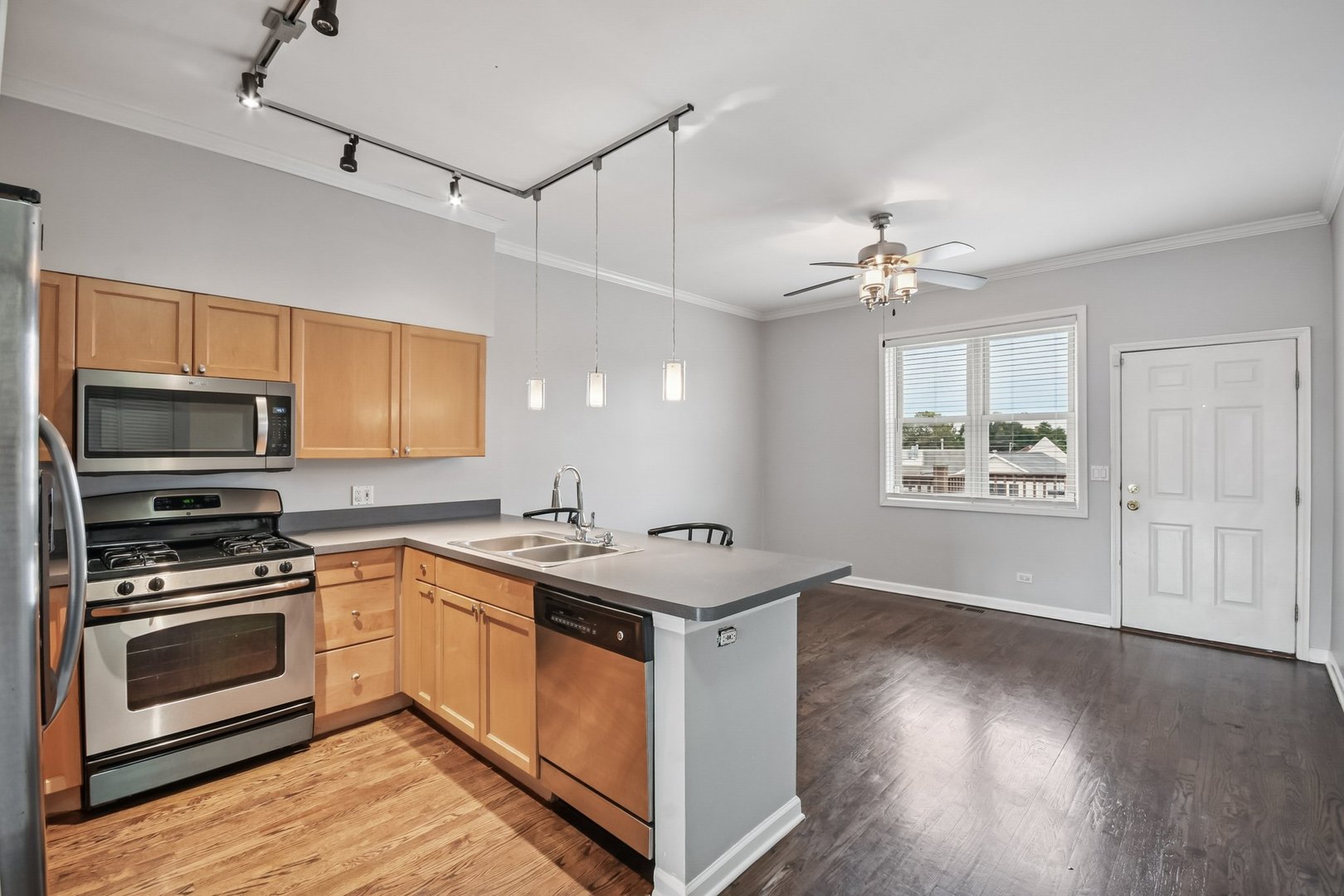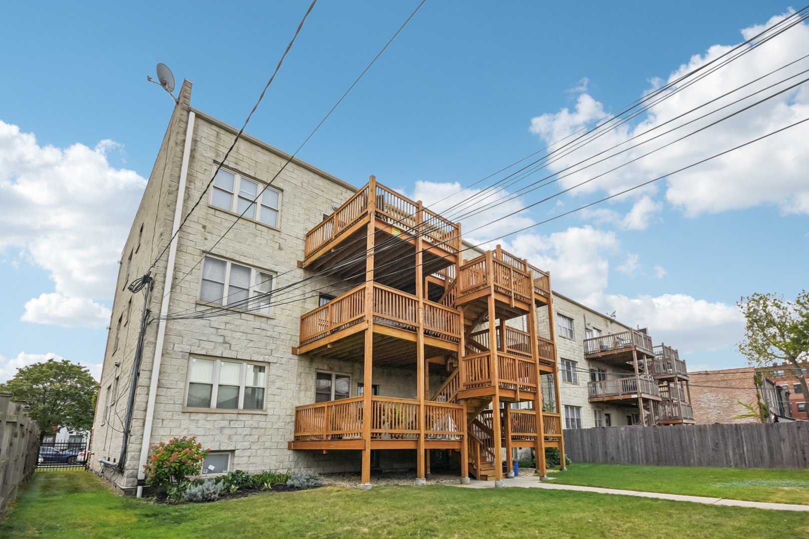 Location, location, location! This airy, sun-drenched top-floor 3BR/2BA condo with soaring ceilings is perfectly situated in North Kenwood. Bright and spacious living room features a stunning floor-to-ceiling stone fireplace and flows seamlessly into the dining area, creating an ideal space for entertaining. The large kitchen offers a peninsula with breakfast bar, stainless steel appliances and additional space for a table or sitting area. The primary suite includes dual closets and a private ensuite with a relaxing soaking tub. Two additional bedrooms share a well-appointed hall bath. Step outside to your expansive private deck-fully rebuilt in 2024-or enjoy the shared common yard. Additional features include one detached garage space, a large private storage room in the basement and gated front entry. The building completed staircase repairs in 2024. Unbeatable location – just two blocks from Lake Shore Drive, the lake front, 47th Street Metra & multiple bus lines. Enjoy the convenience of being minutes to grocery stores, dry cleaners, shopping, fitness centers and restaurants!