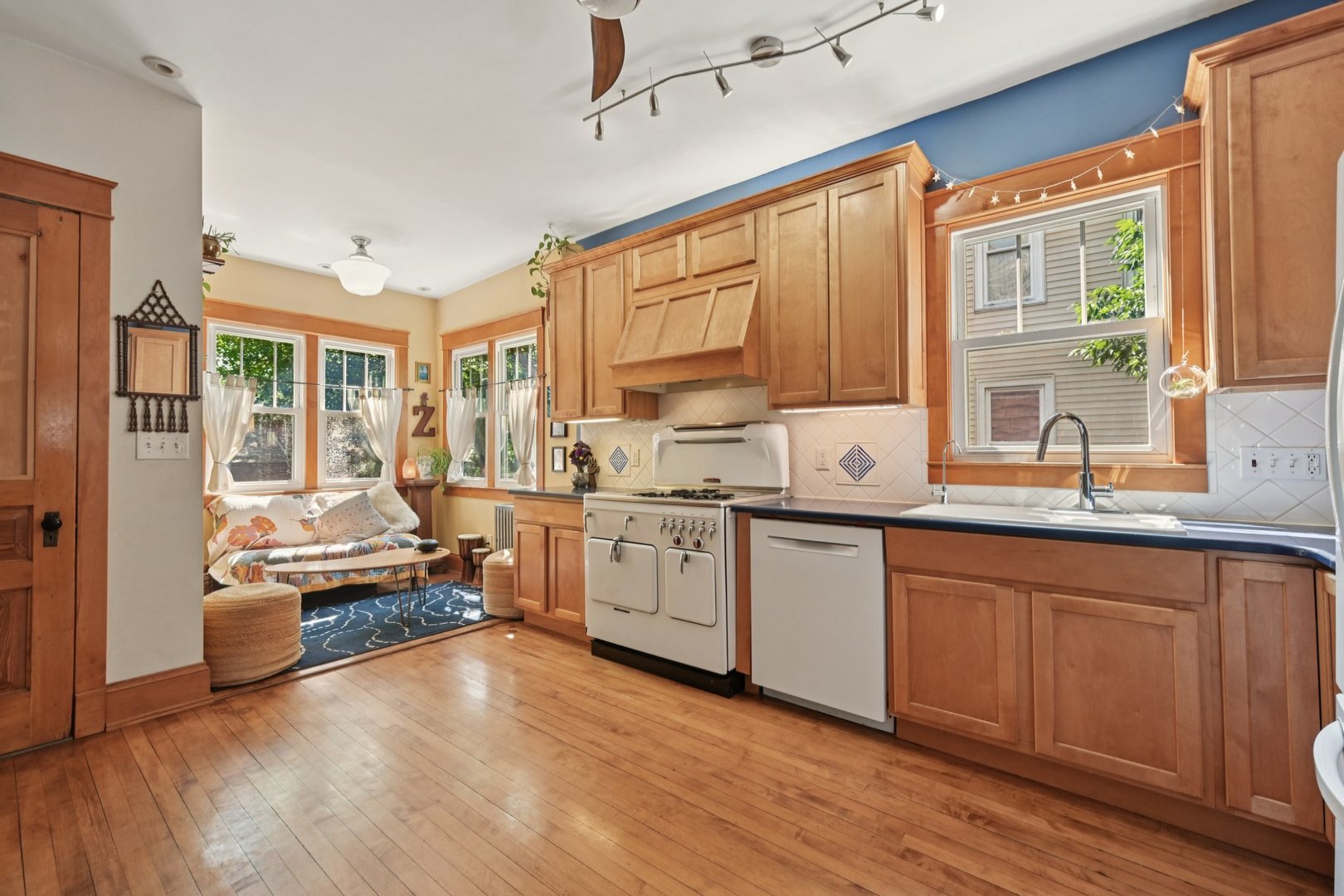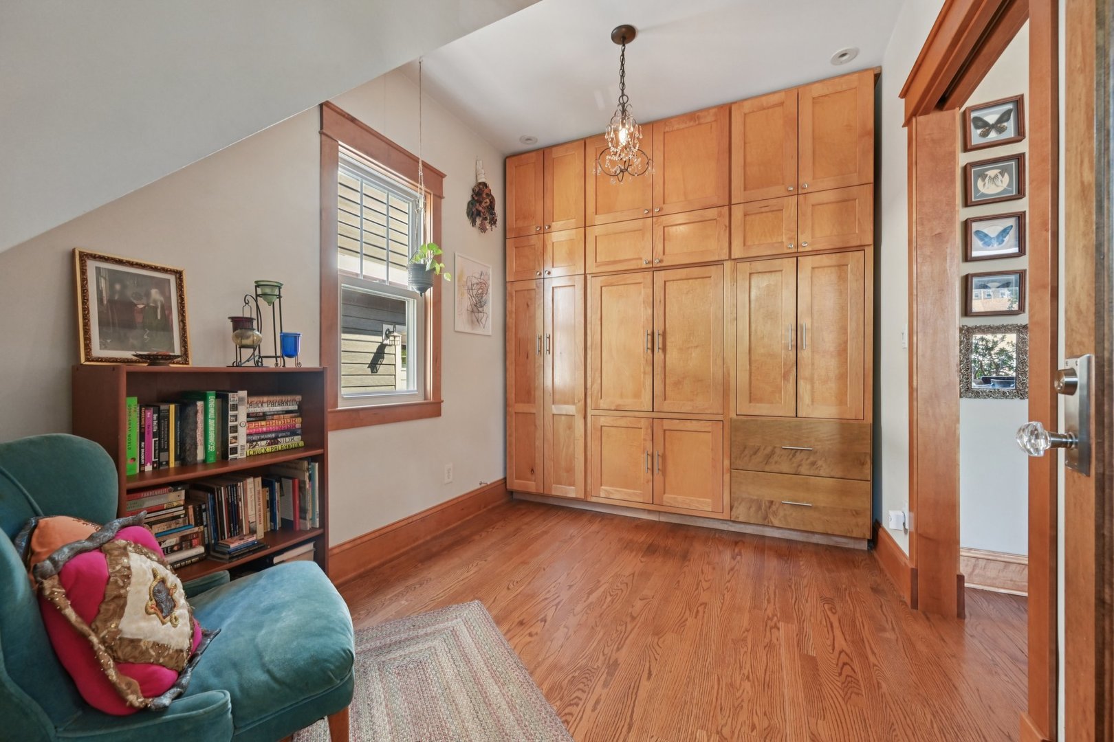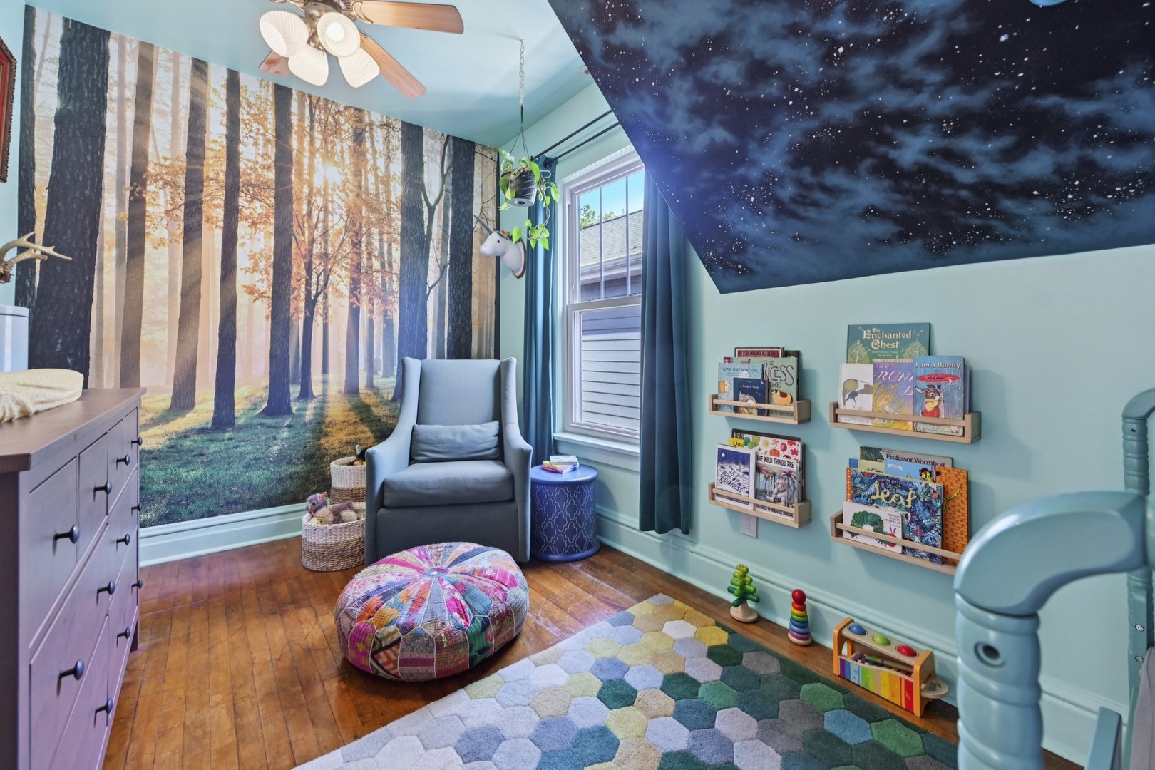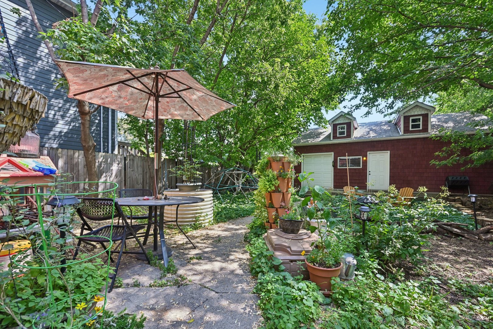 Charming 3-Bed, 3-Bath Vintage Farmhouse with Modern Updates! This beautifully updated vintage farmhouse blends original charm with modern comfort. From its inviting front porch and blooming lilac bushes to its light-filled interior, this home is full of character and warmth. Step into a spacious entryway with built-in storage, a cozy sitting area, and hardwood floors that run throughout. The flexible front room can serve as a dining or living space and flows into a large kitchen featuring a breakfast nook, ample cabinetry, and a vintage stove. The nook overlooks a serene, wooded backyard oasis. The main floor also includes a generously sized bedroom and an updated full bath. Upstairs, enjoy bonus living space with a sunroom/office, sitting area, two large bedrooms, and a second updated bath. The nursery shines with a hand-painted mural with glow-in-the-dark stars. The finished basement offers even more living space with a large rec room, office, updated spa-like bath, and laundry area. Outdoors, the oversized, private backyard is a nature lover’s dream-filled with mature trees, edible berry trees (serviceberry & mulberry), wild violet ground cover (no mowing needed), custom garden beds, and a chicken coop. A 3-car detached garage and gated parking pad complete the package. Recent updates: New AC (2017), appliances (2018), washer/dryer (2025), and more (see broker remarks). Ideally located near multiple parks, North Branch Trail, CTA Blue & Brown lines, I-94, groceries, and restaurants-this city homestead offers the best of both worlds!