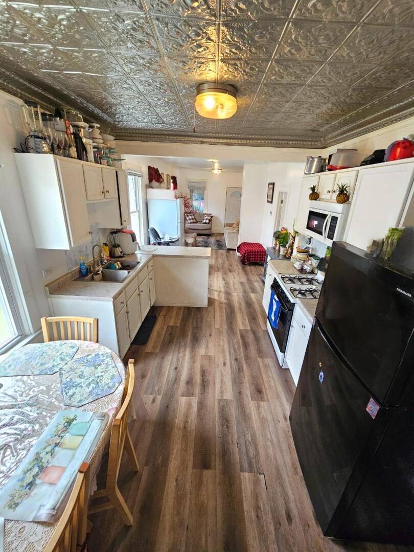 Charming Joliet gem! This inviting home welcomes you into a fully enclosed front porch, it offers 4 bedrooms, 1 bath, gorgeous artisan tin ceiling tile in the kitchen/dining room area, lots of lighting throughout, full walkout basement with lots of room for storage and large fenced in yard, with a detached 2-car garage accessible from the alley with plenty of space for parking on the driveway or the street. Home was remodeled and updated in the last few years and it’s ready for you to move in. Great location close to everything, schools, parks, downtown, stores, expressways, etc. Come see it today! Sellers prefer to sell as-is.