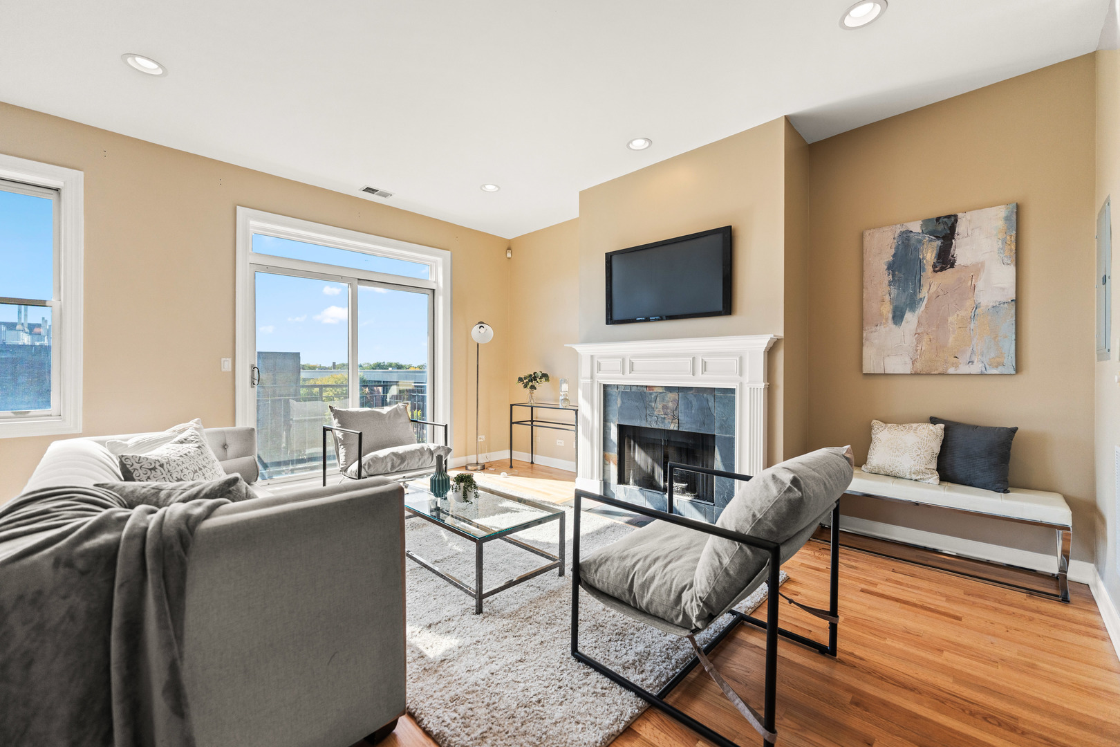 This spacious 2 bed, 2 bath penthouse condo in an elevator building offers an impressive urban retreat with 10-foot ceilings and sunlit south-facing views. The open-concept living and dining area boasts a fireplace and hardwood floors, seamlessly connecting to a private balcony ideal for grilling and relaxation. The kitchen features stainless steel appliances and a large peninsula. The expansive primary bedroom includes a sitting area and luxurious en suite with a double vanity, soaking tub, and separate walk-in shower. Additional amenities include in-unit laundry and heated indoor parking. Residents can also enjoy a common rooftop deck with stunning views. Conveniently located with easy access to shopping, dining, parks, the CTA Wilson Red Line L Stop, and just a short distance from Montrose Beach.