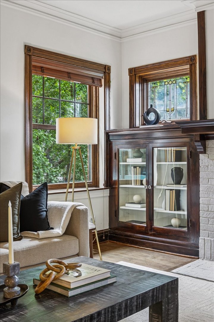 Celebrate the holidays in a new home! Discover this exceptional vintage condo, ideally set on one of Uptown/Sheridan Park’s most picturesque streets! Built in 1912, this architectural gem sits on an expansive 50′ x 155′ lot, offering approximately 2,100 square feet of single-level living with 3 bedrooms, a den / 4th bedroom, and a sunroom. Freshly updated and move-in ready, the home boasts a flowing floor plan with oversized rooms-ideal for both everyday living and grand entertaining. From the moment you arrive, the property impresses. Lush landscaping frames the entrance, leading you into a gracious foyer that anchors the entire home. The 20′ x 14′ living room features a gas-burning fireplace, custom glass-paneled built-ins with beadboard accents, and original stained-glass windows that bathe the space in southern light. Just beyond, an expansive den with a cedar closet (that easily doubles as a fourth bedroom). Off the front of the home, French door lead to a spectacularly large sunroom that feels like it’s own little sanctuary! At the heart of the home, a serene primary suite offers a peaceful retreat with 4 closets and an updated bath featuring 12 x 24 porcelain tile flooring and shower surround, designer lighting, and updated fixtures. The dining room is the epitome of pure elegance with seating for 8 (comfortably), a south-facing picture window and original built-in hutch. An unusually large second bedroom feature an en-suite bath and cedar closet and the third bedroom also features an en-suite bath. Blending old and new seamlessly is an incredibly spacious kitchen with brand-new KitchenAid stainless appliances, quartz counters, butcher-block surfaces, and an early 1900s built-in hutch as a feature wall. A large covered deck extends the living space outdoors, perfect for morning coffee or evening wine. The backyard is an entertainer’s dream: stone pavers, cafe lighting, bench seating, and lush landscaping create a magical retreat. This unit comes with it’s own P R I V A T E 2 car garage, a large storage room PLUS two gigantic B O N U S storage rooms (Wine cellar? Home gym? Crafts room? All of the above? 🙂 All this, just a short walk to the lakefront, the Red/Purple Line, Sheridan Park’s historic charm, and countless restaurants with alfresco dining. A truly special home.