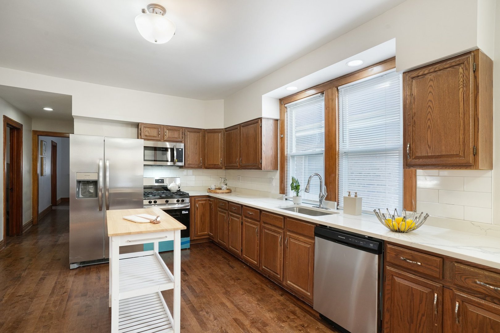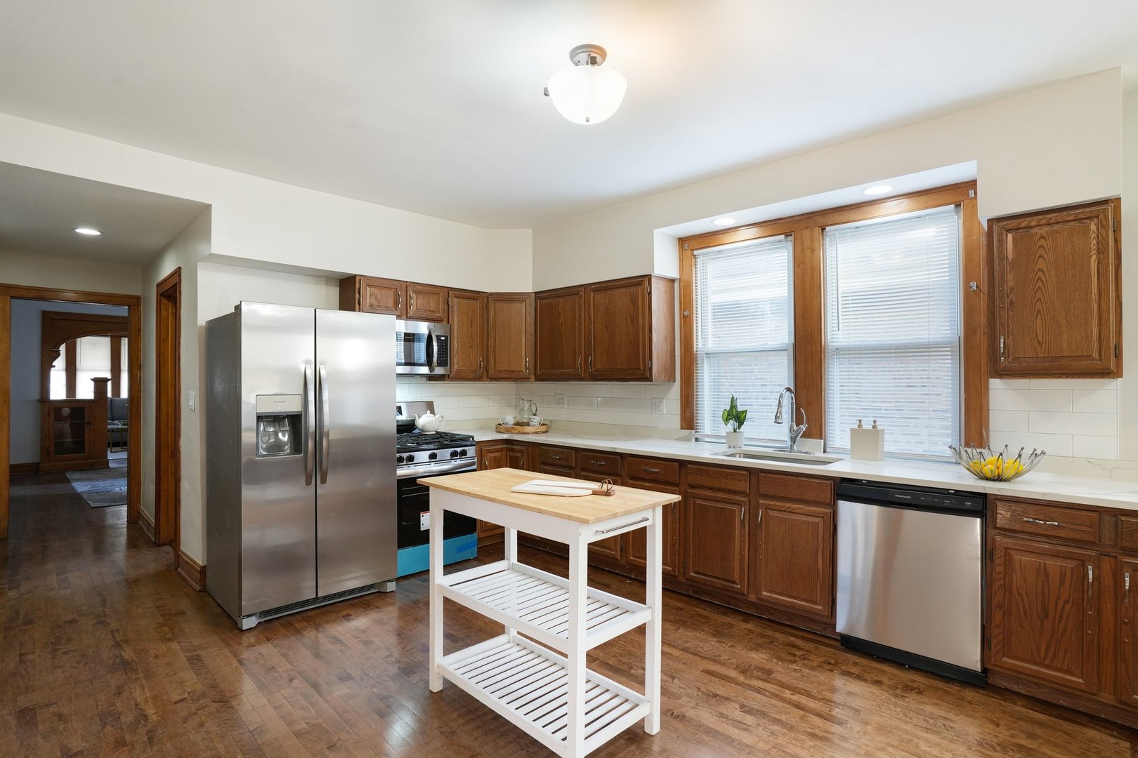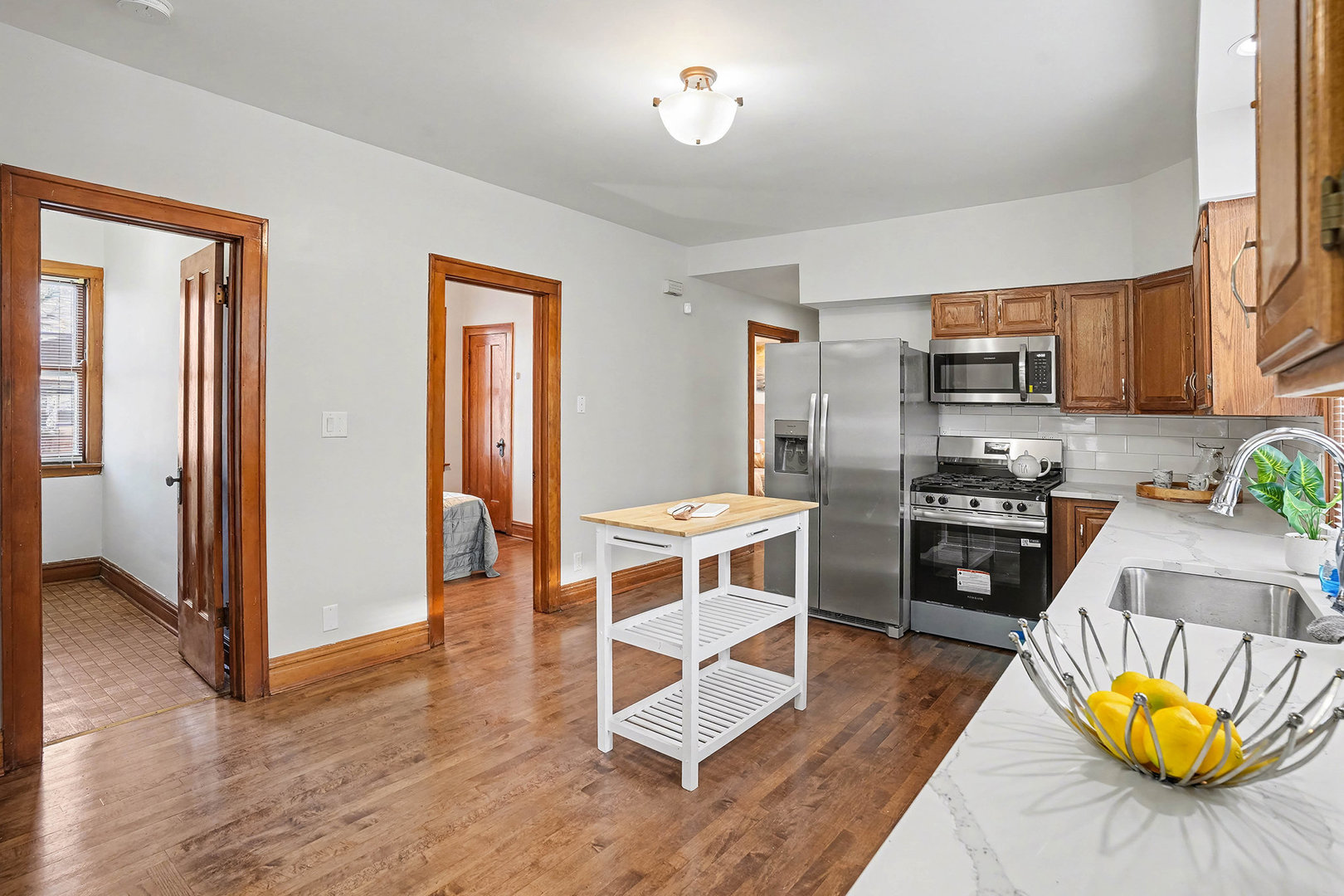 Welcome to 4712 S Keeler Ave, Chicago. This single-family home PLUS basement IN-LAW SUITE has five bedrooms and two full bathrooms. The main floor living room has beautiful stained glass windows and original woodwork that leads into your separate dining room, 3 main level bedrooms, full bathroom and eat-in kitchen. The lower level includes separate exterior access with a full kitchen, full bathroom, and two bedrooms – use the space for extended family or as an income source! Both the lower level and upstairs are connected to the laundry/utility space in the basement. The home has a fenced in backyard with 2 car detached garage and great storage/potential upstairs in the unfinished attic space. Schedule a showing today!