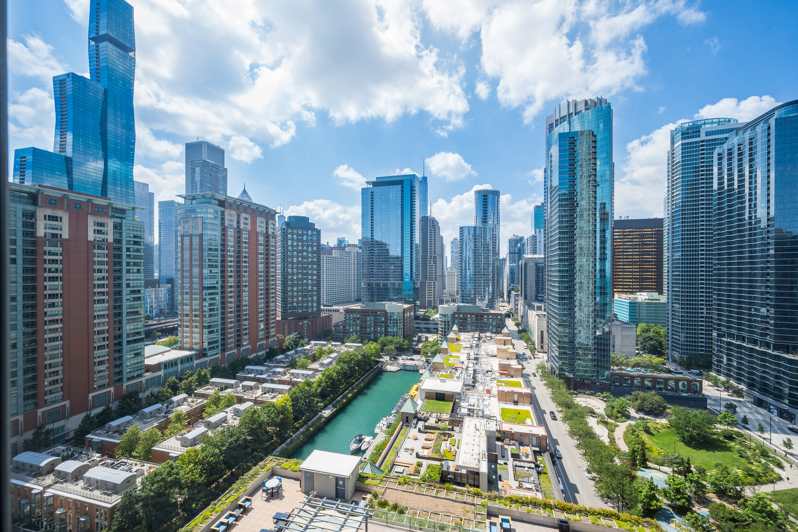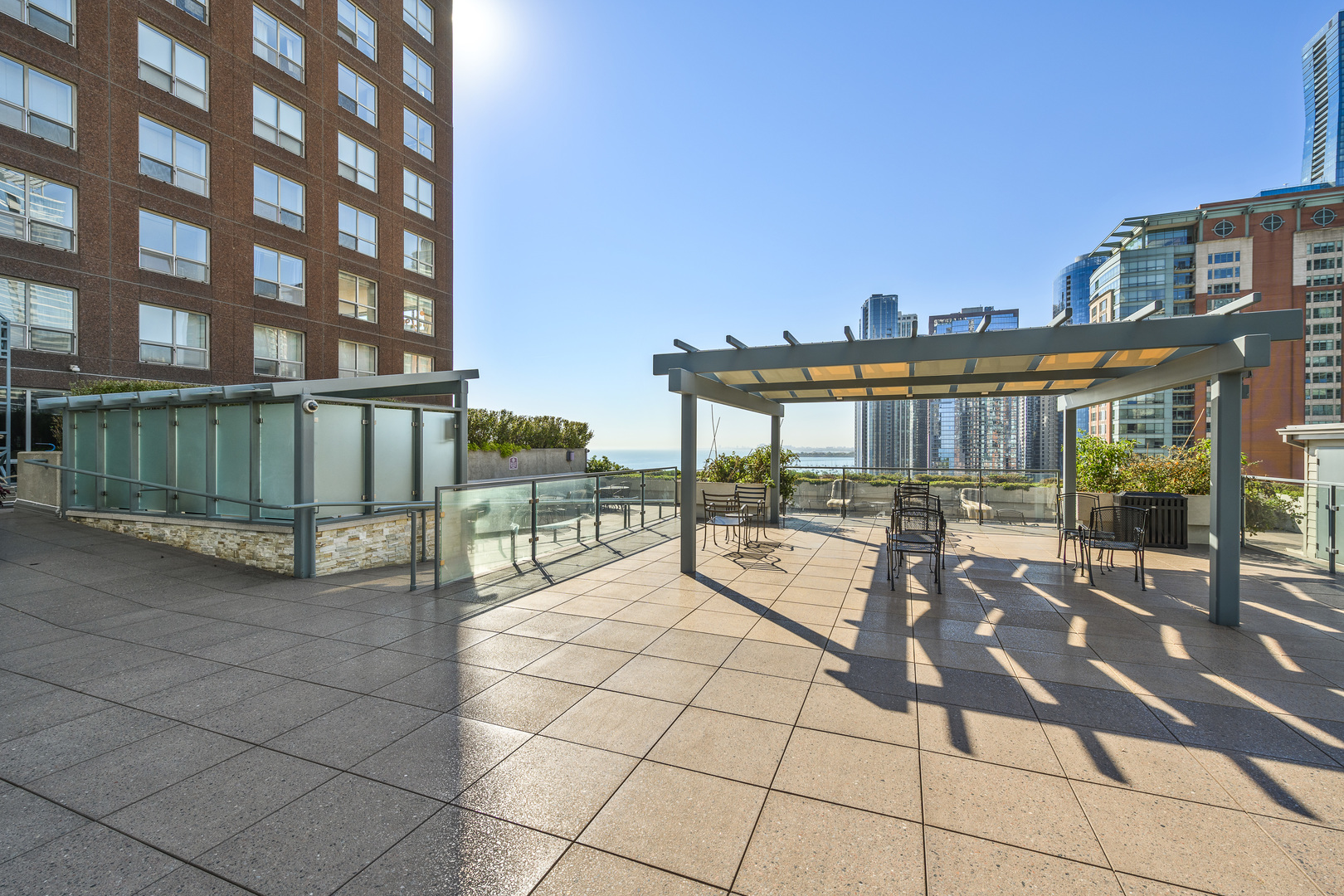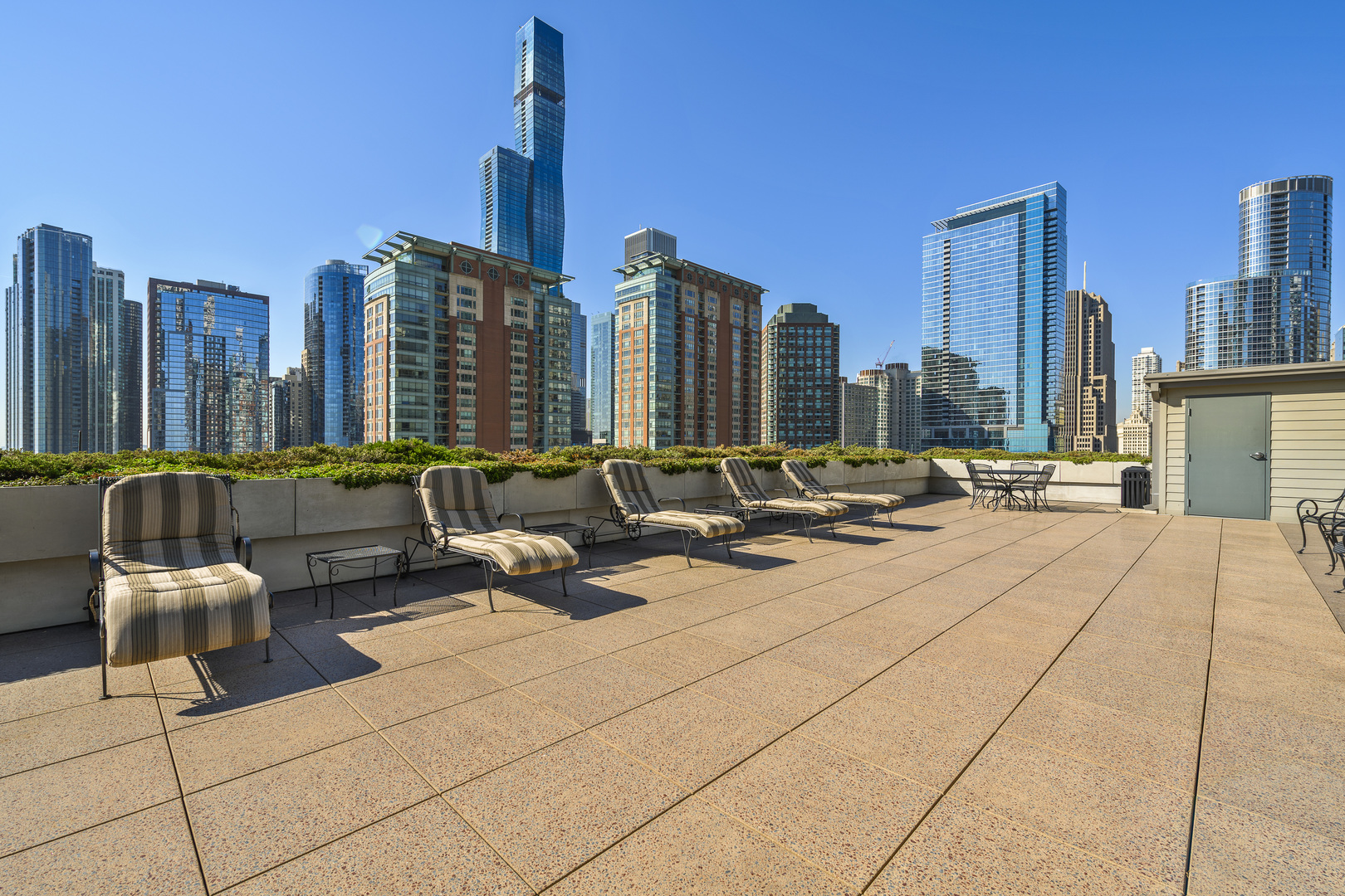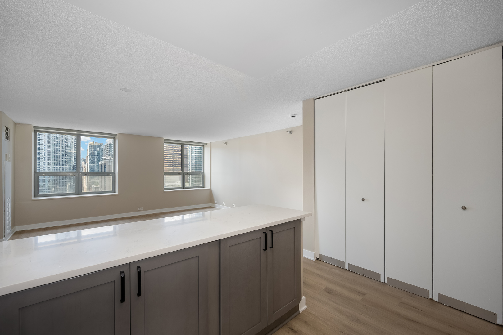 Meticulously rehabbed studio make a perfect in-town! This condo has been updated with all new upscale wood flooring, modern kitchen, with high end cabinetry, counters, and stone back splash. This Streeterville sophisticated home offers unobstructed skyline city and river views. West-facing windows flood the space with light fully protected postcard views of Chicago. The bathroom has been completely renovated with a walk-in shower, great counter space and lots of cabinet storage. In-unit laundry and great amounts of storage throughout. The full-service building includes 24-hour door staff, 24 hour maintenance, indoor pool, jacuzzi, sauna, sundeck, fitness center, and party room. Ideally located in Streeterville, steps to the lakefront, and all that Chicago has to offer. Garage parking is available if needed. Low assessments include so much! Well managed association featuring solid reserves, pet friendly, very friendly staff.