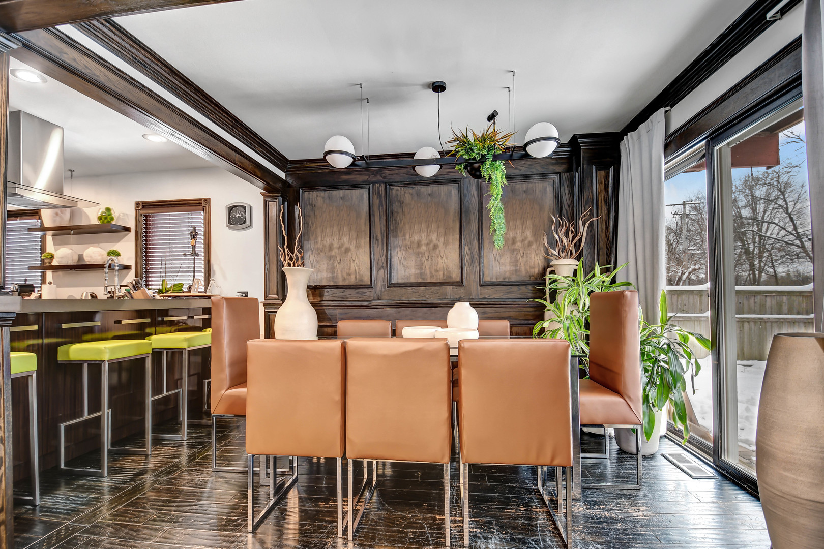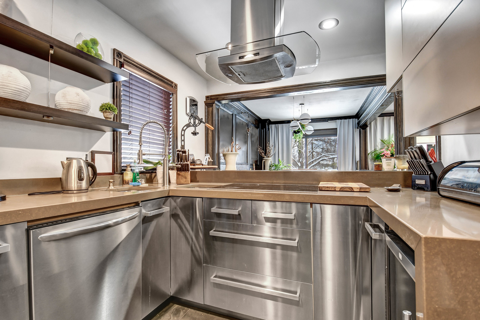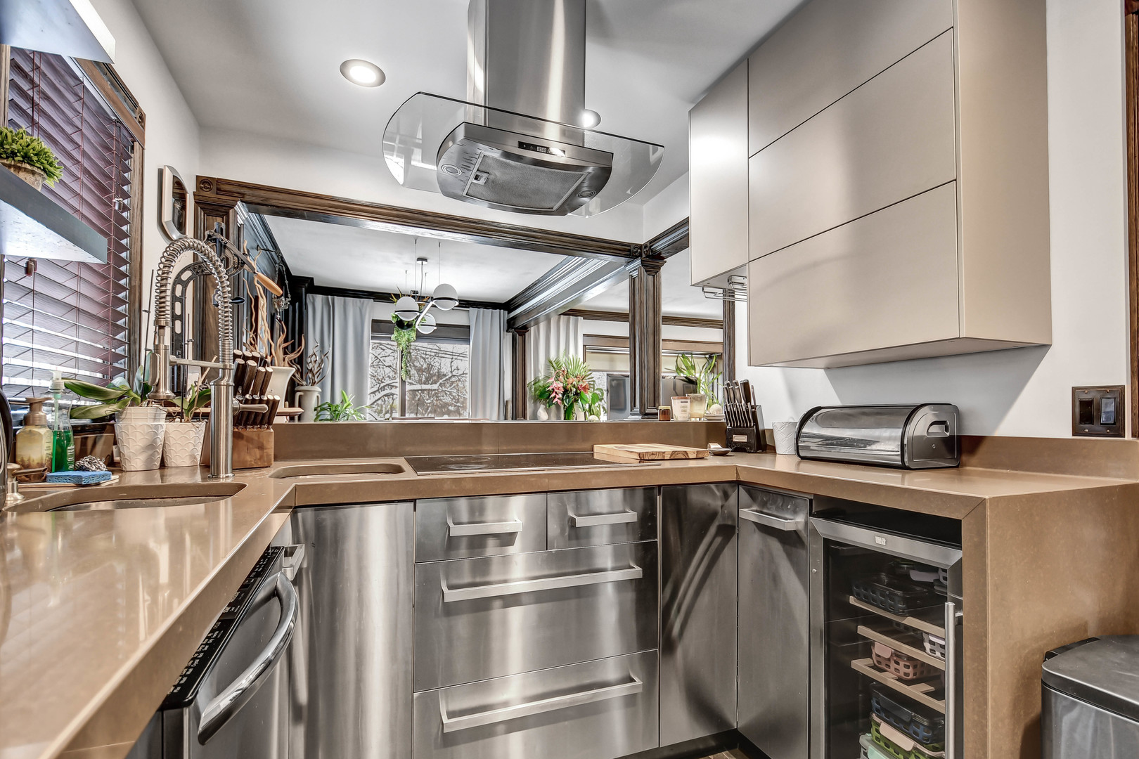 Step into a beautifully re-envisioned Hinsdale residence where every detail has been artfully redesigned. This first-floor condo with a finished basement and private garage offers effortless living defined by the perfect fusion of timeless craftsmanship and fresh contemporary style. The refined living room sets the tone with rich, hand-finished woodwork that brings depth and character, enhanced by clean recessed lighting for a modern touch. The dining room continues the look, showcasing dramatic paneling and expansive sliding glass doors that open to a private patio overlooking a wide green space ideal for outdoor entertaining. Seamless flow into the kitchen and bar seating makes the space equally suited for gatherings or everyday comfort. The striking kitchen marries bold aesthetics with practical function, featuring glossy wood-grain multi-toned cabinetry, stainless steel appliances wrapped in custom stainless steel base cabinets and drawers, floating shelves, and an efficient layout. Two bedrooms and two beautifully appointed bathrooms complete the main level. The primary bathroom offers boutique-hotel luxury with a crocodile leather-textured vanity, modern vessel sink, oversized mirror, and glass-enclosed shower. The second bathroom continues the elevated feel with espresso-toned marbled tile, stacked-stone accents, a glass-enclosed walk-in shower, and a warm wood-grain vanity topped with a sleek vessel sink. A finished basement provides valuable additional living space or storage, adding to the home’s versatility. Close to top-rated schools, shopping, restaurants, and transportation, this exceptional residence blends modern sophistication with classic warmth. Schedule your visit to experience this one-of-a-kind home before this rare find is gone!