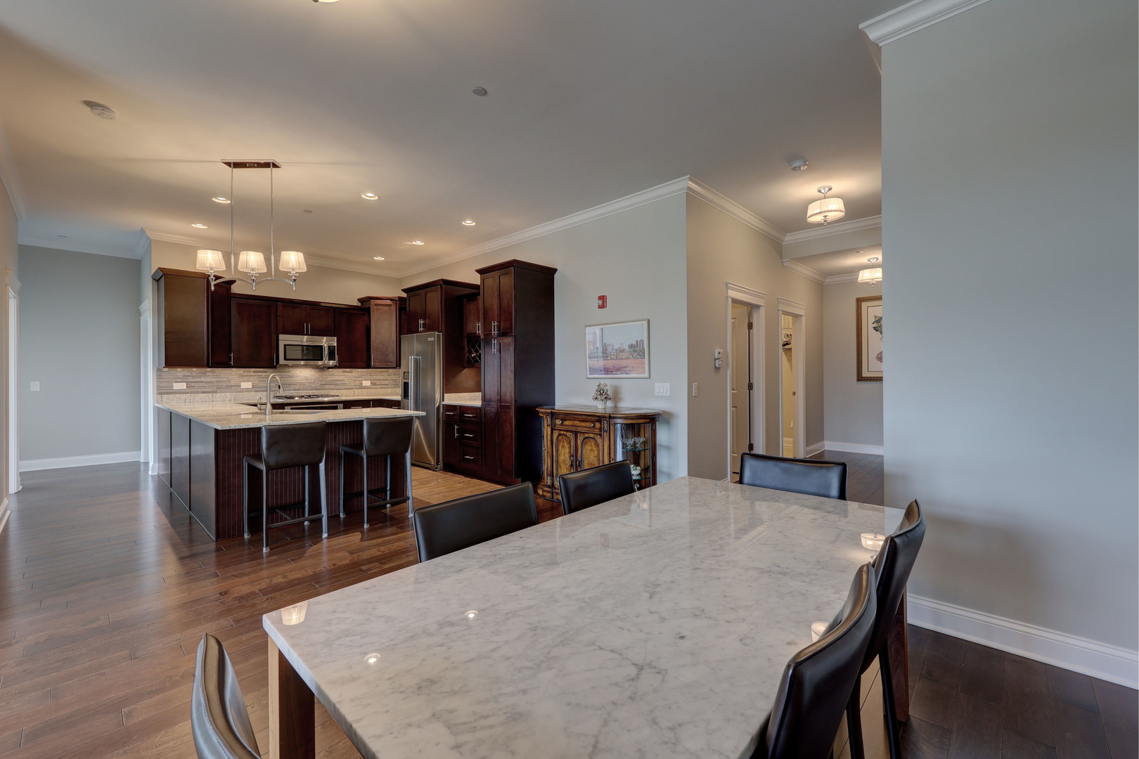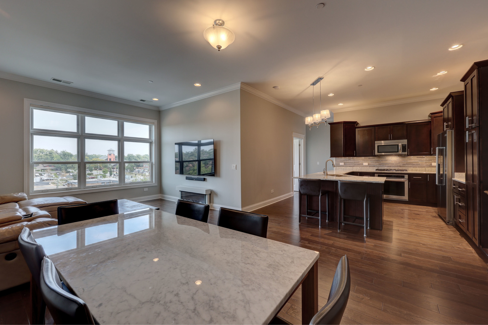 Rarely available and truly special, this top-floor residence sits in one of the area’s most desirable buildings-an exceptionally scarce opportunity combining penthouse-level privacy, generous square footage, two heated garage spaces, and a full suite of lifestyle amenities. Set less than two blocks from the Metra and moments from Downtown Downers Grove’s restaurants, cafes, boutique shopping, and the historic Tivoli Theatre, the location is simply outstanding. Inside, the sprawling 1,660 sq ft open concept delivers effortless everyday living and elegant entertaining: airy 10-ft ceilings, crisp crown molding, recessed lighting, and gleaming hardwood flooring through the main living areas create a refined, welcoming vibe; new luxury vinyl tile adds quiet comfort in both bedrooms. The expansive great room anchors gatherings with room to dine, lounge, and host with ease. The chef’s kitchen shines with granite countertops, abundant cabinetry with soft close drawers, under-cabinet lighting, tile backsplash, stainless-steel appliances, and a generous breakfast bar for casual meals and conversation. Both bathrooms are beautifully finished with granite-topped vanities and designer fixtures. Your serene primary suite functions as a private retreat, offering double vanities, an oversized 5′ x 3.5′ tiled walk-in shower, and a dream L-shaped walk-in closet with exceptional storage. Thoughtful upgrades run throughout the home, including solid white 2 panel doors, and Pella triple-pane windows for whisper-quiet sound control and energy efficiency-a rare and meaningful improvement you’ll feel every day plus Hunter Douglas Silhouette blinds for elegant light diffusion and privacy. A true laundry room with sink and added storage makes chores simple and discreet. Step outside to your north/east-facing 13′ x 9′ patio-perfect for peaceful summer sunrises, morning coffee, or a quiet evening read. The building itself is amenity-rich and designed for easy, happy, lock-and-leave living: a golf putting room (right outside your door) for a quick practice session, a large party/gathering room for milestone celebrations, a game room with ping pong and pool table, a comfortable TV lounge/card area, and an on-site fitness room for convenient workouts! Two heated garage spaces plus a large storage room located just steps from the unit complete this exceptional, seldom-found package. Opportunities like this don’t come up often, top-floor peace with no one above you, premium finishes, serious sound and energy performance, private outdoor space, and a long list of amenities-all in a walk-to-everything address. If you’ve been waiting for a standout home in a premier building near the train and downtown, this is the one.