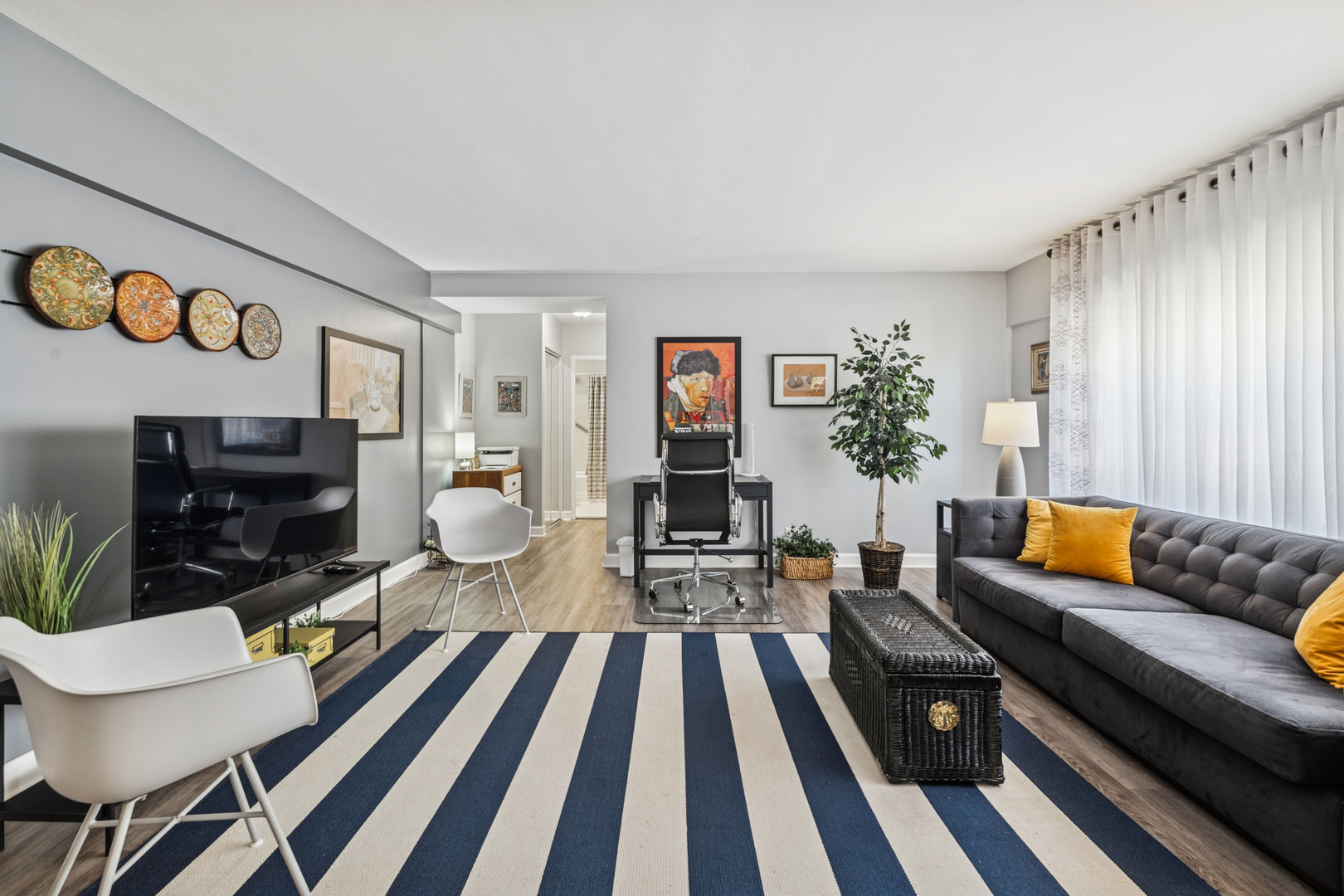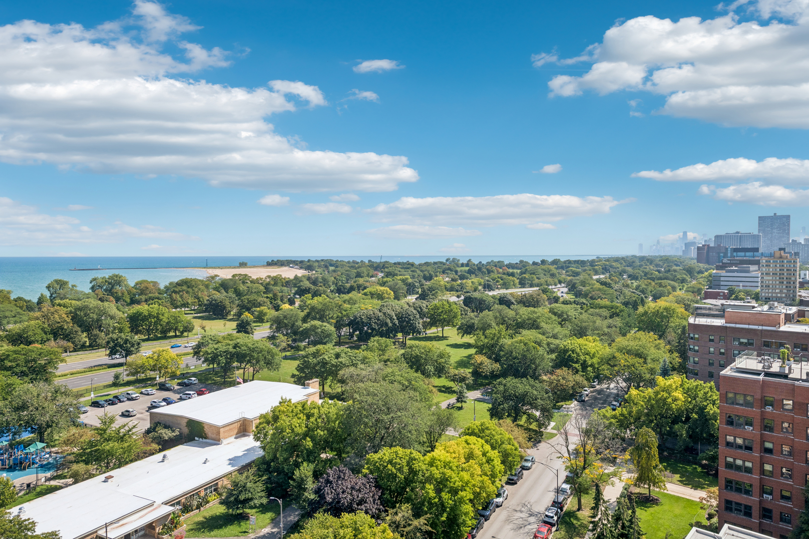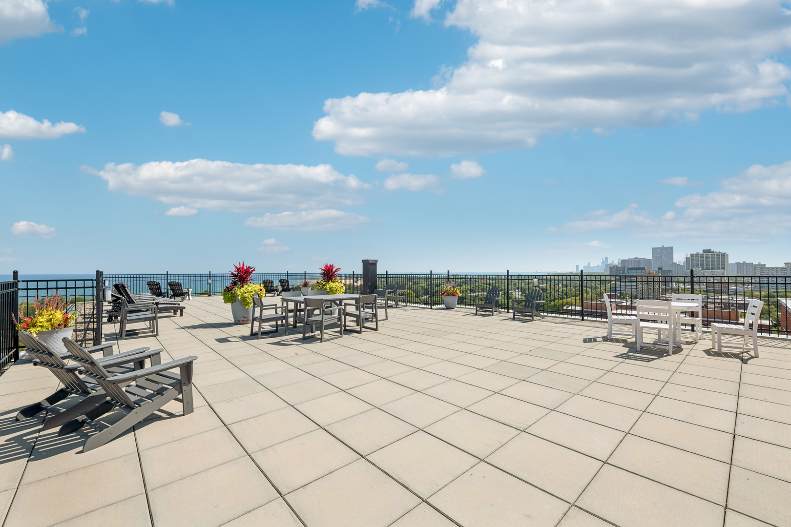 Completely Turnkey residence at very popular Shoreline Park. Residence 1009 features wonderful sunlight, no wasted hallway space, luxury high-end vinyl flooring throughout. Kitchen features custom all wood cabinetry with dove tail joints, cylinder brushed stainless steel steel hardware, all Stainless steel appliance package, re-circulating culinary hood, extra deep, single under mount sink, black swan faucet, 1.25″ straight edge contemporary white quartz counters with grey veining. FULL SIZE DISHWASHER. Wonderful window in the kitchen. Large rectangle format porcelain floor tiles. This designer residence painted in light grey with white trim and moldings. Generous living space accommodates a desk, small eating table and living room furniture. 16’x11′ bedroom with ceiling fan and three closets. Linen closet. Pristine, contemporary white tiled bathroom, pedestal sink, medicine cabinet for storage. Steps to Lake Michigan, restaurants, historical music theaters, restaurants, grocery and LSD on ramp at Lawrence. Easy access to public transportation including the 136, 146 and 148 buses that stop at the front door of Shoreline Park. This is a full amenity building including 24 hour doorstaff, on-site management, maintenance, building engineer, incredible sundeck completely outfitted, 360 degree views with no obstructions, gym, game room, business center, hospitality and laundry rooms. Deeded garage parking is included in the listing price. Residence 1009 is a true gem, nothing to do but move in. Furniture/furnishings also negotiable for a true “plug and play” transaction.