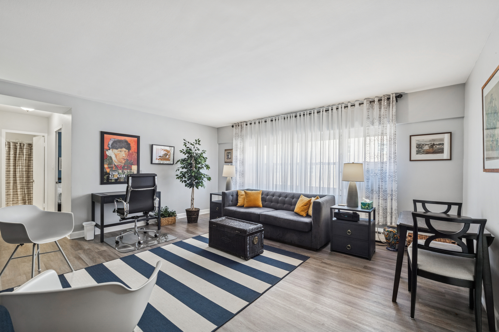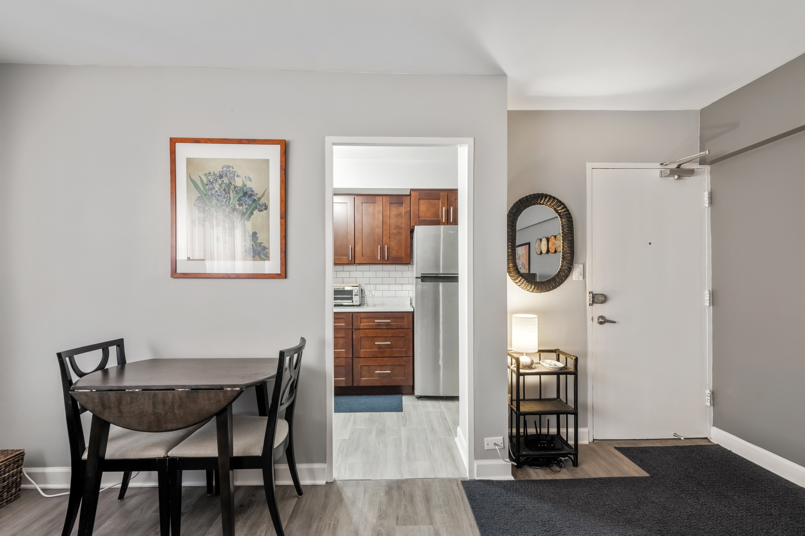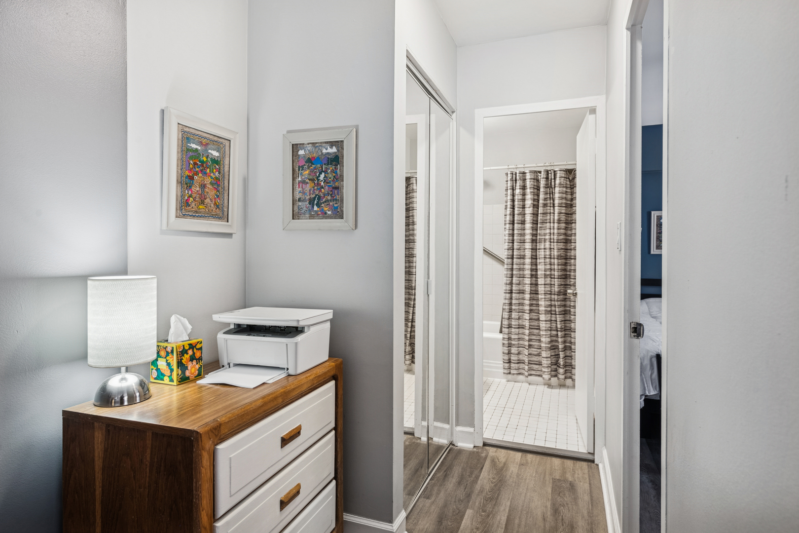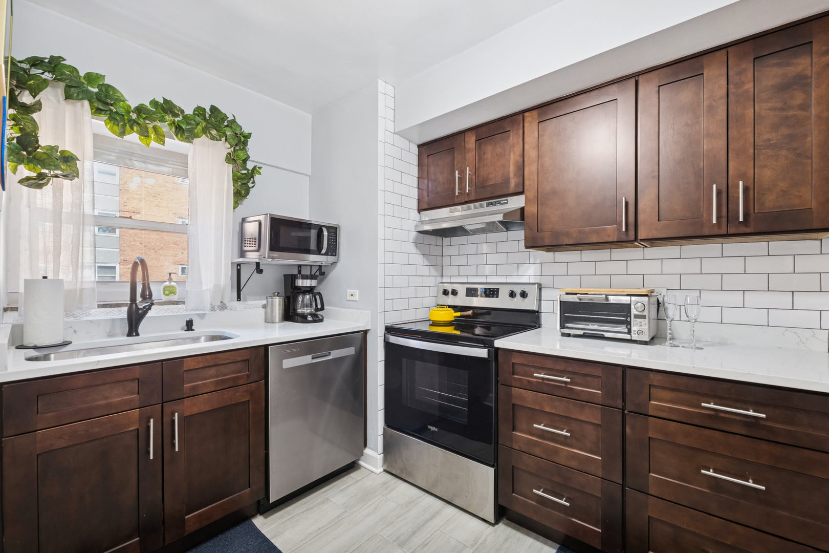 Completely Turnkey residence at very popular Shoreline Park. Residence 1009 features wonderful sunlight, no wasted hallway space, luxury high-end vinyl flooring throughout. Kitchen features custom all wood cabinetry with dove tail joints, cylinder brushed stainless steel steel hardware, all Stainless steel appliance package, re-circulating culinary hood, extra deep, single under mount sink, black swan faucet, 1.25″ straight edge contemporary white quartz counters with grey veining. FULL SIZE DISHWASHER. Wonderful window in the kitchen. Large rectangle format porcelain floor tiles. This designer residence painted in light grey with white trim and moldings. Generous living space accommodates a desk, small eating table and living room furniture. 16’x11′ bedroom with ceiling fan and three closets. Linen closet. Pristine, contemporary white tiled bathroom, pedestal sink, medicine cabinet for storage. Steps to Lake Michigan, restaurants, historical music theaters, restaurants, grocery and LSD on ramp at Lawrence. Easy access to public transportation including the 136, 146 and 148 buses that stop at the front door of Shoreline Park. This is a full amenity building including 24 hour doorstaff, on-site management, maintenance, building engineer, incredible sundeck completely outfitted, 360 degree views with no obstructions, gym, game room, business center, hospitality and laundry rooms. Deeded garage parking is included in the listing price. Residence 1009 is a true gem, nothing to do but move in. Furniture/furnishings also negotiable for a true “plug and play” transaction.