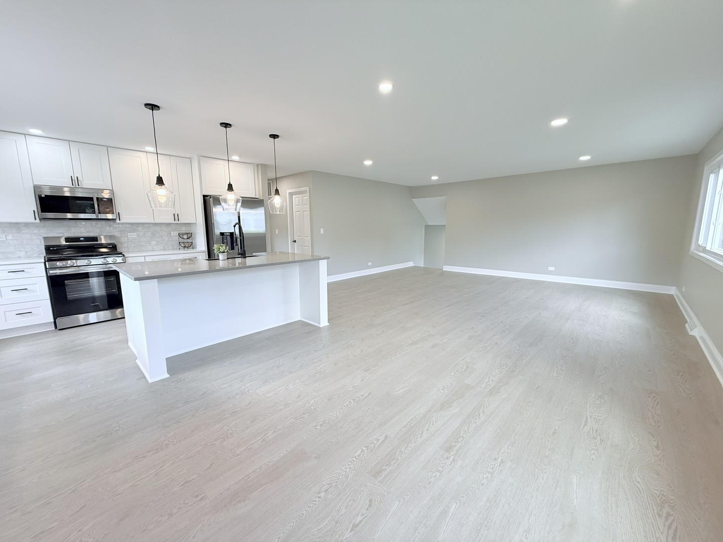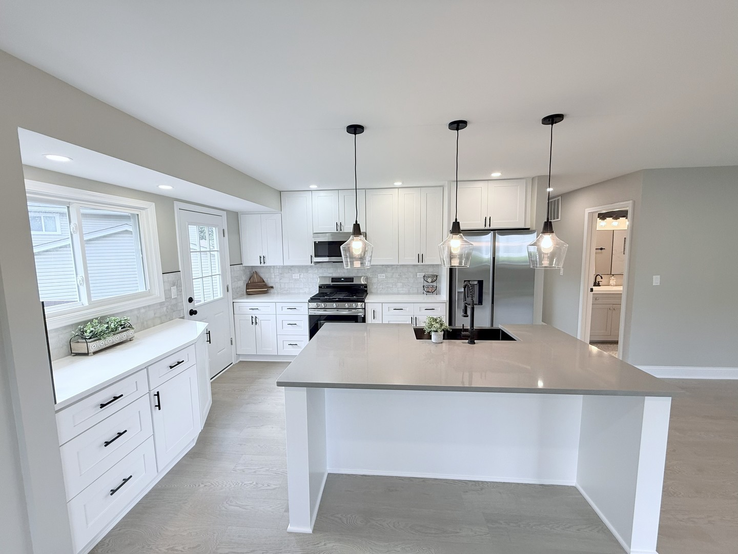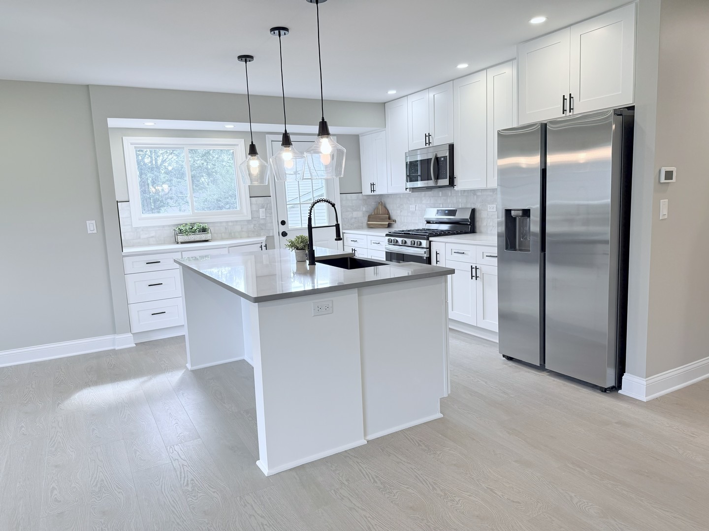 Your Dream Home Is Calling! This beautiful 5-bedroom, 3-bathroom home has been meticulously designed to balance style with everyday comfort. From the moment you step inside, you’ll notice the thoughtful style choices-fresh paint, new waterproof luxury vinyl flooring, black finishes and recessed lighting that brightens every space. The open-concept main level is highlighted by a chef-inspired kitchen with quartz countertops, an oversized island, brand-new cabinets, stainless steel appliances, and a striking marble backsplash-perfect for both entertaining and special gatherings. The main bedroom offers a peaceful retreat with a walk-in closet and a full bathroom, while large windows throughout the home fill each room with an abundance of natural light. The full finished basement is a true showstopper, offering a spacious retreat with a cozy wood-burning fireplace. Whether you envision it as a home theater, game room, gym, or office, this versatile level provides endless possibilities for the way you live and enjoy your home. Additional highlights include an attached two-car garage and updates you’ll appreciate: newer siding & roof, doors, and windows, a long asphalt driveway, along with beautifully updated bathrooms featuring detailed tilework. Outside, you’ll love the ample backyard and side deck-ideal for outdoor fun, gardening, or simply unwinding outdoors. Nestled in a private cul-de-sac, yet just minutes from the Promenade, local dining and shopping, parks, and quick highway access, this home offers both convenience and tranquility. Move-in ready and thoughtfully updated throughout, this is truly the home you’ve been waiting for!
