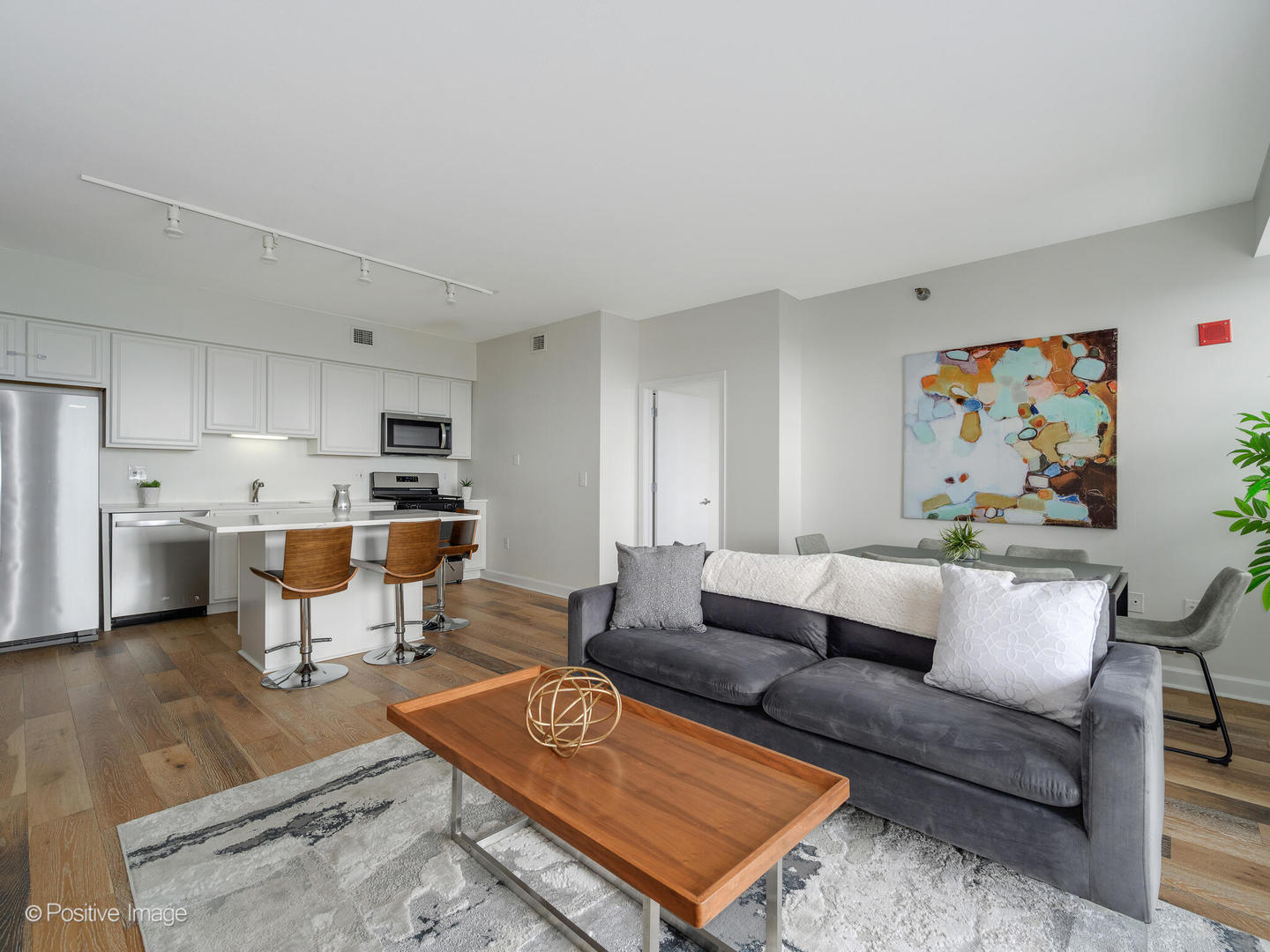 Soak in incredible city views from this high-floor 2-bedroom, 2-bath condo in the vibrant heart of the South Loop! Move-in ready with a popular split floor plan, this home offers an open living and dining area with hardwood floors and a welcoming entry foyer with coat closet. The recently renovated kitchen features white cabinetry, sleek quartz countertops, and an eat-in island, opening seamlessly to the living space and oversized balcony- perfect for entertaining or relaxing. The two spacious bedrooms include freshly cleaned carpet, with the primary suite boasting dual vanities, a soaking tub, and a separate shower. A full-size washer/dryer, ample closet space, and extra building storage add convenience. Enjoy the amenities of a full-service building with door staff, a fitness center, bike room, and storage. Unbeatable location-steps from restaurants, museums, Grant Park, Soldier Field, the lakefront, and CTA Red/Orange/Green lines. Garage parking available for $25k.