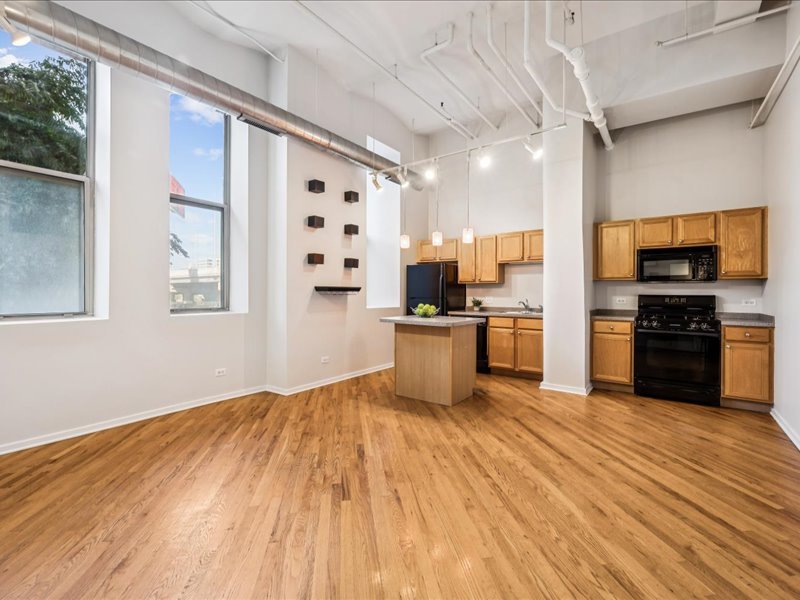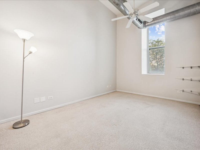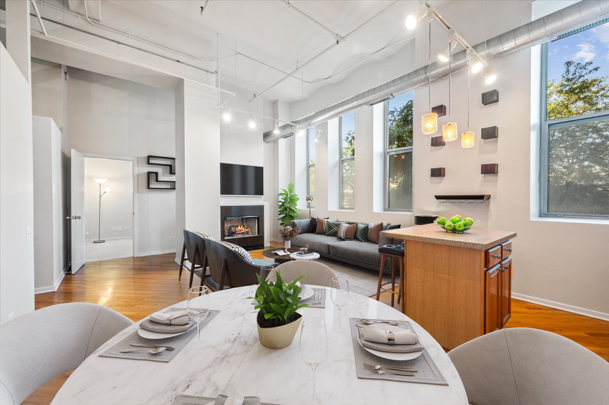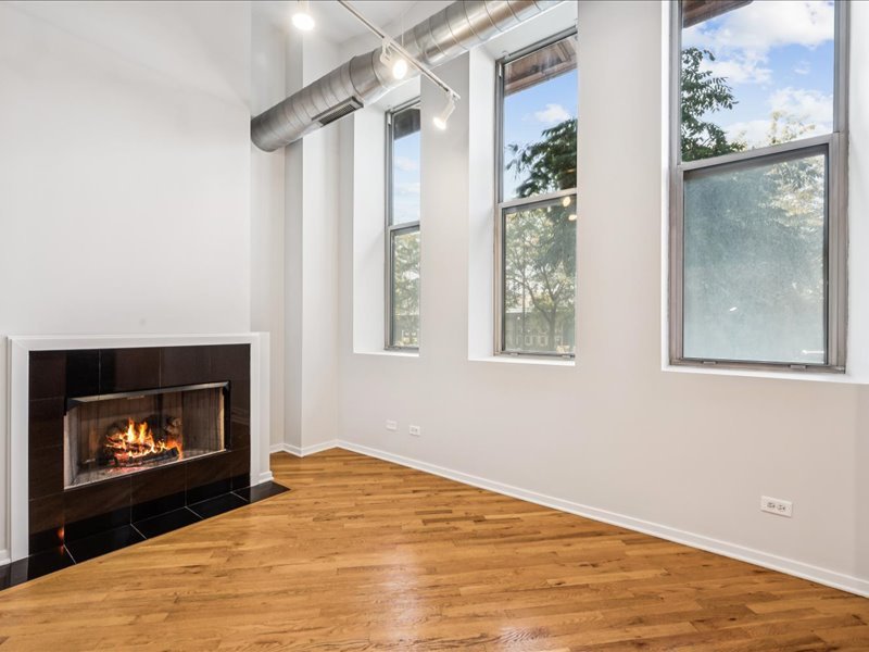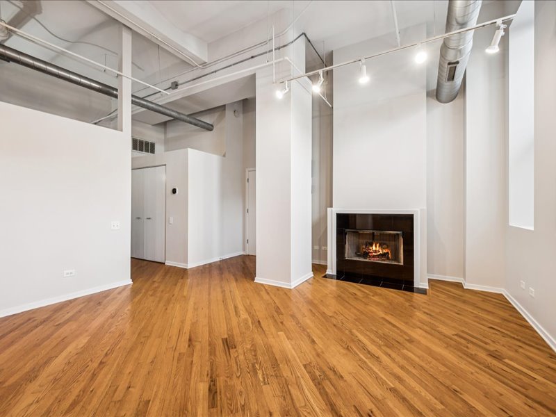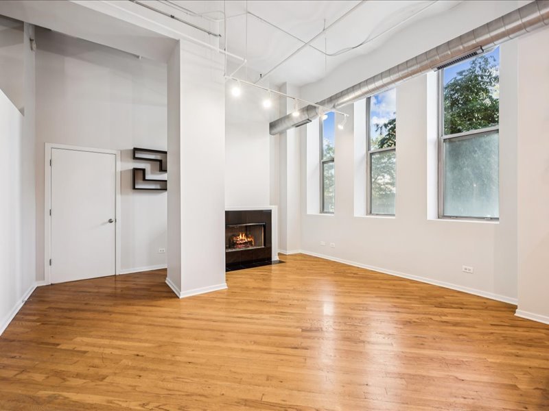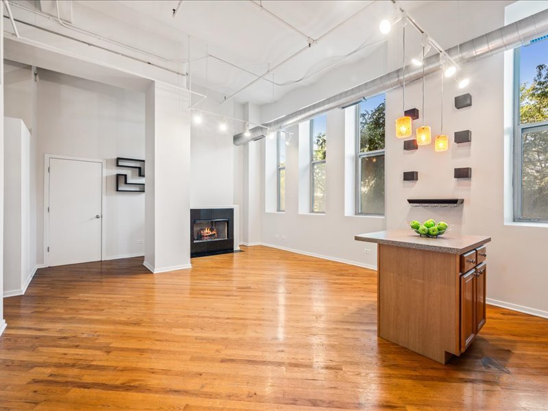Live the Fulton Market Lifestyle! This light-filled 2-bedroom, 1.1-bath home is move-in ready and filled with character. Step inside the foyer to a bright and airy living/dining room featuring real hardwood floors, oversized windows with deep ledges, and a cozy fireplace and soaring 12′ ceilings. The open kitchen offers abundant cabinetry and a spacious island with seating-perfect for cooking, entertaining, or casual meals. The primary suite provides a serene retreat with large windows, a walk-in closet, and an en-suite bath with a vanity and soaking tub/shower. The lofted second bedroom is ideal as a home office, guest space, or creative studio. In unit laundry adds to the convenience. Completely painted in neutral color throughout and new blinds. Deeded indoor parking is included, adding convenience to this already perfect home. Just outside your door, enjoy all that Fulton Market has to offer-award-winning restaurants, vibrant nightlife, shopping, and easy access to public transit and downtown.