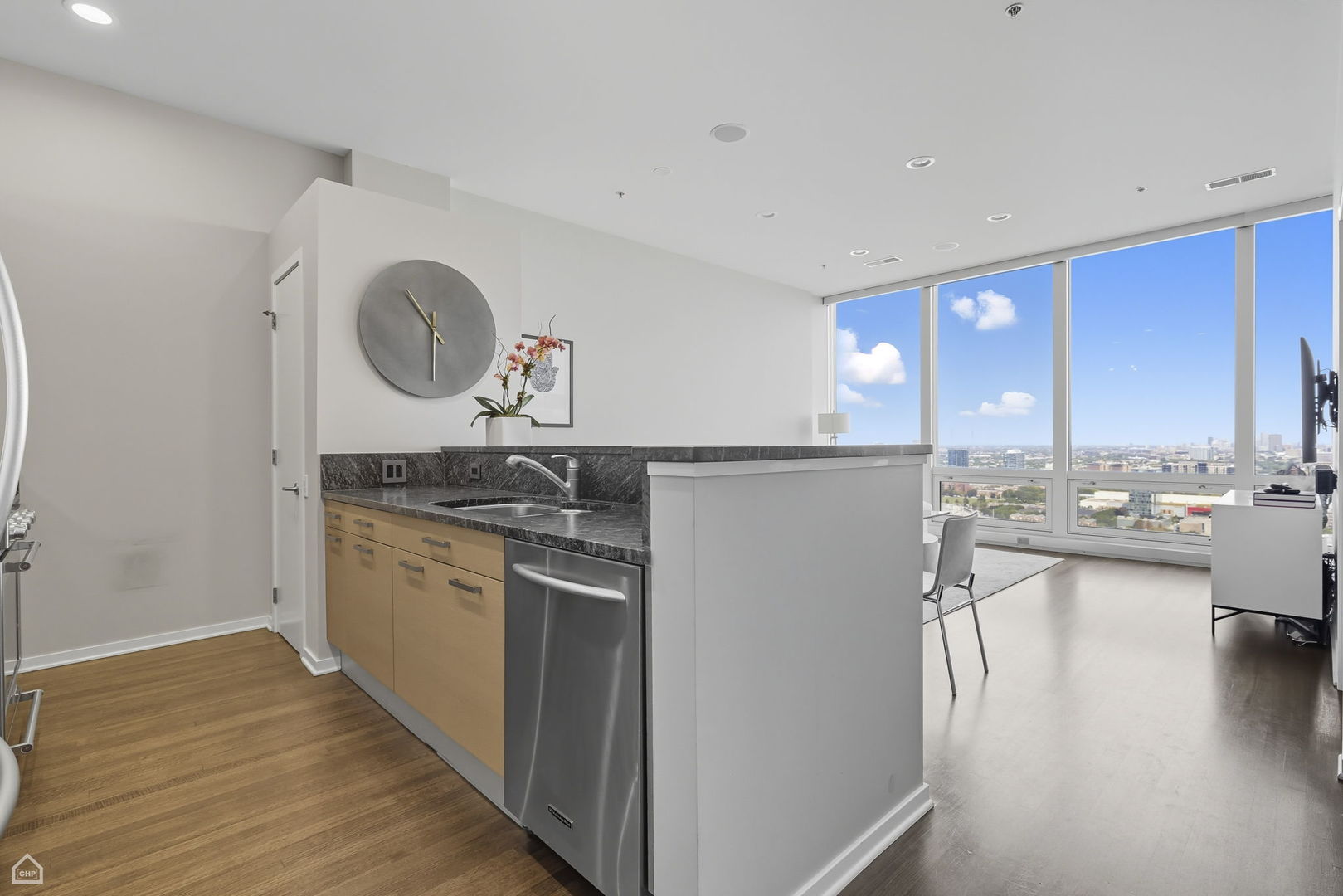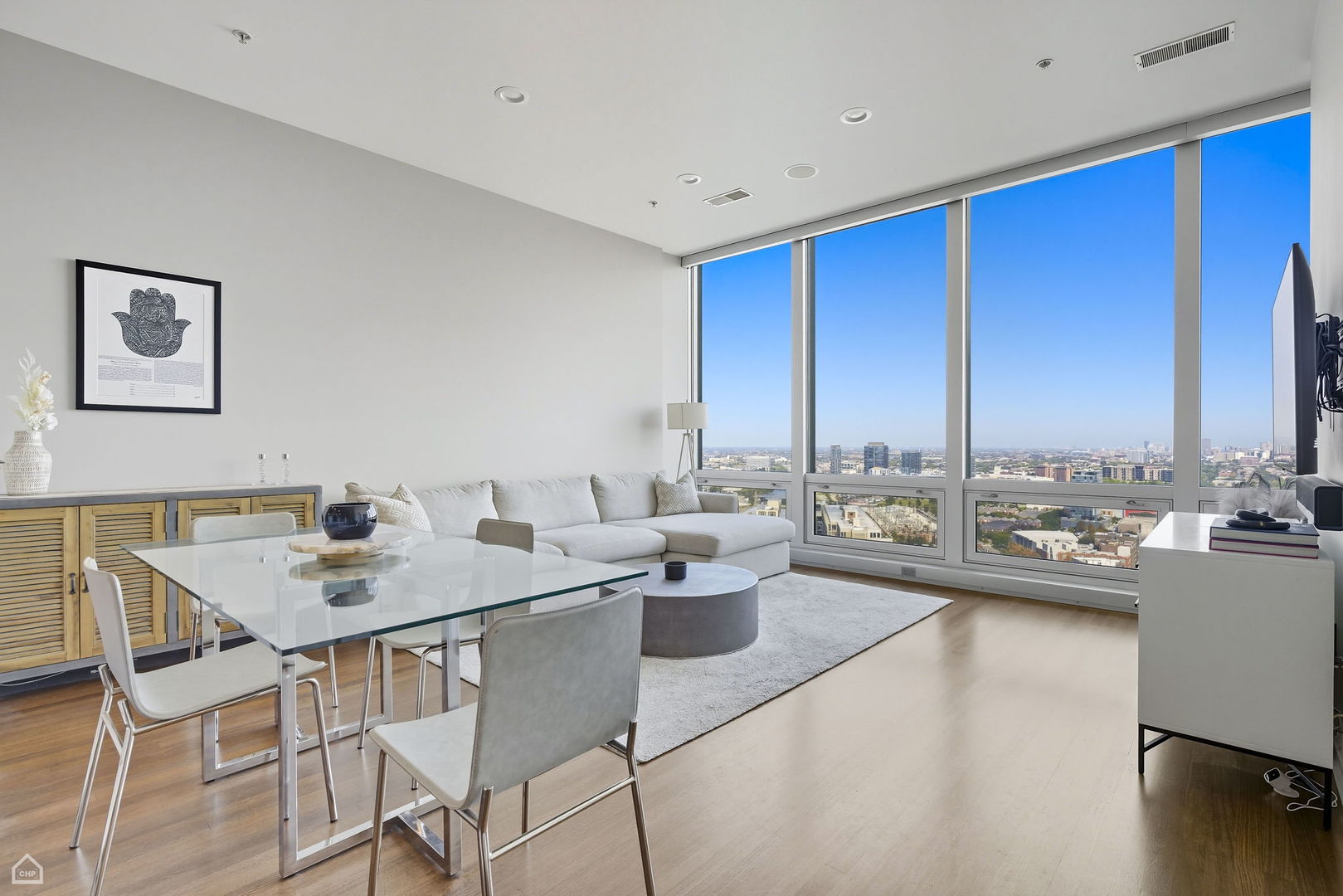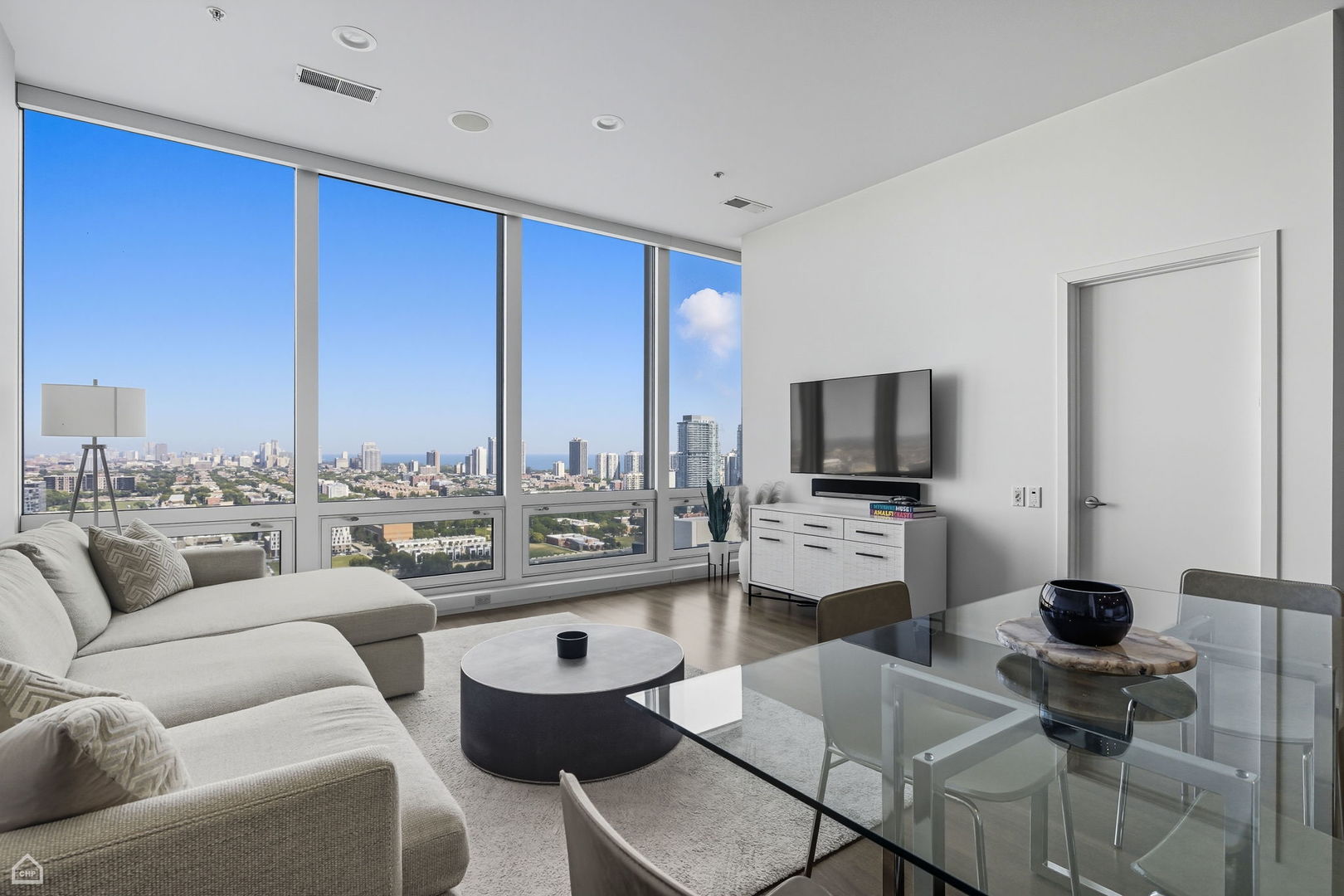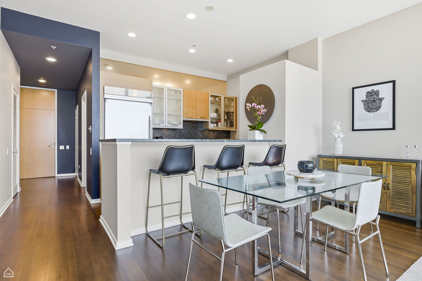 Welcome to your new home at The Montgomery, one of River North’s most iconic addresses. This is not just another Montgomery listing. This is the rare high floor, large second bedroom, view of the lake, and tandem parking you have been waiting to find. This luxury true 2-bedroom, 2-bath residence combines modern design with timeless comfort, offering the perfect balance of warmth and sophistication to live a joy-full life. Step inside and experience soaring 10′ ceilings, expansive floor-to-ceiling windows that flood the space with natural light, and open-concept living designed for both style and ease. The thoughtful split-bedroom layout ensures privacy, while the rare oversized second bedroom-large enough for a queen bed with double closets-offers versatility that most River North high rise homes can’t match. Designer finishes elevate every detail: gleaming hardwood floors, a chef’s kitchen with stainless steel appliances and soapstone counters, custom Elfa closets, built-in speakers for home audio, and custom motorized shades for effortless comfort to get the best of your floor to ceiling windows when you want them and when you don’t. The primary suite features room for a king bed, two closets, and a chance to wake up feeling like you are on top of a mountain and calming lake views. Plus a retreat to marble tile and a dual vanity for everyday luxury and comfort. This home also includes in-unit laundry. Additional storage. And premiere perfectly situated heated garage tandem parking space that is close to the elevator and not next to a concrete post (+40K). Beyond your front door, The Montgomery delivers five-star amenities the moment you arrive: newly landscaped front circle drive for easy guest drop off and deliveries and a landscaped lobby terrace where even waiting for a ride can be an enjoyable experience. 24-hour door staff. Fitness center. Rooftop deck with stunning skyline views. Gated dog park to make the worst wintry days not so bad. Giant outdoor patio experience with seating and fire pits fit for a luxe vacation. And the easiest morning routine in the world with The Gardner Pre-School attached to the building (with open spots for enrollment). Phenomenal location, access to Larrabee Dog Park, Erie Cafe, Starbucks, Ward Park Playground, River Walk and a variety of grocery stores, shopping, top restaurants, gyms and vibrant nightlife. Last time this sold it never went on market. Come see your new home today!