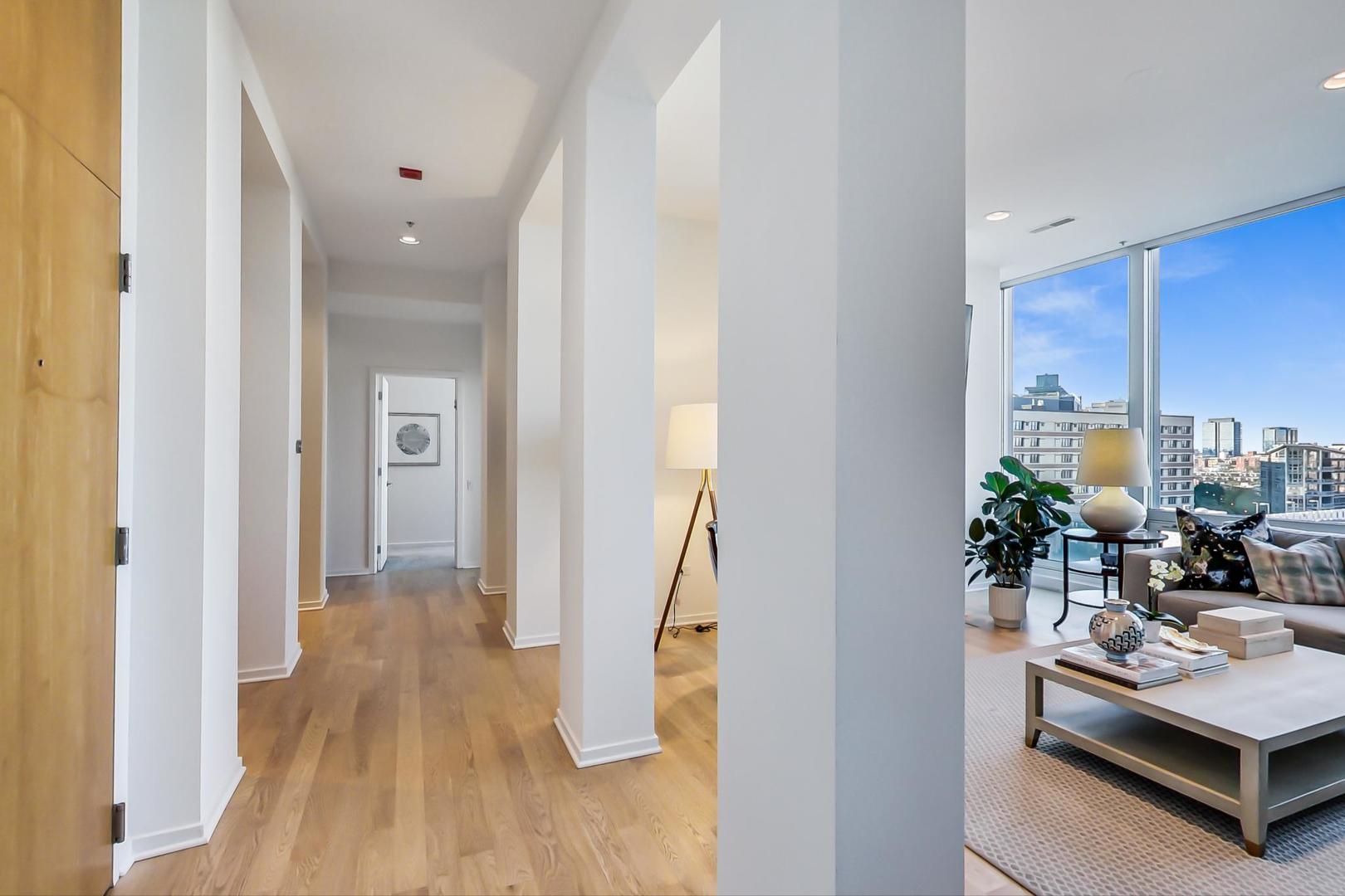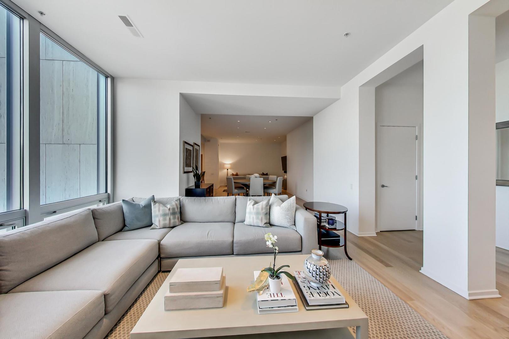 Welcome to the Montgomery, one of River North’s most luxurious, full-amenity buildings. Step into the foyer that opens into an expansive light-filled layout, perfect for entertaining. 10 ft floor-to-ceiling windows make a panoramic view while the generous living area features a fireplace and adjacent family room. A powder room and dedicated dining area complete the open-concept design. The chef’s kitchen features a walk-in pantry, stainless steel appliances including a gas cooktop, hood, oversized island, and Restoration Hardware pendants. The luxurious primary suite includes a large walk-in closet and a spa-inspired bath. Thoughtfully designed with custom natural wood double vanity and quartz top, Rejuvenation sconces, Carrara marble herringbone floors & accent wall, freestanding tub, walk-in shower with Italian subway tile and marble floors, and separate toilet area-plus sleek custom shelving and a medicine cabinet for extra storage. The 3rd bedroom is currently used as a versatile den/office across from living area. Additional features include a walk-in laundry room with new full-size GE washer and dryer, recessed LED lighting, custom closet built-ins throughout for incredible storage. A prime 2-car tandem parking space on the 3rd level available for $30k. Additional storage locker on second floor. Residents enjoy full-service amenities including 22,000 sq ft of outdoor space with grills and fire pits, a private dog park, fitness center, dry cleaners, party room, and 24/7 door staff. Just steps to East Bank Club, the vibrant restaurant district, Starbucks, Erie Dog Park, and more.