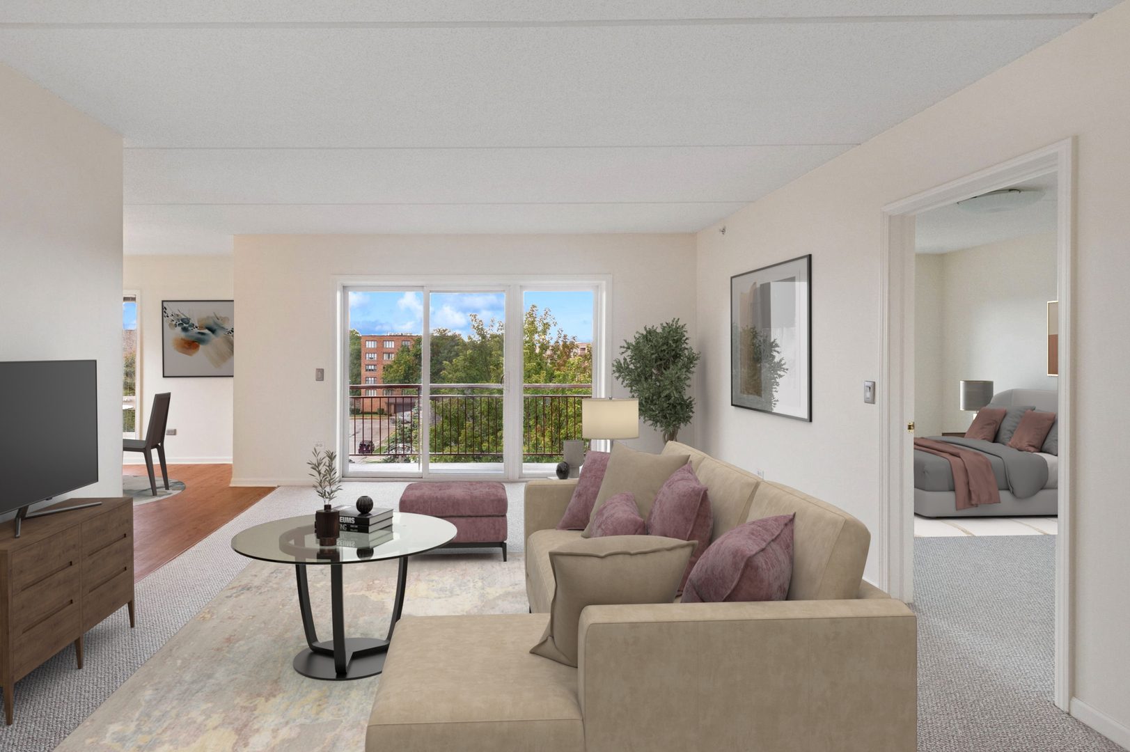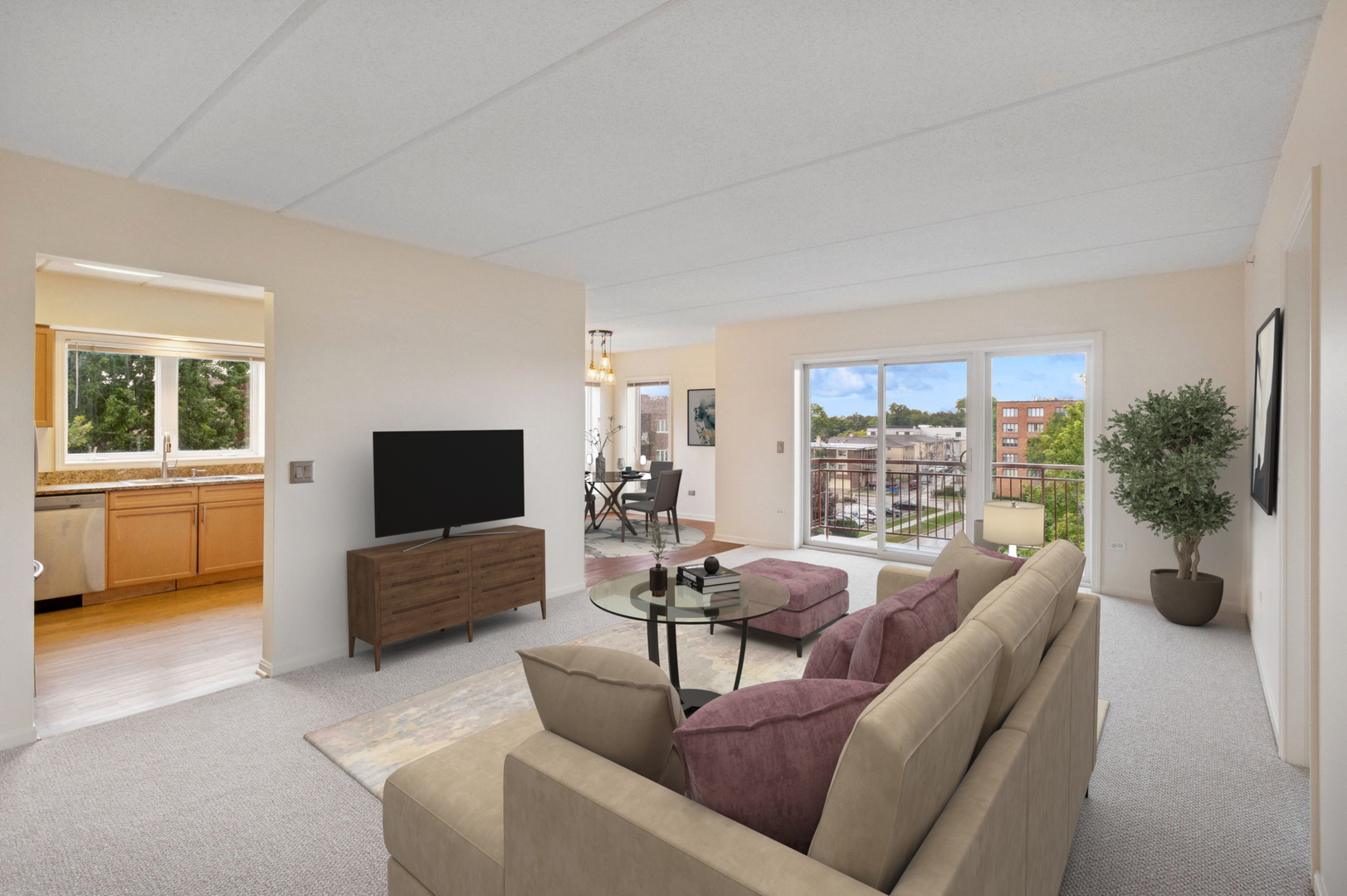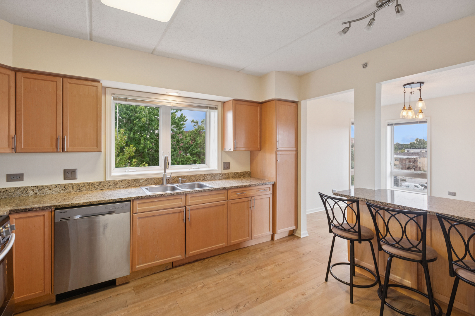 Spacious, sunfilled 2 bed, 2 bath corner unit with south and west views in elevator building located in sought after downtown Des Plaines! Enjoy living among the treetops with abundant sunshine from the large living room offering flexible layout for any lifestyle. Nicely appointed kitchen with granite countertops, stainless steel appliances and eat-in breakfast bar overlooking the separate dining room. Generous primary bedroom with en suite bath & walk-in closet. Great size 2nd bedroom with additional walk-in closet. Step out to the private balcony for neighborhood views and lovely sunsets. Convenient in-unit laundry room equipped with full size, side-by-side washer, dryer, utility sink, and linen shelf. Two parking spaces included, one assigned heated garage space and one unassigned exterior space. Unit also has heated floors, new carpeting and freshly painted. Ample storage throughout. Well managed building. Walking distance to shops, restaurants, Metra, library and all downtown Des Plaines has to offer!
