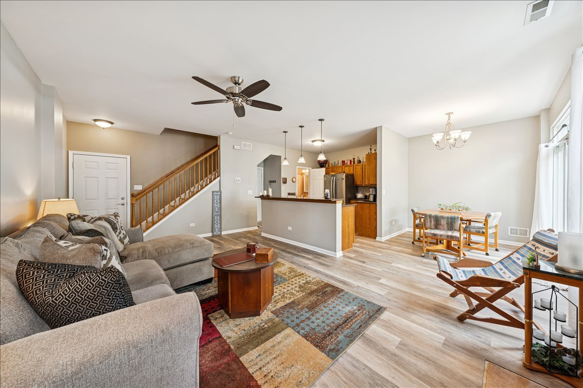 Multiple Offers Received! Welcome to this charming 2 bedroom, 1.5 bath unit filled with natural light! The open floor plan creates a bright and inviting living space, featuring a kitchen with granite countertops, stainless steel appliances, and an island with seating. The main level is enhanced with beautiful luxury vinyl plank flooring throughout. Upstairs, you’ll love the oversized loft-ideal as a family room, playroom, or flex space to fit your needs. Convenient second-floor laundry and a spacious 2-car garage make daily living a breeze. Don’t miss the opportunity to own this delightful unit that combines comfort, style, and functionality!