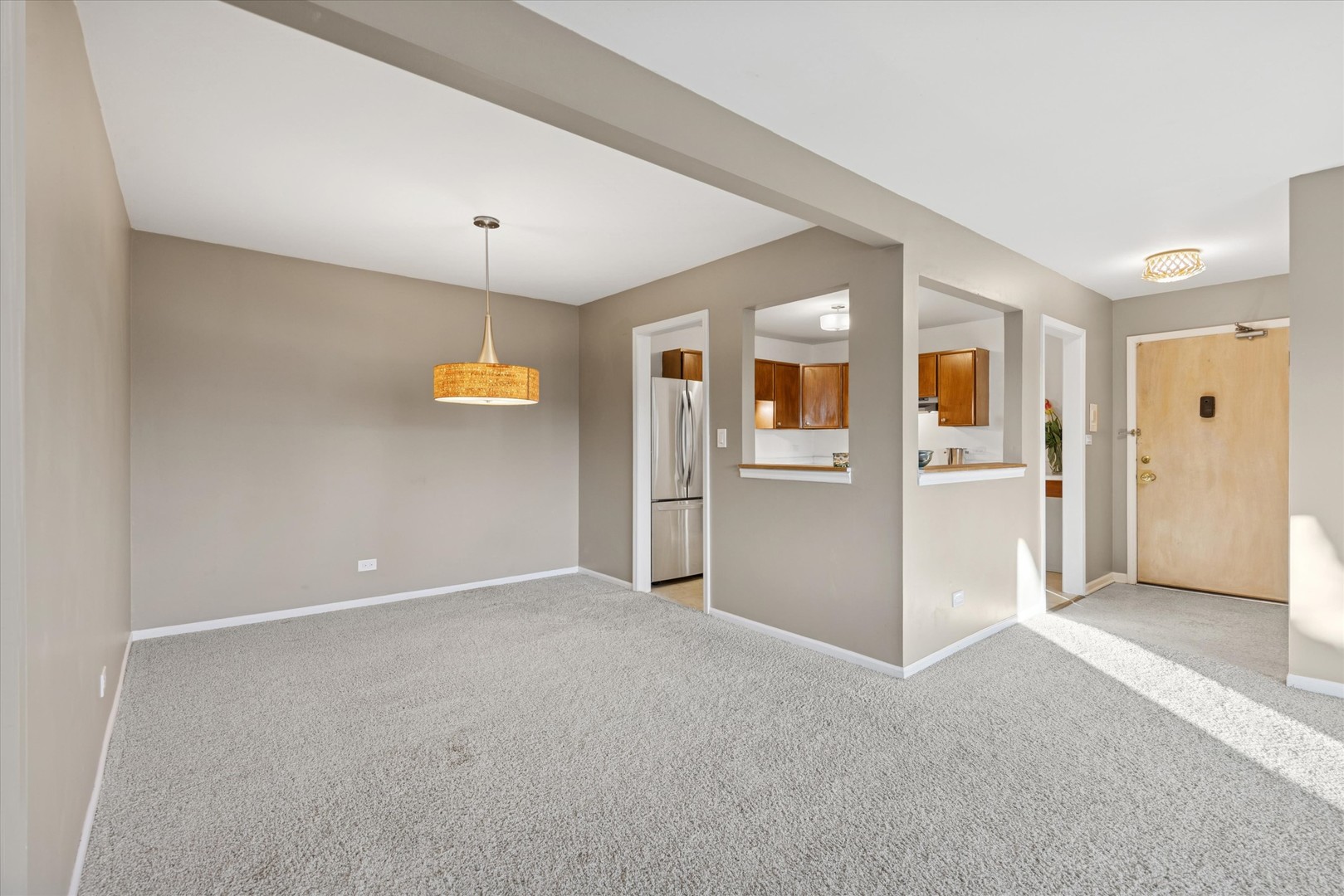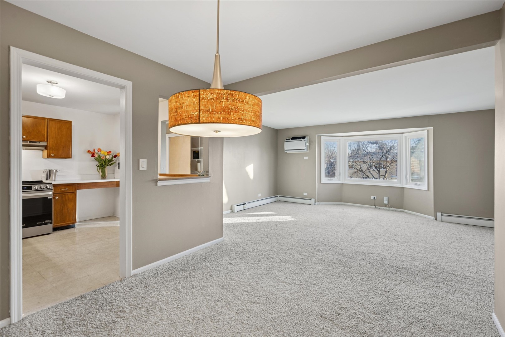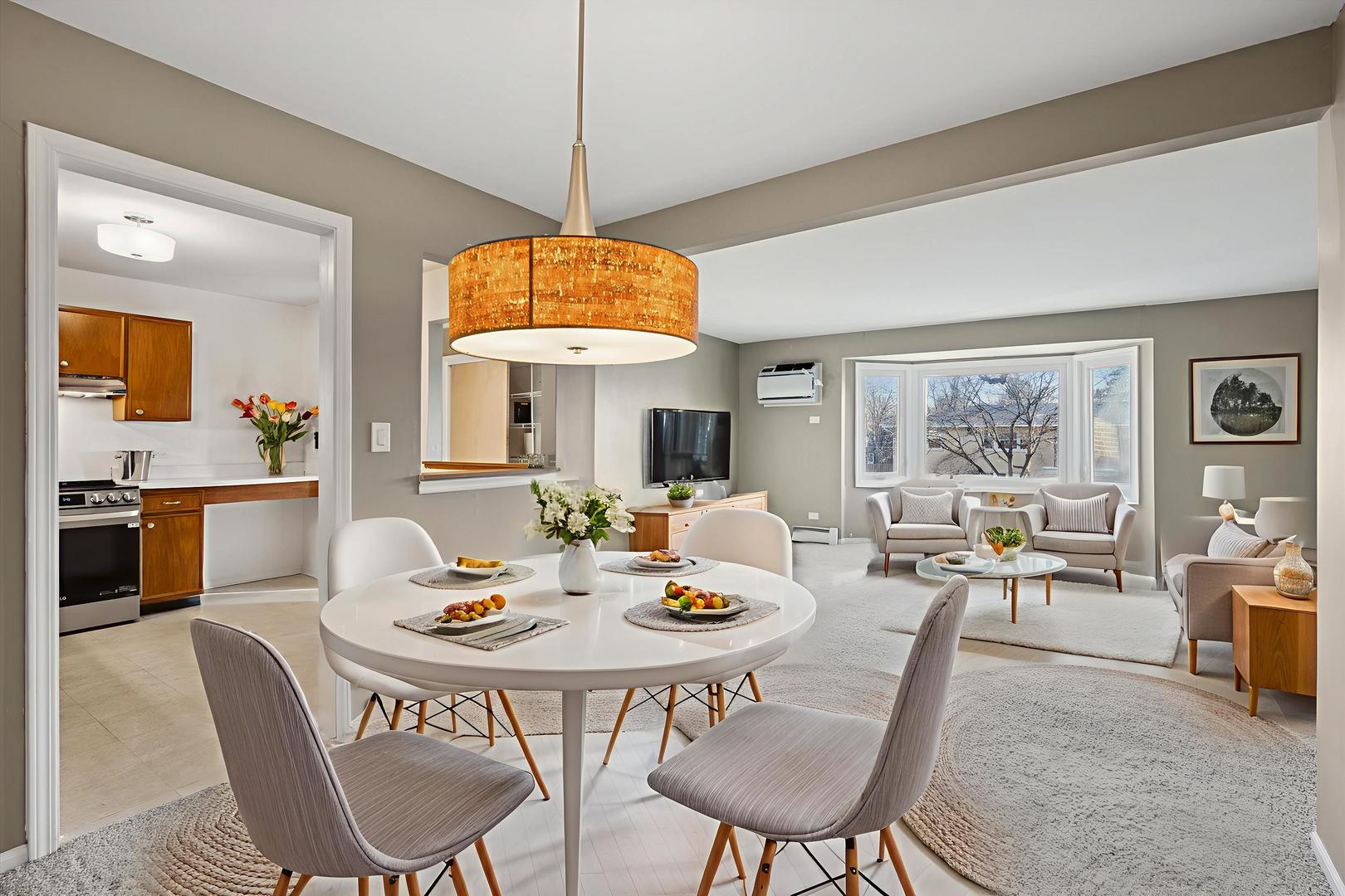 Ideal In-town Arlington Heights location, blocks to Metra Train, Grocery, Fabulous Restaurants, unique shops, fitness centers, wide mix of entertainment includes Metropolis Performing Arts Center, blocks to NW Community Hospital, Avg. 30 min. drive to O’hare International Airport. 2 Bedroom, 1 + 1/2 bath in Primary bedroom has amazing feature wall with accent by Anthropologie. Nestled within neighborhood with tree lined streets, sidewalks and lighting in a Mid Century building. Does not back up or face other building for added privacy +Tree views from every window! 3 Tier full triple bay bump out in living room window for natural light, neutral style colors add interest to this xtra spacious Living space + Dining room in khaki tan shade. Large eat-in freshly painted kitchen, all stainless appliances. Updated or mid century lighting. Spacious Bedrooms have hardwood floors, closet organizers, blue color palette for primary, Benjamin Moore’s fresh Simply White for 2nd bedroom and kitchen. Expansive storage closets in the condo + xtra 5 1/ft. x 9 ft. designated storage and in building laundry. Avg. 15 minute drive to Busse Woods for biking, canoeing, kayaking, rowing, fishing, nature trails, picnics, biking, wildlife viewing. Seasonal Farmers Market is fabulous. Wonderful Library and Park District with alot to offer. Many new or replaced items include windows + well cared for original vintage features makes this condo move in ready in one of the most charming, good energy commuter towns in the suburbs. If you don’t need a car, rent your assigned parking space. If you love your cat(s), they are welcome here. If you can imagine a fresh fun beginning with all you need within blocks, you can call this home. Quick close possible. See additional information tab for more details. Because Condos like this, in this fabulous location with this price do not come up often, you want to move fast! Minutes from the prior Arlington Heights race track, now owned by the Bears Sports Team who are planning a new stadium and mixed-use complex. Value now & value to come!