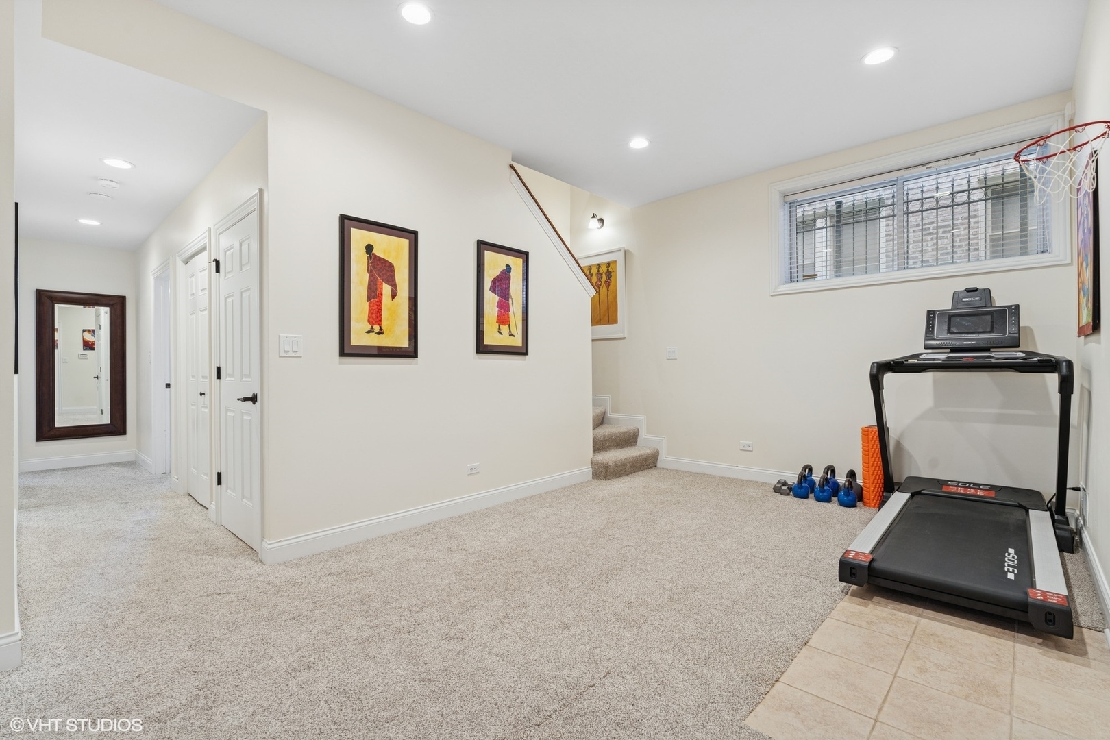 Airy and spacious duplex down with four bedrooms, three full baths, and parking for two cars in an intimate Hyde Park building. Open floor plan features living area with gas fireplace, large dining area, and stainless/granite kitchen. Two bedrooms and two full baths on the main level include a primary suite with luxury bath with whirlpool and separate shower. The main level laundry room with side-by-side washer dryer is conveniently located near the bedrooms. The lower level with volume ceilings adds a family room with workout area, two additional bedrooms, and a third full bath. Elevated finishes include hardwood floors on the main level, recessed lighting throughout, and travertine baths. One garage parking spot and one exterior space are included. Self-managed building with just six units, this inviting home is wonderfully located near transportation, 53rd street shopping, and the University.