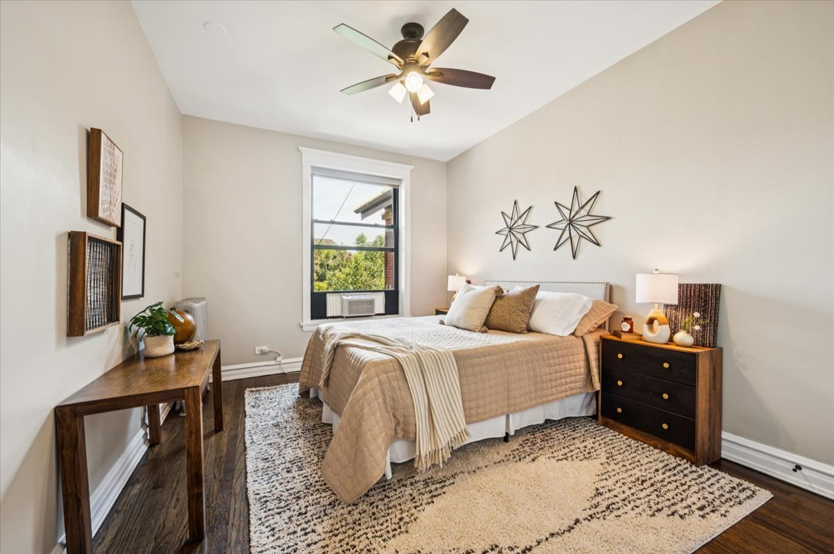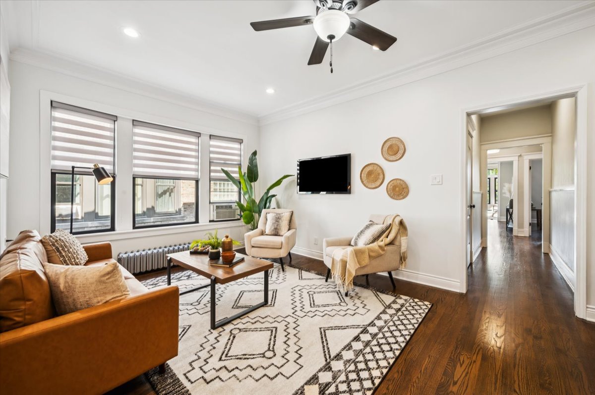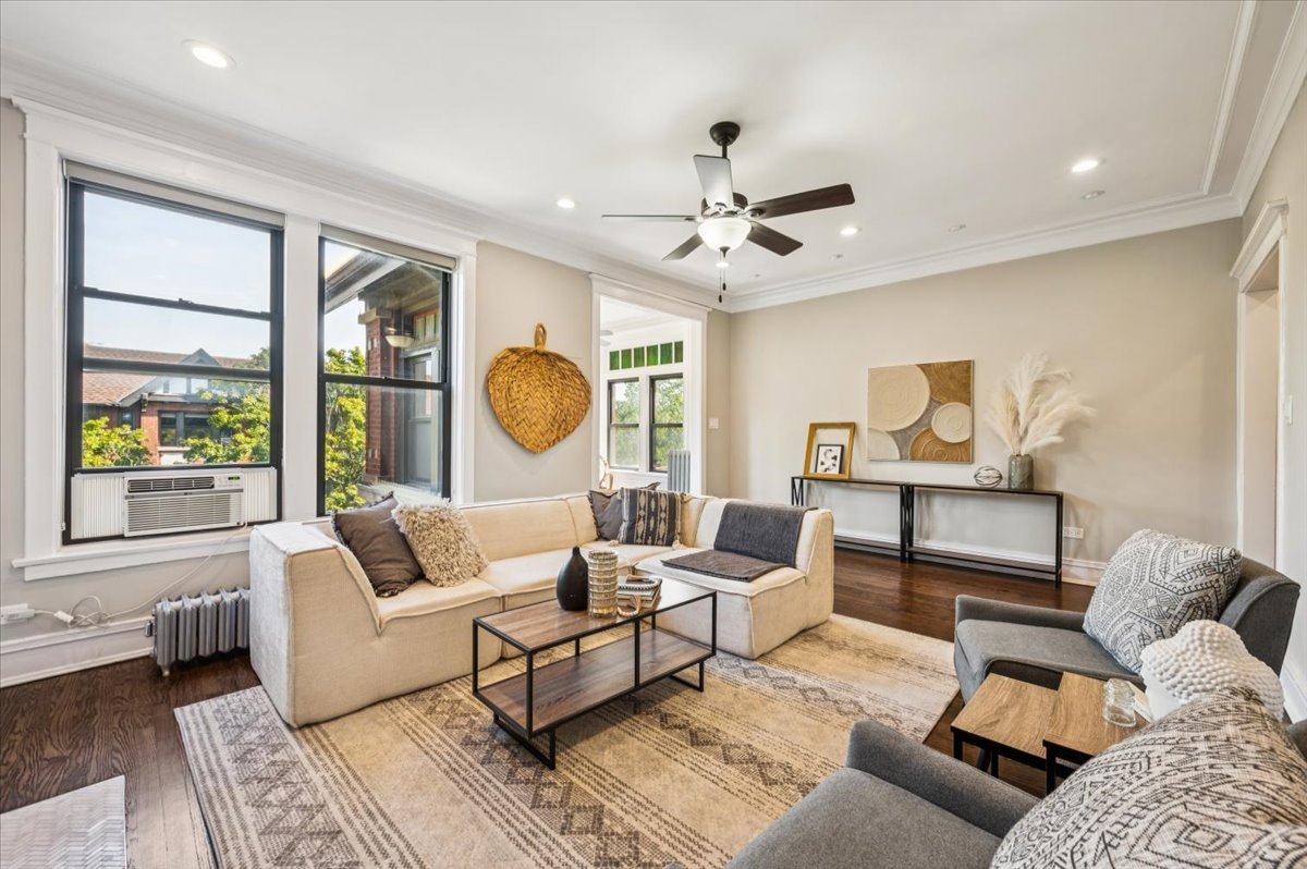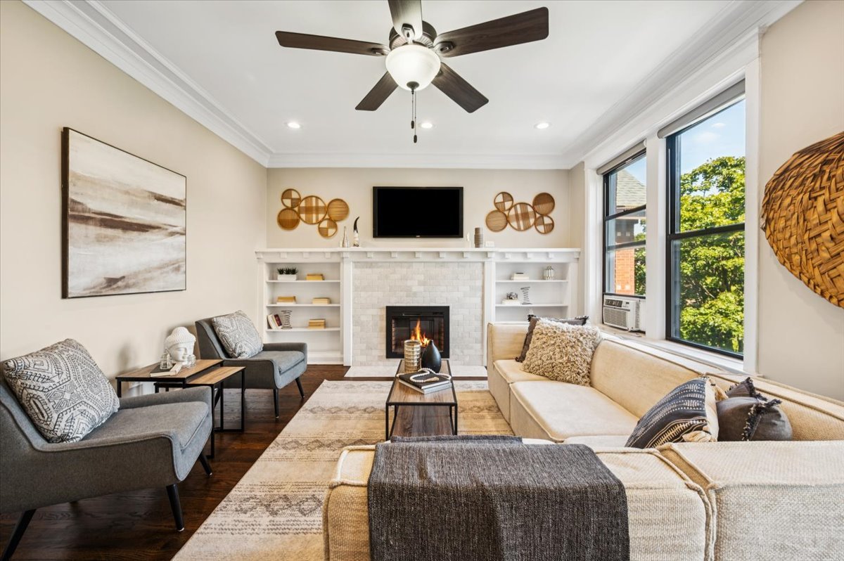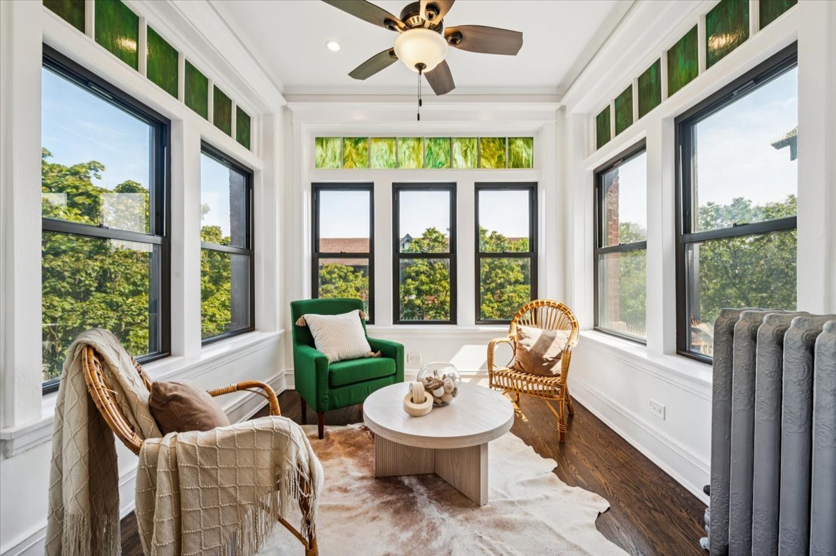 Perched on the top floor of a classic vintage building on a tree-lined, one-way street in the heart of historic Hyde Park-just one block from Obama’s home-this fully renovated 3-bedroom + den, 2-bath condo blends timeless character with modern luxury. As you step inside, you’ll instantly feel welcomed by a flood of natural light, gleaming hardwood floors, and a thoughtful layout, designed to include every living space on your wishlist. Begin your mornings in the charming sunroom, framed by stained-glass accents and treetop views of a leafy, historic boulevard- a serene retreat for quiet reflection. Entertain with ease in the inviting living room, anchored by refinished bookcases and a beautifully tiled decorative fireplace. Gather in the spacious family room and adjacent dining space, offering flexibility for both intimate evenings and lively get-togethers. The designer kitchen will inspire you to try your hand at new recipes, featuring Eclipse cabinetry, premium quartz countertops, a sophisticated backsplash, stainless steel appliances, and a large island with bar seating-perfect for morning coffee and casual conversations. Your tranquil primary suite boasts multiple closets and a private, spa-like bath. Two additional bedrooms and a stylishly remodeled second bath provide versatile spaces to suit every lifestyle need. A dedicated den makes working from home effortless, and the in-unit washer/dryer brings everyday convenience. Your cozy back deck offers the perfect setting for an evening nightcap, while your shared backyard provides an inviting setting to soak in sunny afternoons. Thoughtfully reimagined in 2019, this residence has been completely updated. Highlights include refinished hardwood floors, custom built-out closets, designer lighting, upgraded plumbing and electrical, and new vintage-inspired windows that preserve its architectural soul while adding modern efficiency. Beyond the unit, enjoy a large private storage space, dedicated bike storage, and the ease of ample street parking. Your well maintained condo association just completed roof resurfacing and tuck pointing, while still maintaining healthy reserves- you can also enjoy the flexibility in ownership, with no rental cap. Located in one of Chicago’s most storied neighborhoods, you’ll be surrounded by historic mansions, cultural landmarks, mature trees, and vibrant community events like the Hyde Park Jazz Festival. Just moments from the University of Chicago, Washington Park, the lakefront, and 53rd Street’s shops and dining, this residence offers the perfect balance of history, culture, and convenience. A rare opportunity to own a fully updated Hyde Park penthouse-this timeless classic is not to be missed!
