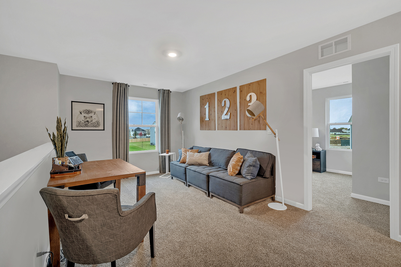 Discover yourself at 516 Adirondack Court in Joliet, Illinois, at our Cedar Creek community. This home is a summer move-in! This large homesite includes a front porch, brick accents, a fully sodded yard located in the cul-da-sac and much more! The Sydney plan is an inviting two-story home designed for modern living. This open concept home features 3 bedrooms, 2.5 baths, 2-car garage with additional storage, and full basement. The Sydney features main level living space which is perfect for entertaining friends and family! The kitchen offers beautiful designer cabinetry and a built-in island with ample seating space, and comes with quartz countertops, stainless steel appliances, and luxury vinyl plank flooring. Upstairs, the oversized primary bedroom features a deluxe bath, walk-in closet, and an additional nook which is perfect for a home office. The secondary bedrooms, a full bathroom, and convenient second floor laundry room complete the rest of the home. Enjoy an additional living space in the newly designed loft area on the upper floor. All D.R. Horton Chicago homes include our America’s Smart Home Technology, featuring a smart video doorbell, smart Honeywell thermostat, smart door lock, Deako smart light switches and more. Photos are of similar home and model home. Actual home built may vary