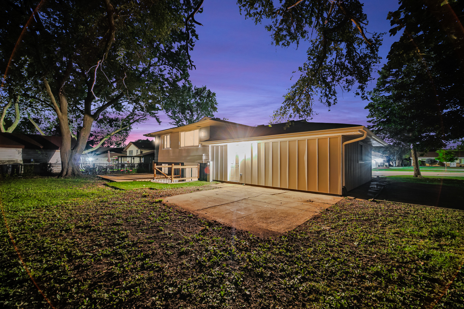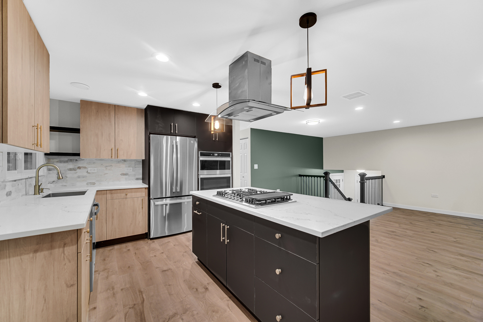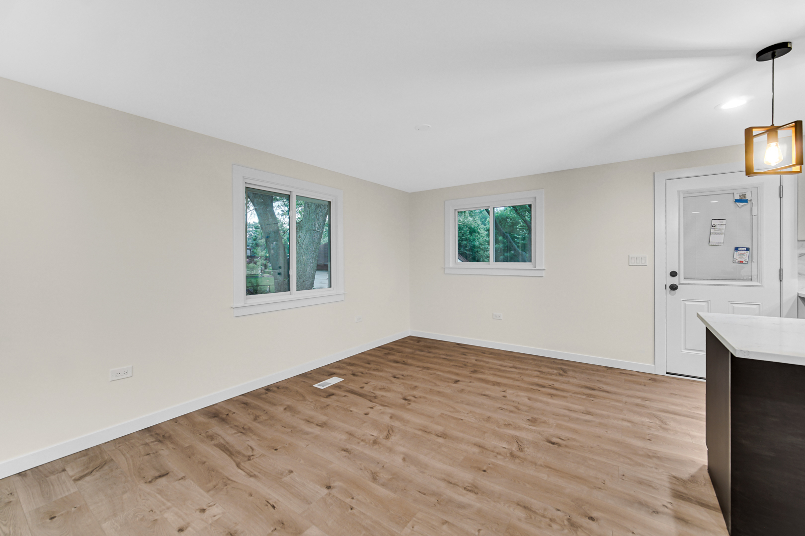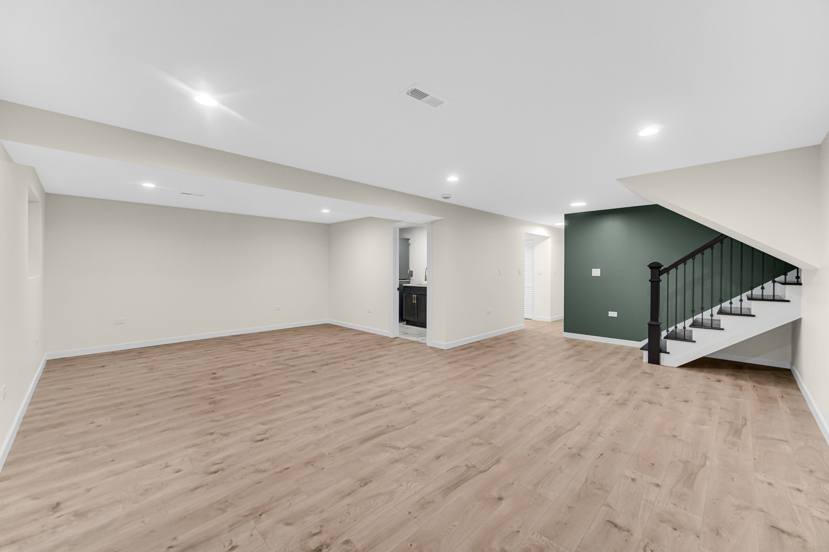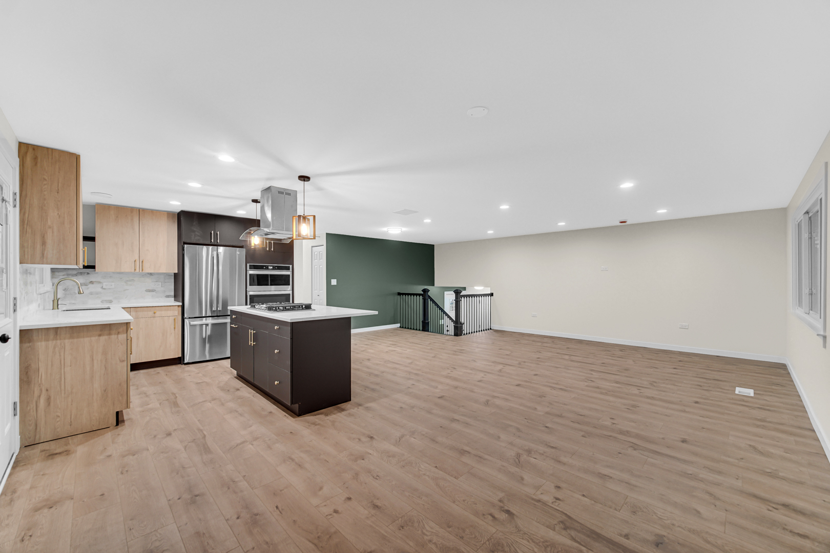 BRAND NEW INTERIOR – FULL TRUE GUT RENOVATION – ALL PERMITS PULLED AND FULL INSPECTIONS DONE – Professionally renovated and rebuilt home – 2025 – Nearly 2200 sqft of high end finishes. 5 bedrooms and 2 full baths. BRAND NEW plumbing, electric, drywalls, framing, insulation, flooring, windows, kitchen, bathroom, doors – literally NEW HOUSE on the inside. STUNNING renovation. OPEN concept layout. West facing home with incredible sunlight throughout the day. Extra long driveway + 2.5 car spacious attached garage. Stunning wood laminate floors. All new modern lighting. High end 2 tone cabinetry with soft close cabinets, dedicated vent exhaust, quartz counter tops and marble back splash. Built in oven/microwave combo. BIG brand new windows grace all the bedrooms. 5 total bedrooms – 3 on the main level and 2 on the lower level. Main level bathroom has designer finishes. Gorgeous porcelain wall tiles. Everything is up to 2025 code as per Village of Schaumburg requirements. Lower level walk out basement has a massive entertaining room fit. Lower level bathroom is also high end. DEDICATED laundry room with sink, stacked upgraded washer and dryer + cabinets and ironing space + long term storage/pantry. 2 additional bedrooms with closets and windows where 1 is perfect for a home office/den/gym area. Or use 1 bedroom upstairs as your huge walk in closet and use 2 bedrooms in the walk out lower level with full sized windows. GREAT use of space. Exterior has all new lighting making the house SHINE at night. BRAND new deck in the backyard is ready to enjoy. Fully fenced in yard. One of the best renovations at this price point. Better than new construction houses. WHAT a home!