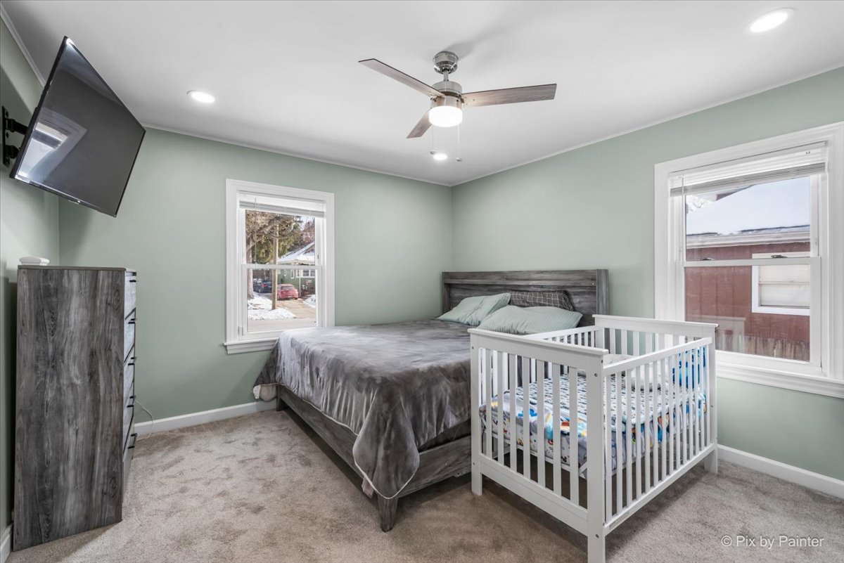 Spacious, move-in ready ranch home with a finished basement, large fenced yard, and outdoor entertaining space. This well-maintained home offers a bright open-concept main level featuring hardwood floors, recessed lighting, and large windows that provide abundant natural light throughout the living and dining areas. The updated kitchen showcases painted cabinetry, stainless steel appliances, tile backsplash, generous counter space, and an eat-in dining area. Neutral paint tones and clean finishes create a warm, modern feel across the main level. Main-level bedrooms are well-sized with newer carpeting, ceiling fans, ample closet space, and natural light. The updated full bathroom features a modern vanity, tiled flooring, and a tiled tub/shower surround. The finished basement adds excellent additional living space, including a large family/recreation room with recessed lighting, bonus rooms ideal for guests or home office use, a second bathroom area, and a dedicated laundry room with cabinetry and storage. An unfinished utility/storage area provides even more flexibility. Recent exterior improvements include a new roof, new gutters, and new window wraps, enhancing both curb appeal and peace of mind. Step outside to enjoy a wood deck, perfect for relaxing or entertaining, overlooking a fully fenced backyard with plenty of space for outdoor activities. The property also includes an attach two-car garage and a wide concrete driveway offering ample parking. Situated on a corner lot in a quiet residential neighborhood, this home shows pride of ownership and offers great indoor and outdoor living space.