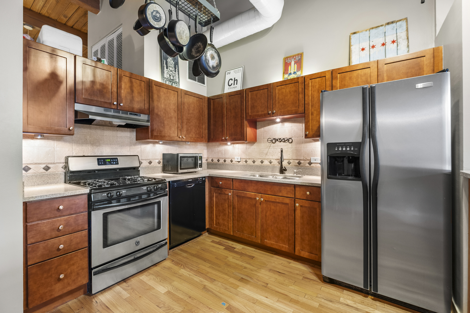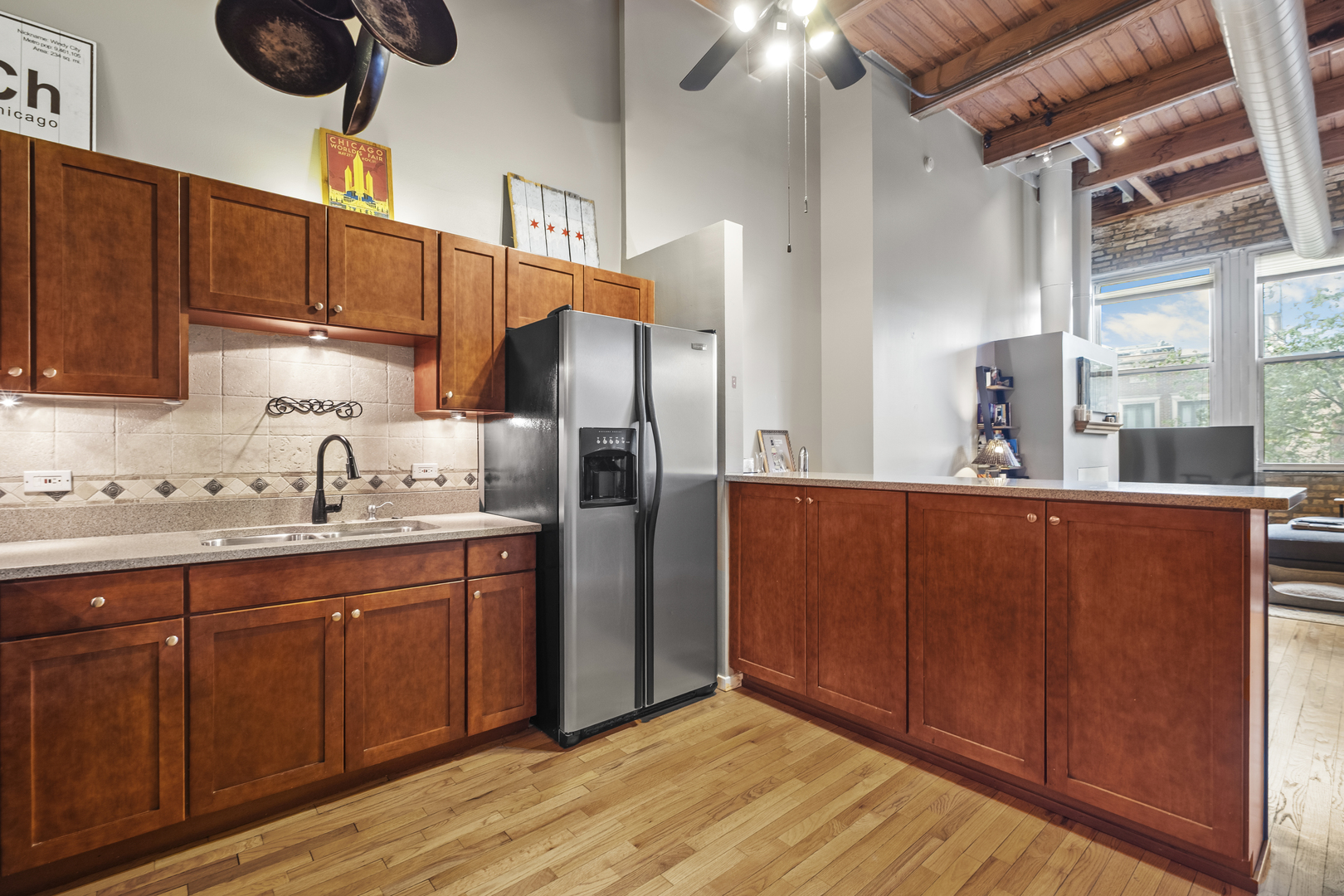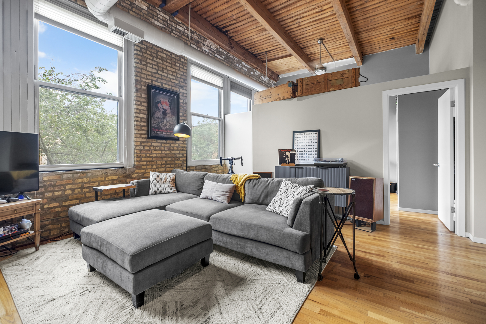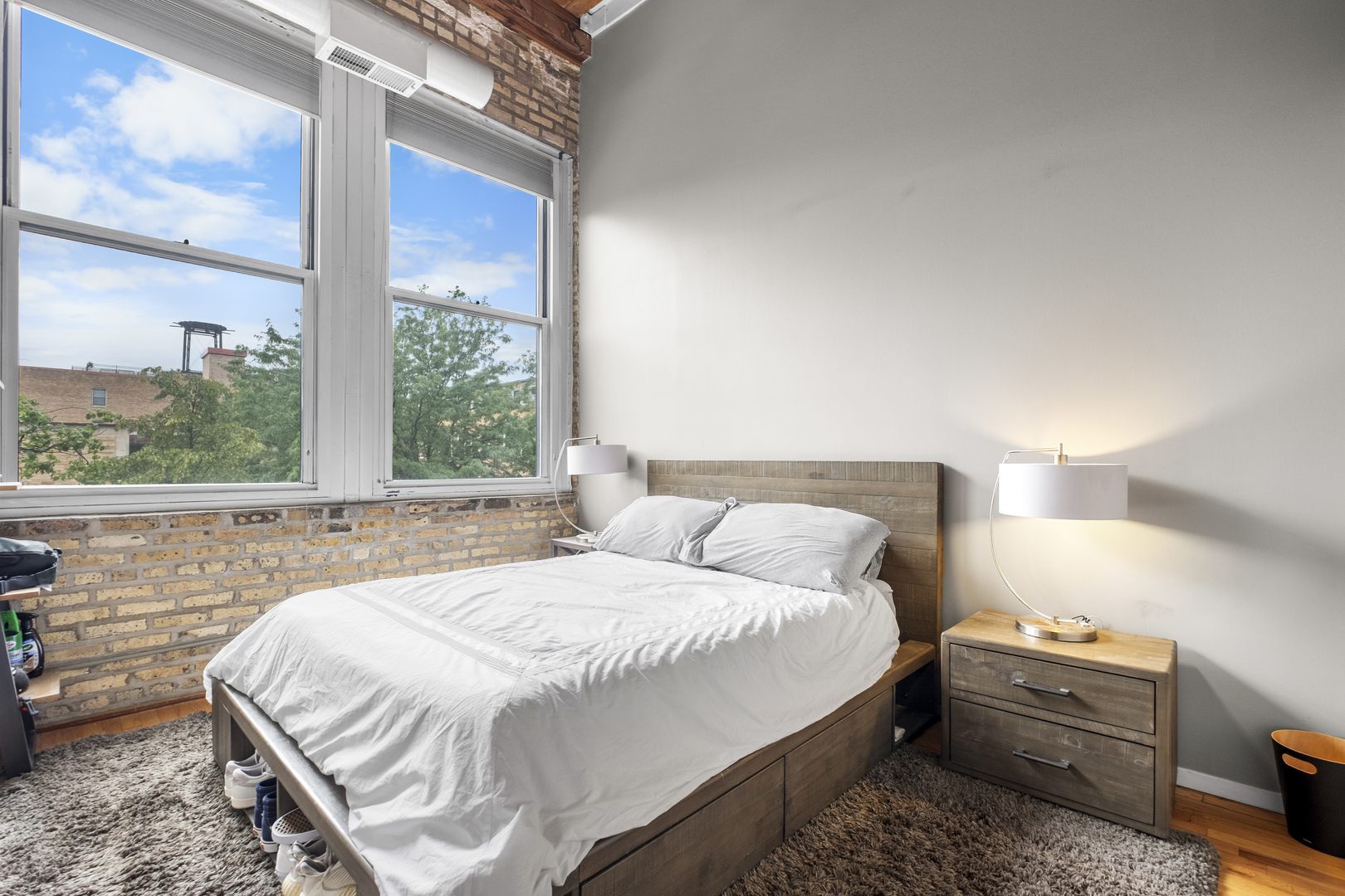 Welcome to this beautifully updated 2-bedroom, 1-bath loft tucked away on a quiet, tree-lined street in the heart of charming West Town. Located in the highly sought-after Ada Street Lofts, this home features soaring 14-foot timber ceilings, exposed brick walls, hardwood floors, and a cozy wood-burning fireplace-perfect for relaxing or entertaining. The timeless kitchen offers granite countertops, rich cabinetry, and stainless steel appliances. Enjoy the comfort of in-unit laundry and abundant storage throughout, including a walk-in closet and oversized windows that flood the space with natural light. Thoughtfully constructed with concrete flooring between levels for enhanced sound insulation, this well-maintained building also offers a shared rooftop deck with panoramic views of the city skyline. Gated parking is included, with easy access to the expressway, downtown, and public transportation. New AC unit this year!