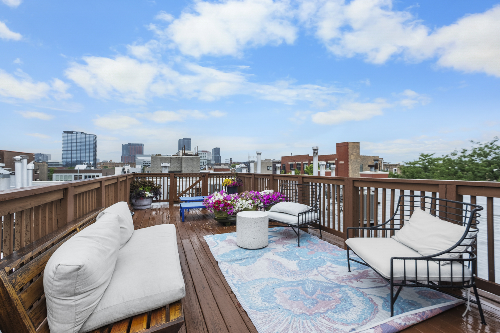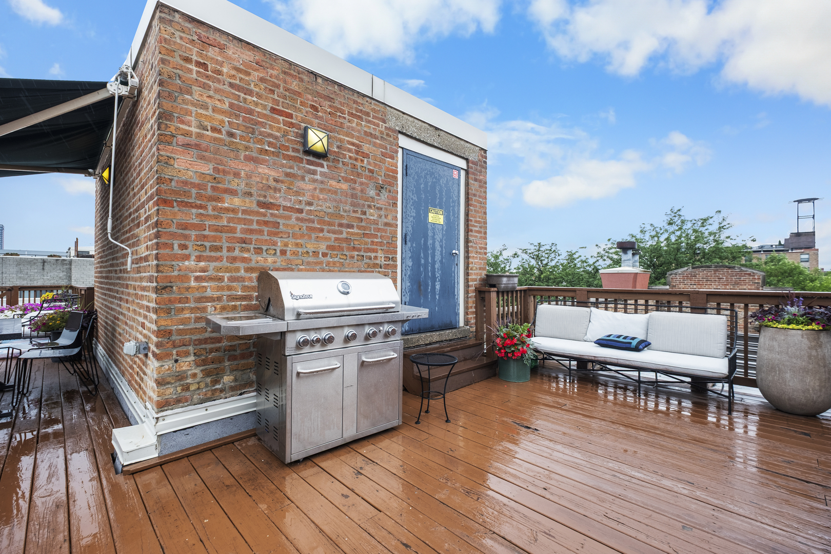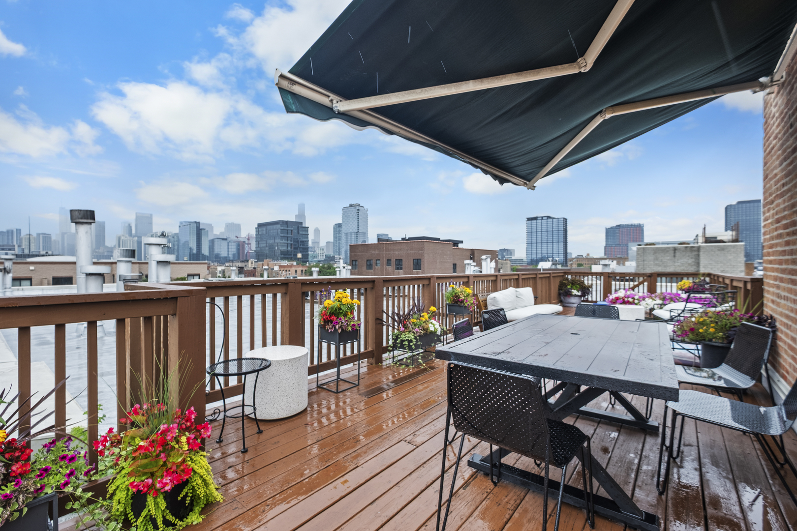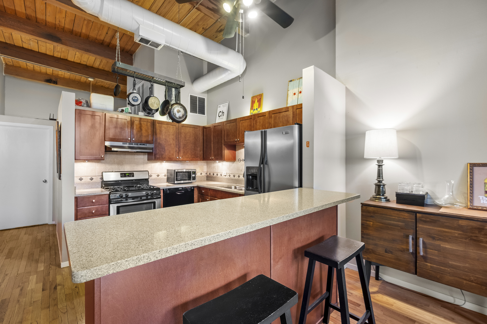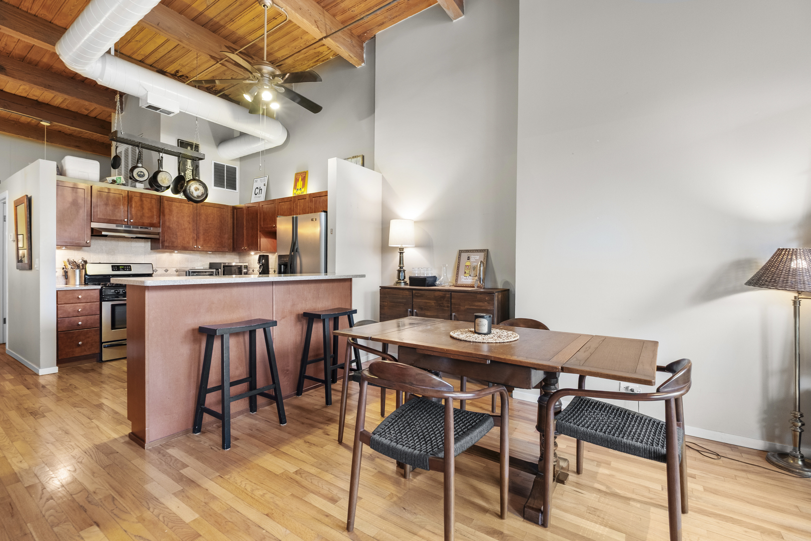Welcome to this beautifully updated 2-bedroom, 1-bath loft tucked away on a quiet, tree-lined street in the heart of charming West Town. Located in the highly sought-after Ada Street Lofts, this home features soaring 14-foot timber ceilings, exposed brick walls, hardwood floors, and a cozy wood-burning fireplace-perfect for relaxing or entertaining. The timeless kitchen offers granite countertops, rich cabinetry, and stainless steel appliances. Enjoy the comfort of in-unit laundry and abundant storage throughout, including a walk-in closet and oversized windows that flood the space with natural light. Thoughtfully constructed with concrete flooring between levels for enhanced sound insulation, this well-maintained building also offers a shared rooftop deck with panoramic views of the city skyline. Gated parking is included, with easy access to the expressway, downtown, and public transportation. New AC unit this year!