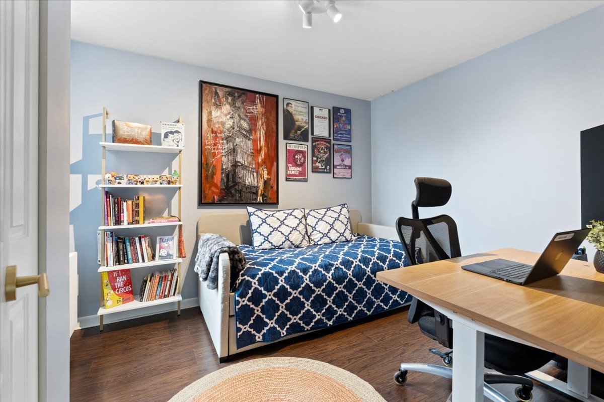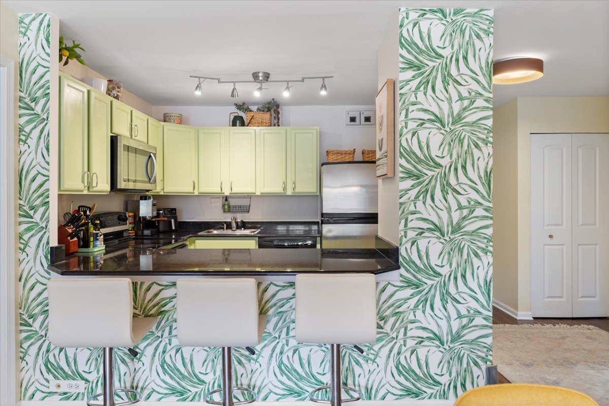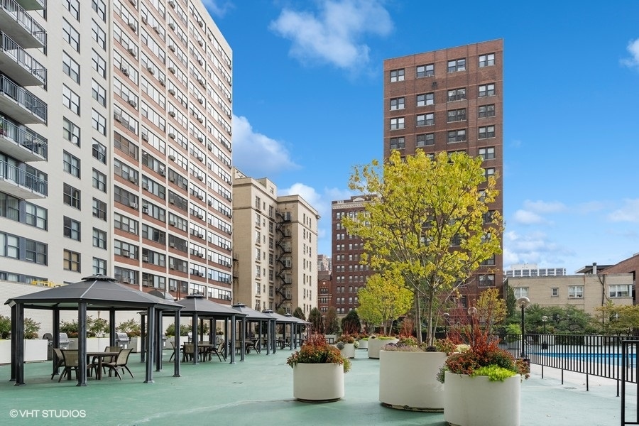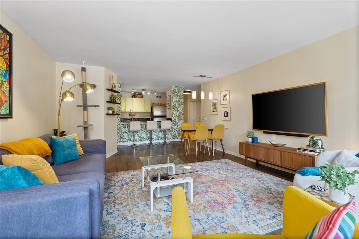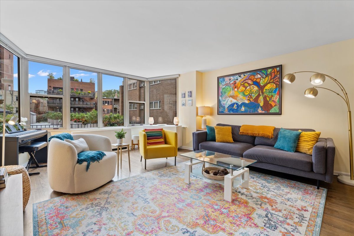SUN-FILLED TWO-BEDROOM, ONE-BATHROOM CONDO in one of East Lakeview’s most desirable full-amenity buildings – 525 W HAWTHORNE. This south-facing home features an inviting open-concept living and dining area framed by lush, landscaped urban views-perfect for relaxing or entertaining. Enjoy hardwood floors throughout the main living area. The striking great room allows for large-scale furniture and a full dining setup. The cheery kitchen offers granite countertops and stainless-steel appliances for those who like to cook. The updated bathroom offers a soaking tub, modern vanity, and contemporary lighting and mirror. The king-sized primary bedroom boasts both a walk-in closet and an additional wall closet, while the queen-sized second bedroom functions beautifully as a guest room or home office. One deeded garage parking space is included in the price. Storage cage on same floor. Residents of 525 W Hawthorne Place enjoy an array of amenities including 24-hour door staff, on-site engineer, outdoor pool and sundeck, fitness center, and package receiving room. Situated in the heart of East Lakeview, you’re steps from the lakefront, dining, shopping, and easy transportation options.