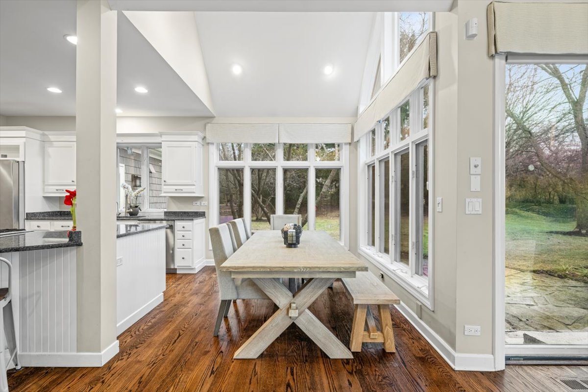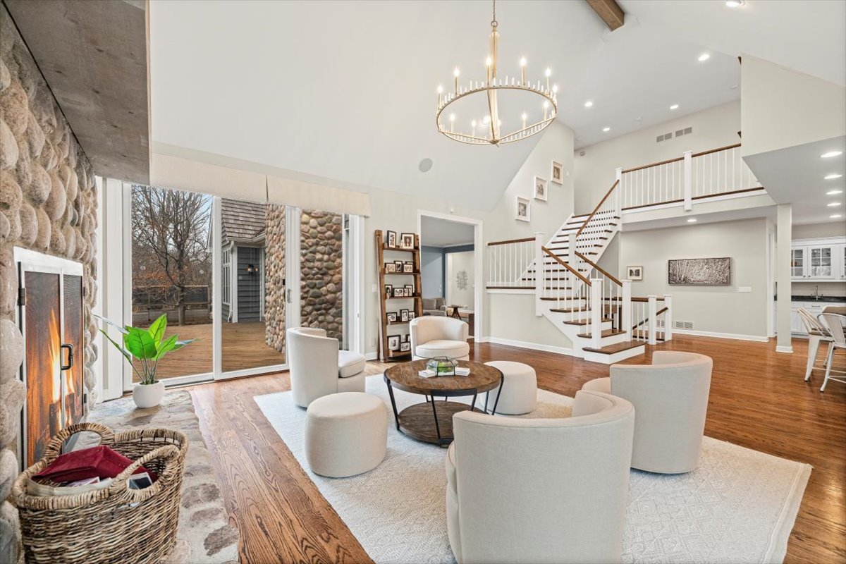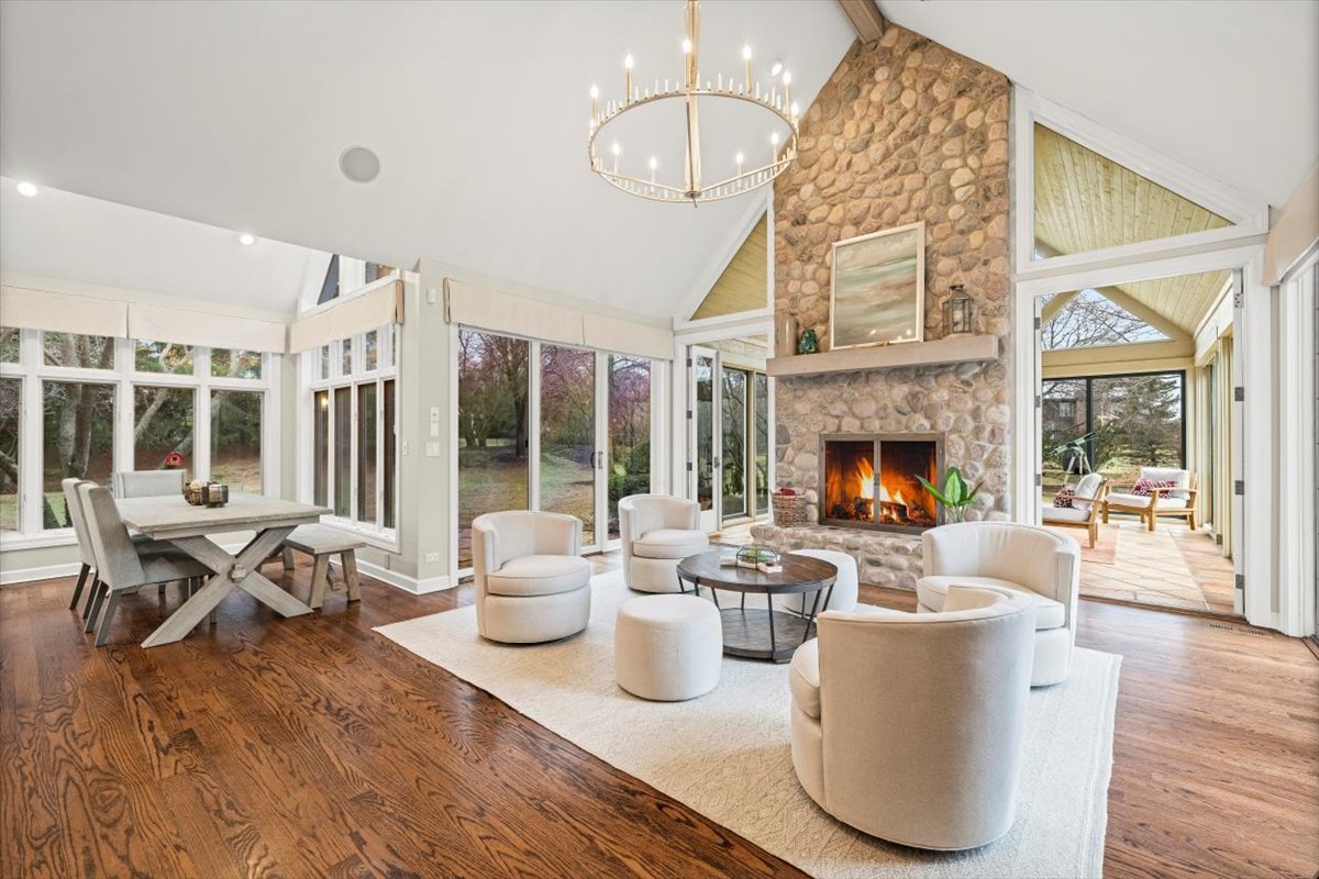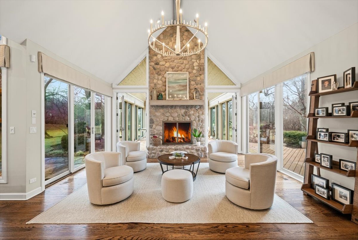 Striking Nantucket-style home set on a beautifully landscaped, private 1.5-acre lot in highly desirable Lake Forest, offering timeless curb appeal and a serene setting within the top ranked Lake Forest High School and Everett Elementary School district. A covered front porch and charming window boxes create a warm, welcoming first impression and classic North Shore appeal. Inside, vaulted ceilings, elegant 8-foot doors, and hardwood floors throughout enhance a grand, open floor plan ideal for entertaining. Expansive floor-to-ceiling windows flood the home with natural light, creating bright, inviting living spaces with seamless flow. The kitchen is the heart of the home, featuring custom Wood-Mode cabinetry, a large center island with breakfast bar, and a walk-in pantry. It opens to an inviting family room anchored by a dramatic stone fireplace-perfect for everyday living and gatherings. Just beyond, the sunroom offers radiant heated floors and three walls of expansive sliding glass doors, blending indoor and outdoor living and providing an ideal space for family time and entertaining. The main-level primary suite serves as a peaceful retreat with a spa-inspired bath including heated floors, a jacuzzi tub, separate shower, and walk-in closet. A private first-floor office offers excellent flexibility for remote work, study space, or a playroom. The second level features three generously sized bedrooms, a loft area, and two full bathrooms, offering ample space for family and guests. The finished lower level expands the living area with a temperature-controlled wine room, recreation space, exercise area, and abundant storage-ideal for growing families and active lifestyles. Additional highlights include a heated three-car garage, new roof (2023), and freshly painted exterior (2025). Ideally located near Metra service, highway access, shopping, award-winning Lake Forest schools, Conway Farms Golf Club, and Northwestern Medicine Lake Forest Hospital. A rare opportunity to own a move-in-ready luxury home in Lake Forest-offering space, privacy, and timeless design in one of the North Shore’s most sought-after communities.