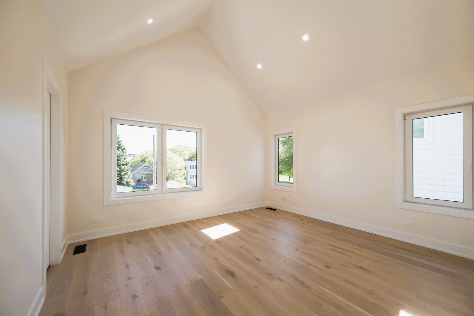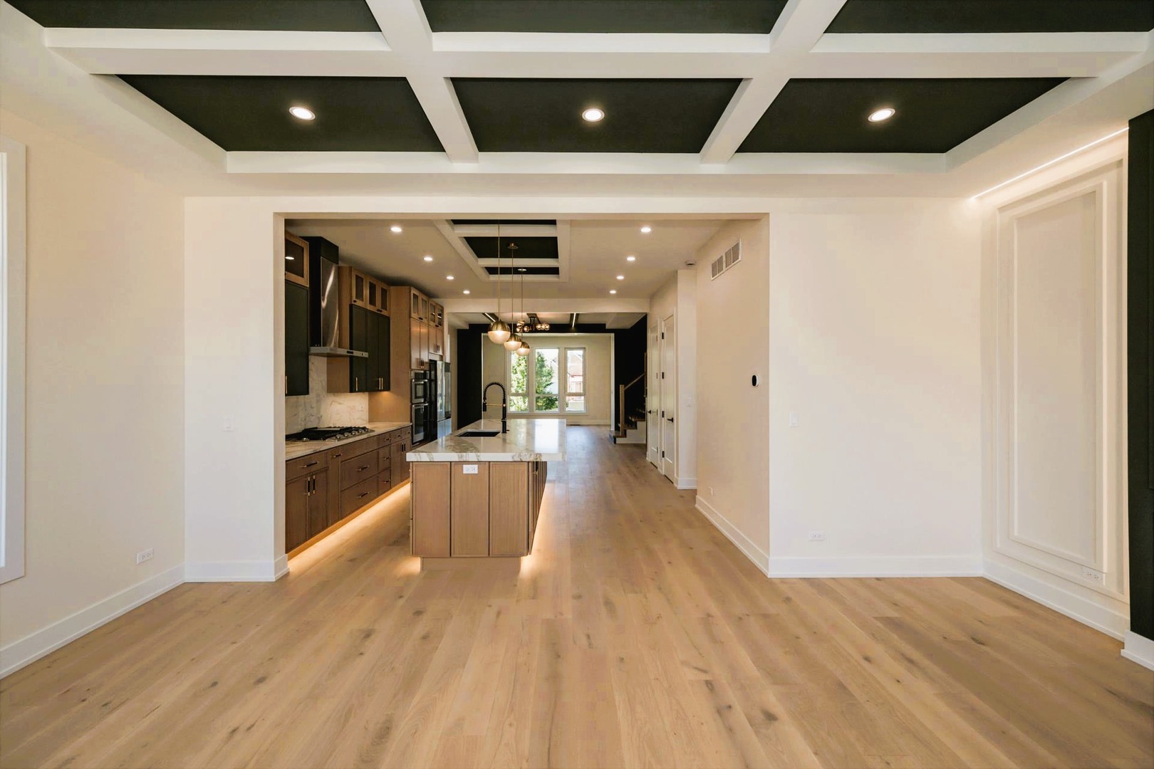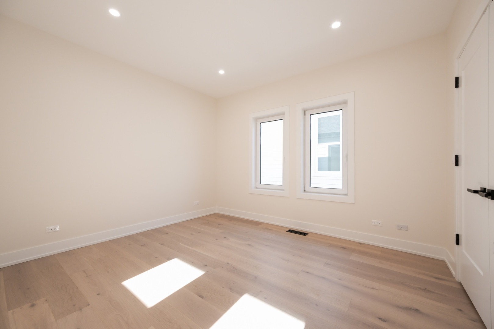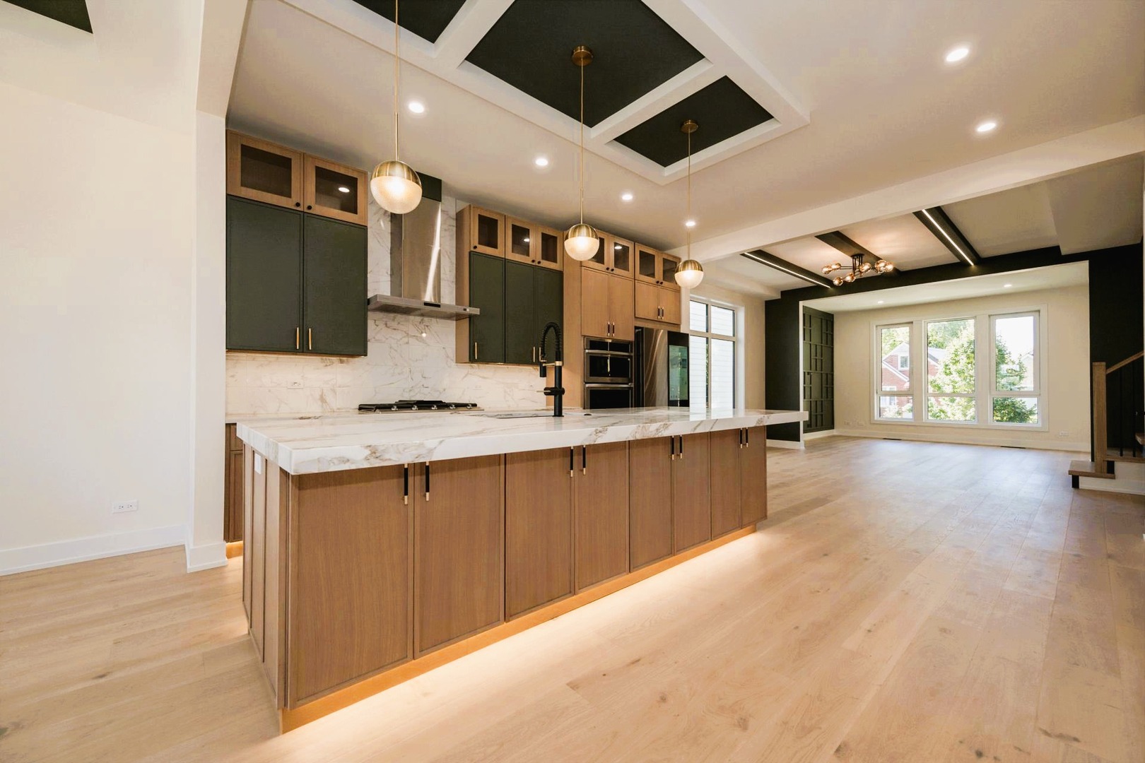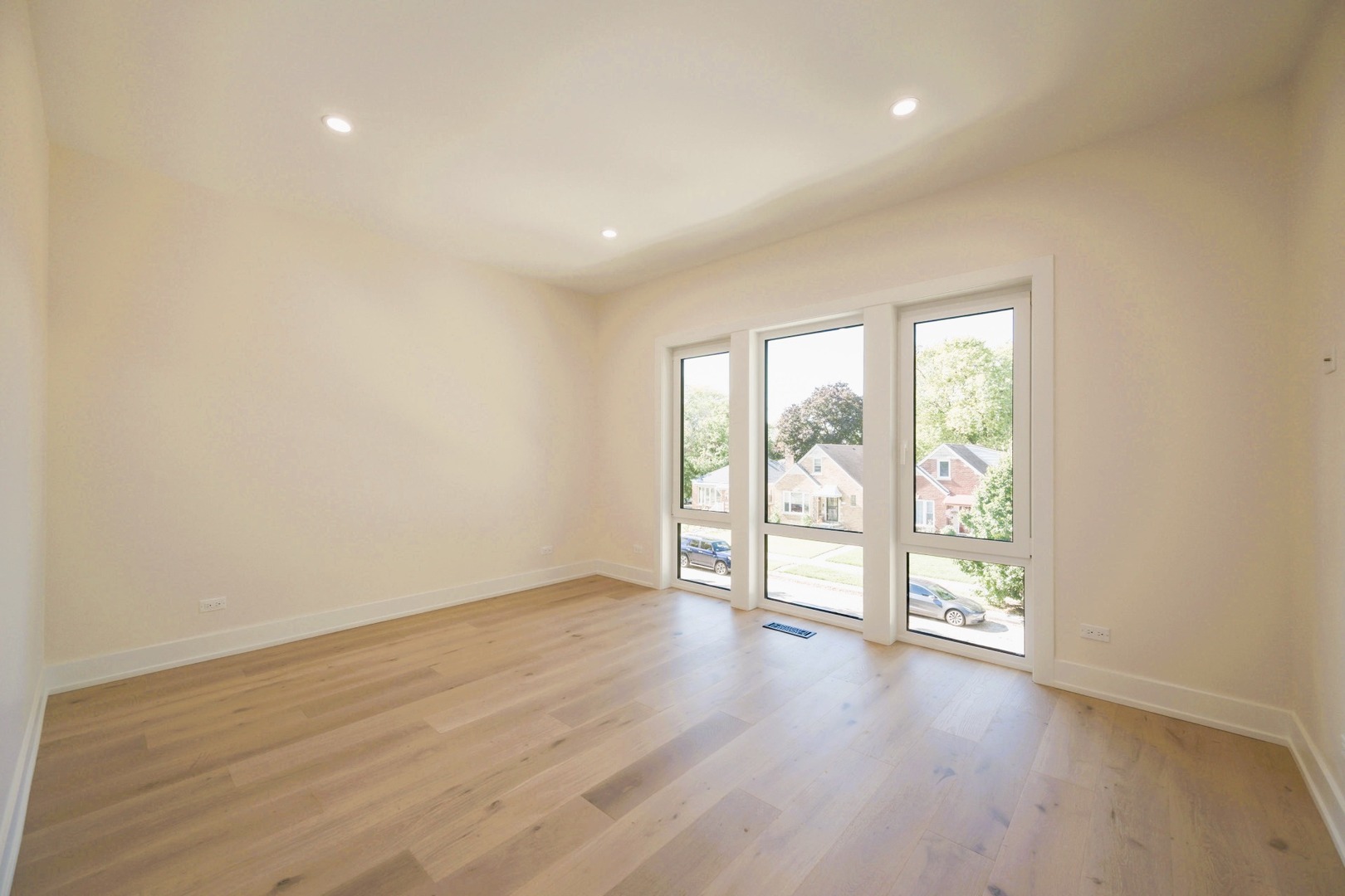 Introducing an extraordinary new construction home offering over 3,700 sq. ft. of luxurious living space in Chicago’s highly desirable Jefferson Park neighborhood-affectionately known as “The Gateway to Chicago.” Perfectly blending modern sophistication with everyday functionality, this exceptional three-level residence features 5 bedrooms, 3.5 baths, and a 2.5-car finished garage equipped for an electric car plug, all situated on a professionally landscaped 30’x153′ lot. The main and second levels showcase engineered hardwood flooring, soaring 10-ft ceilings, and a grand oak staircase with custom railings and metal balusters. The chef’s kitchen is a true showpiece with two-toned soft-close cabinetry, 60″ upper cabinets with glass displays, deep drawers, exotic quartz countertops, and a 10-ft island with seating for eight, complemented by high-end stainless steel appliances, double pantries, under-cabinet LED lighting, and pendant fixtures. The open floor plan flows into a bright living area with custom accent wall and triple-glazed Low-E Energy Star certified windows, an elegant dining space with a beamed LED-lit ceiling, and a family room centered around a floor-to-ceiling fireplace and coffered ceiling. Upstairs, the luxurious primary suite features a 14-ft vaulted ceiling, two walk-in closets, and a spa-inspired bath with a walk-in shower (low 3″ lip and bench), soaking tub, and 8-ft double vanity. Two additional bedrooms, a full bath, and a skylit hallway complete this level. The lower level, finished with Benton Blonde Luxury Vinyl Plank flooring and 8.7-ft ceilings, offers a spacious rec room, two bedrooms, full bath, and an impressive wet bar with 42″ tall cabinets, quartz counters, and ceiling-height backsplash. Additional features include spray foam insulation, triple-glazed tilt-in windows, two high-efficiency HVAC systems with humidifiers, 400-amp electrical service, RING doorbell, and solid-core doors. Exterior amenities include floating metal and concrete steps, an 11’x22′ concrete patio with gas line for grill, new sod, privacy fence, and architectural LED strip lighting accenting both interior and exterior spaces. Ideally located near Austin-Foster Park, Metra, CTA, top-rated schools, shopping, and dining, this home exemplifies contemporary luxury and timeless elegance in one of Chicago’s most sought-after communities.