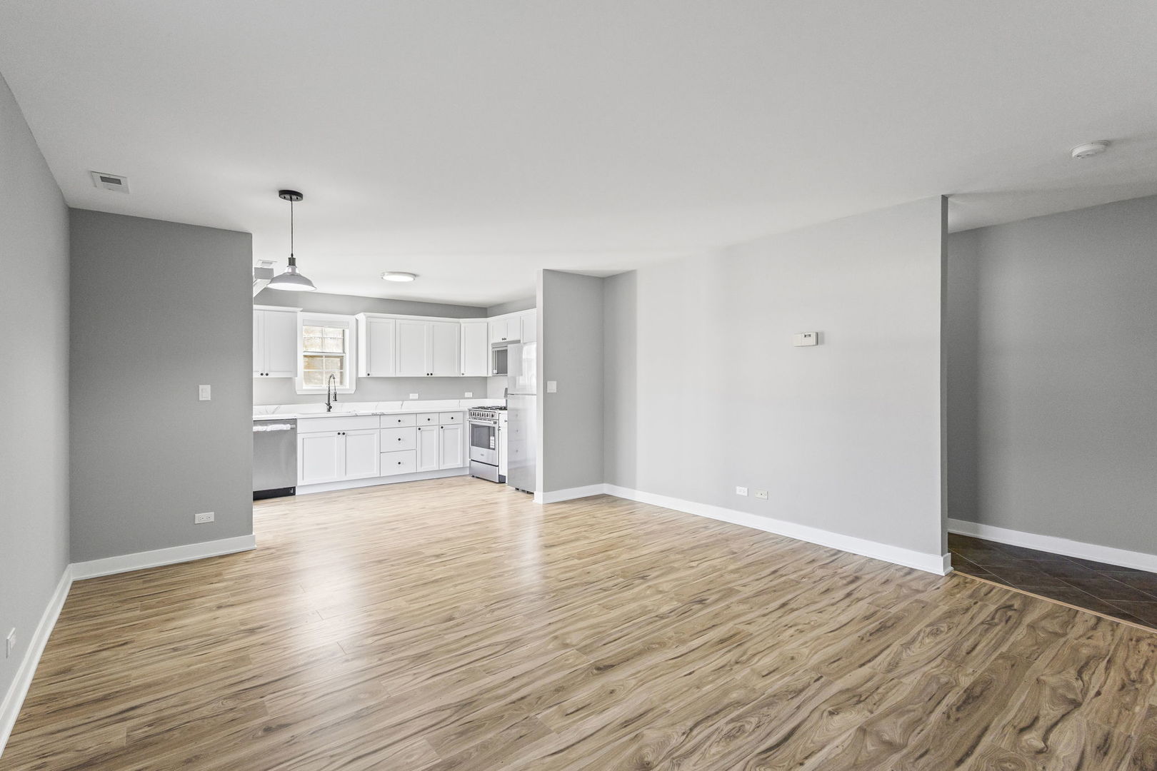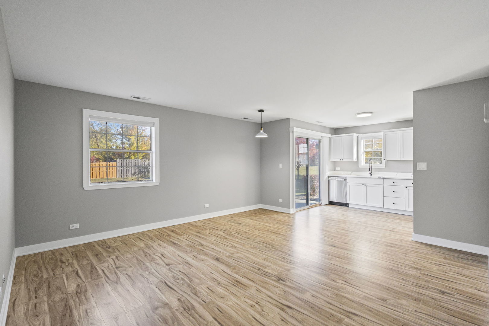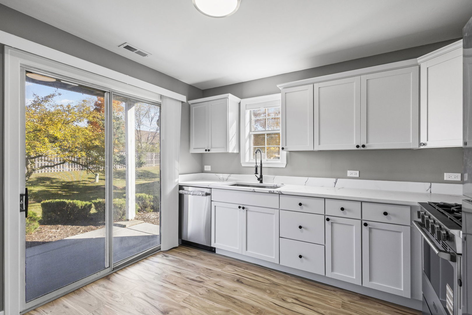 Look no further! Spacious two bed, two full bath ground level condo in move-in condition. UPGRADES:new kitchen cabinets, quartz countertops, SS appliances, Kraus sink and disposal, modern light fixtures. Bathrooms feature large-format tiles, new vanities and trending finishes. Bedrooms are generously sized with new flooring and trim and walking closets. All interior doors, casing and locks replaced with contemporary styles. Private utility/laundry room with washer/dryer and extra space. Garage plus extra parking in driveway plus storage room inside garage. Brand new concrete patio for your outdoor enjoinment. HOA includes:water, scavenger, snow removal, landscaping, common insurance. Pet friendly. Fantastic location near shops, restaurants, parks and expressways. Come check it out today!