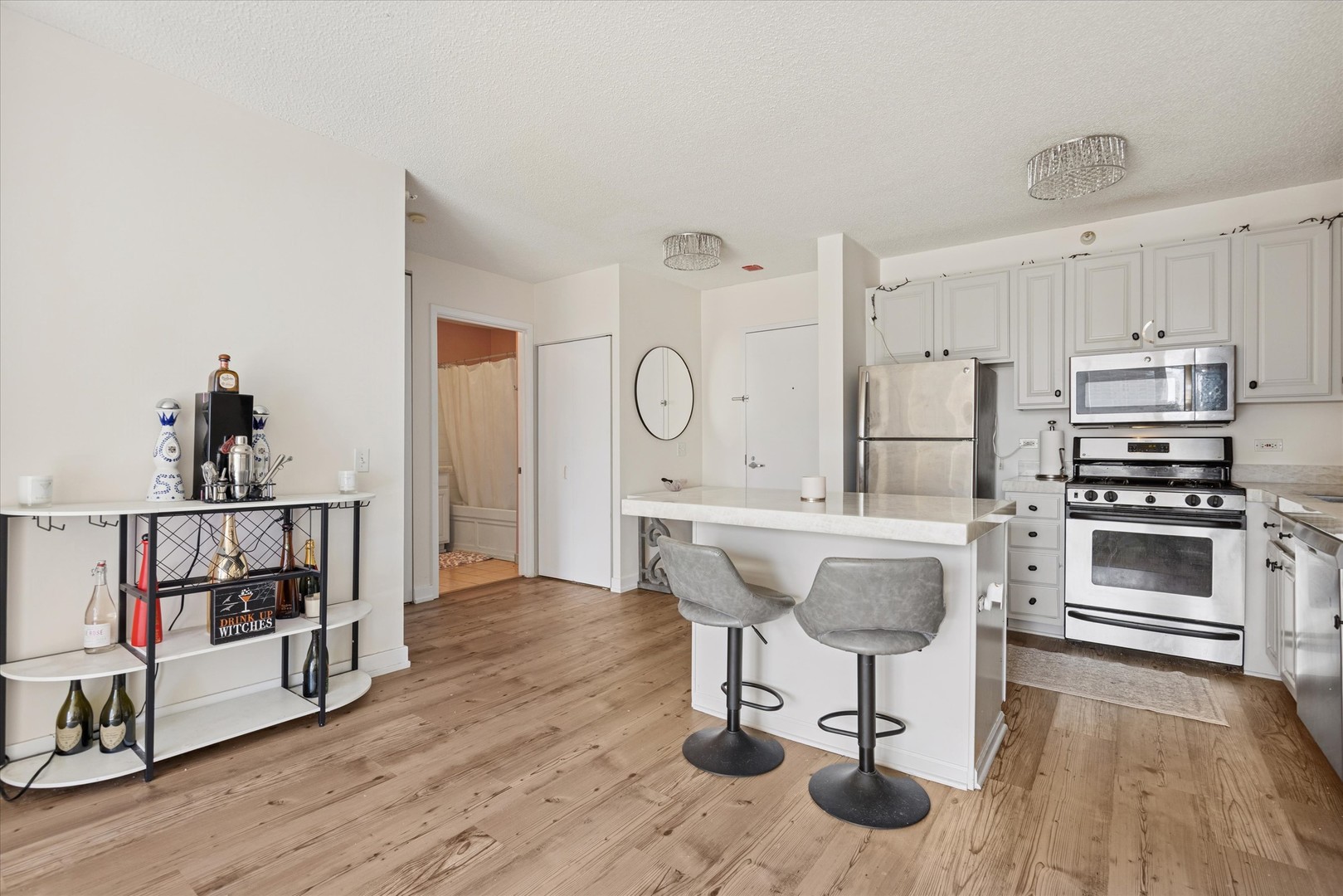Discover a rare opportunity to be on the penthouse-floor at Grand Plaza. Welcome to Residence 3206, where contemporary design meets urban sophistication. This beautifully designed 850 sq. ft. one-bedroom condo offers sweeping south-facing views of Chicago’s skyline and iconic architecture, delivering an unmatched elevated living experience. The open layout features 9-foot ceilings, brand-new flooring, and expansive windows that fill the home with natural light. The updated kitchen offers a perfect blend of style and functionality with new high end glacier granite countertops, stainless steel appliances, and a versatile island for dining or entertaining. Retreat to a spacious primary suite that comfortably fits a king-sized bed and includes a walk-in closet for exceptional storage. Additional highlights include in-unit laundry and a private balcony ideal for grilling or taking in the skyline views from above. Residents of the Grand Plaza enjoy access to 50,000 sq. ft. of premium amenities, including a 24-hour door staff, outdoor pool and sundeck, fitness center, indoor running track, basketball court, sauna and steam room, media and business rooms, package receiving, and on-site dry cleaning. Perfectly positioned in River North, you’ll be steps from top restaurants, shopping, and nightlife, with everything downtown Chicago has to offer right outside your door. Experience the perfect blend of luxury, comfort, and convenience at Residence 3206, Grand Plaza-a truly rare opportunity on the penthouse floor in the heart of downtown Chicago.