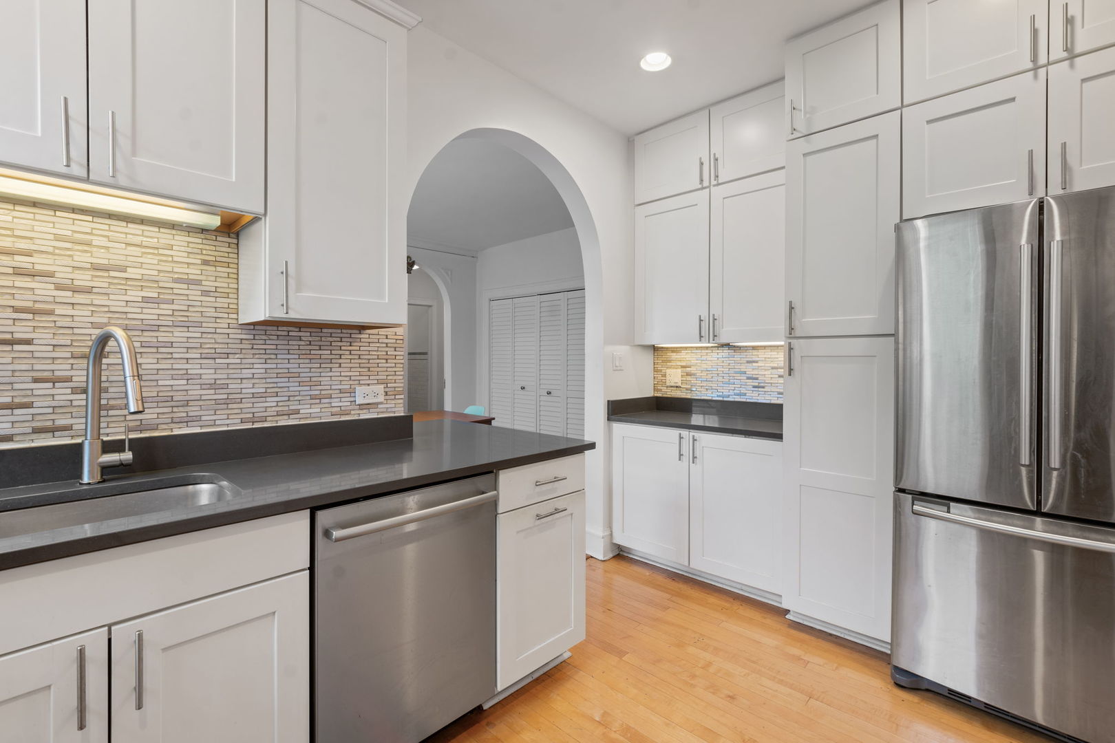 Vintage charm abounds in an oversized 2 bed/2 bath condo right near Lake Michigan. Beautiful archways, crown moldings, picture frame trim, and high ceilings throughout. Spacious living room that can host your largest gatherings. Enjoy the courtyard view, built-in wrap around bookcase and decorative fireplace. A renovated kitchen awaits with white cabinets, soft close drawers, pull-out shelves, quartz countertops, undermount sink, stainless steel appliances, and under-cabinet lighting. Super-sized bedrooms with the primary bedroom featuring an en-suite updated bath. In-unit side-by-side washer/dryer, private 1-car garage, and a private storage locker. Close to Lake Michigan, South Boulevard Beach, Northwestern University, Rogers Park, the CTA Purple Line and Metra, restaurants, and shopping. Note dining room light fixture excluded.