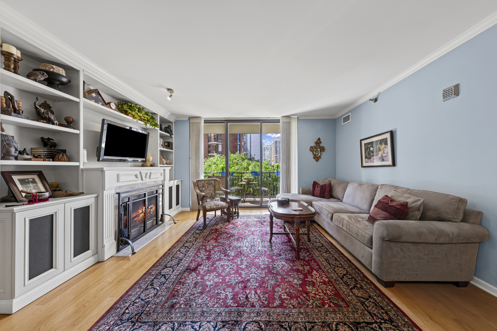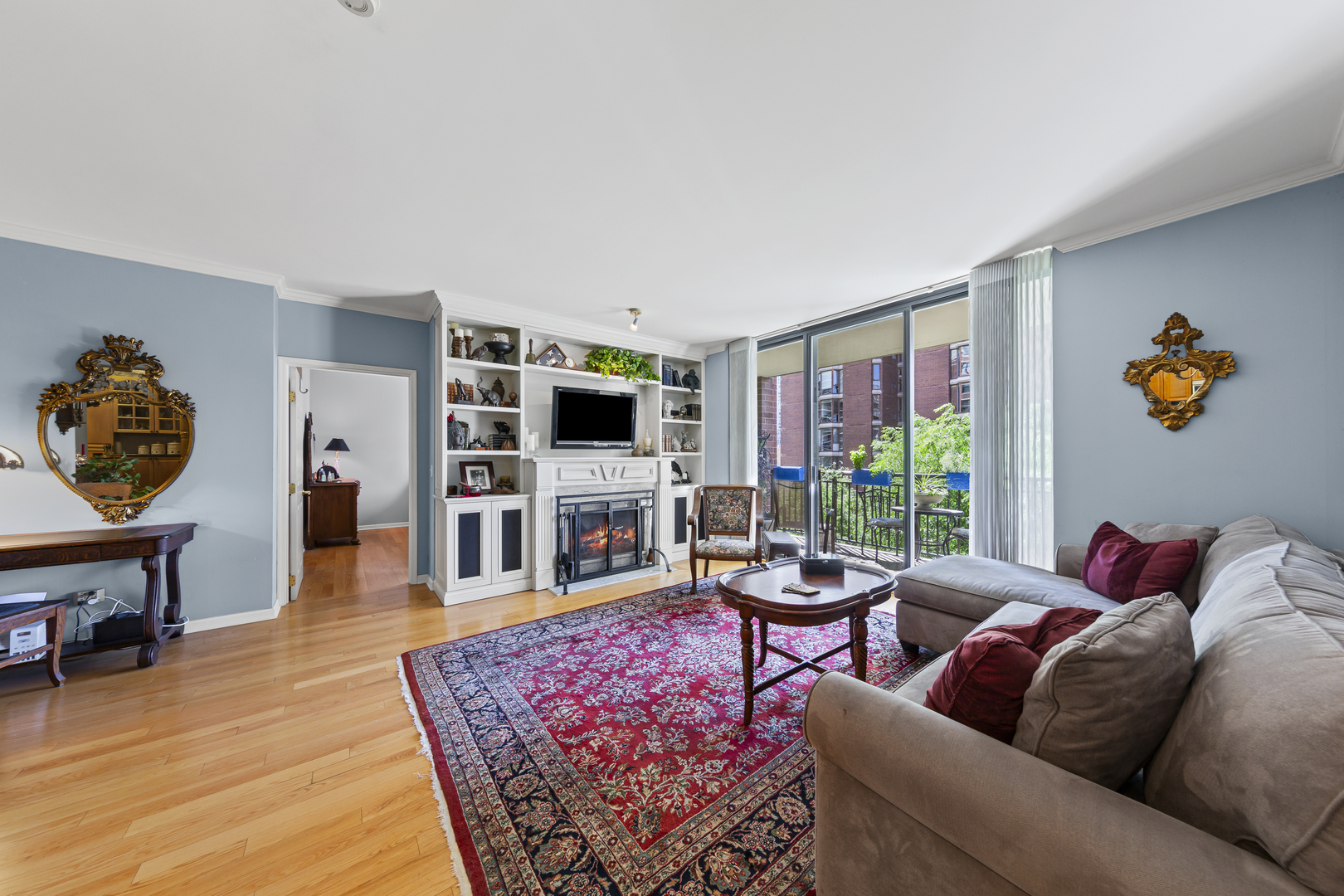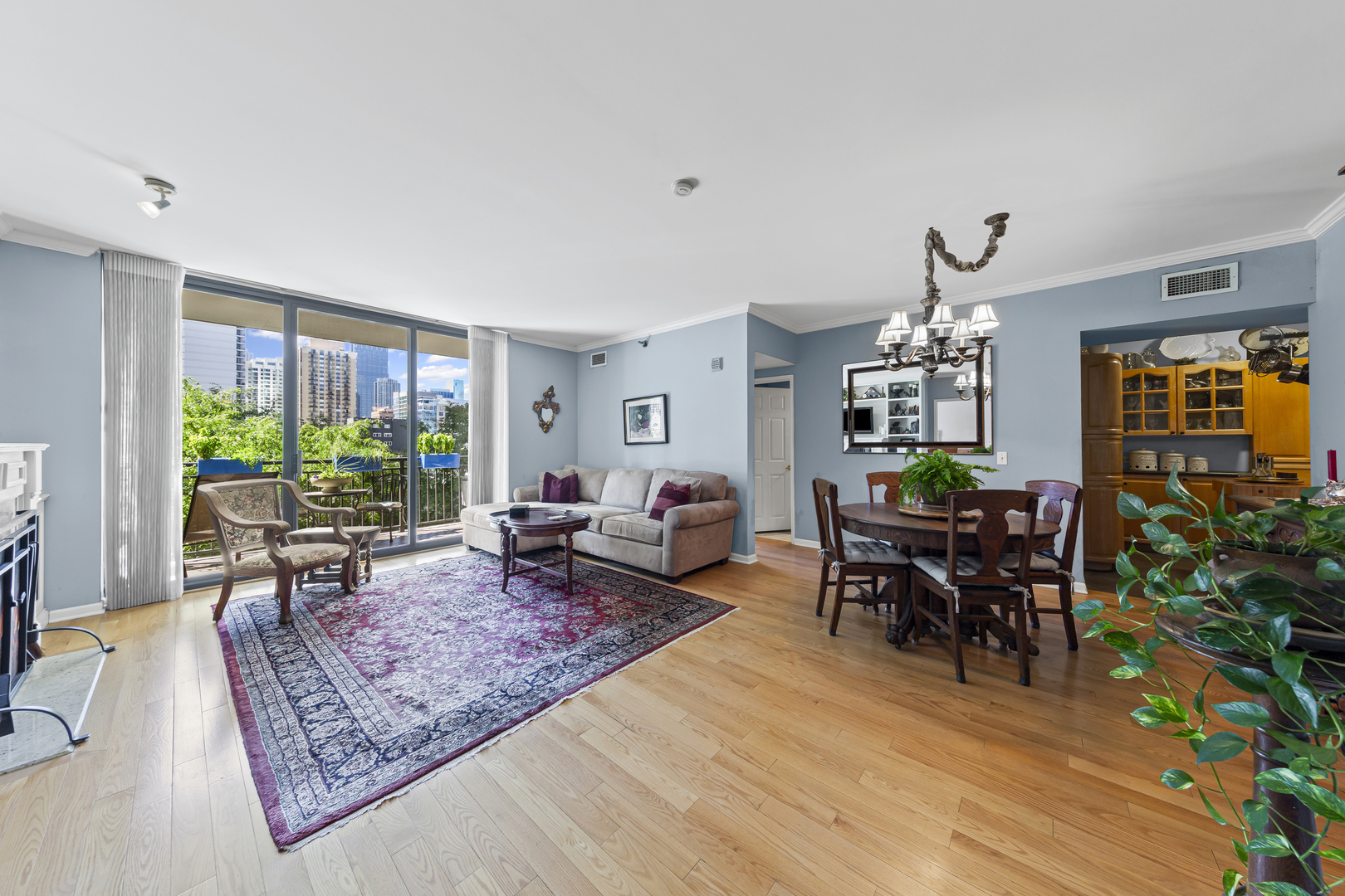 Welcome to the prestigious full amenity Park Newbury, a luxury condominium complex by the renowned Loewenberg & Associates overlooking Washington Square Park and the historic Newbury Library. The building exterior exudes opulence and grace with the center fountain and professionally landscaped gardens. Enter through the recently renovated lobby and be greeted by the professional, 5 star 24-hr door staff (truly the friendliest door staff in the city!) Head up the elevators to unit #608, one of the largest 2 bedroom floor plans in the building with skyline and treetop views for miles. An expansive chef’s kitchen, appointed with warm honey-toned wood cabinetry and sleek granite countertops (PLUS an under counter wine fridge) opens seamlessly to the dining and family rooms-both accented with gleaming hardwood floors and extending out to a remarkable 18-foot balcony. Curl up on the couch in front of the fireplace in the coming cold months while gazing out over the balcony to the city beyond. Just off the kitchen, a versatile bonus room offers endless possibilities – currently designed as a chef’s prep area with additional custom cabinetry and ample counter space, it could easily serve as a third bedroom, private home office, or charming breakfast nook (in addition to the full dining room). The thoughtful split floor plan enhances privacy, ensuring no shared walls between the two bedrooms. The primary is adorned with two extra large walk in closets, a large set of windows overlooking the skyline, and a huge primary bathroom with separate shower and double sinks. The large second bedroom is also outfitted with a large, built out walk in closet and is positioned right next to the guest bath for convenience. Deeded prime parking spot #16 is included with the price. This well planned building has 5 elevator banks, a larger than life state of the art fitness center, a renovated party room, business center, two sundecks, a receiving room, and an onsite dry cleaners. Private MASSIVE 80 sq. ft. storage room with a steel door included in the price. The Park Newbury is dog friendly, has onsite management, and an onsite engineer. Walk to the Mag Mile, Oak Street Beach, and all of the shops and restaurants you could imagine. Please exclude the butcher block counter in the current breakfast nook.
