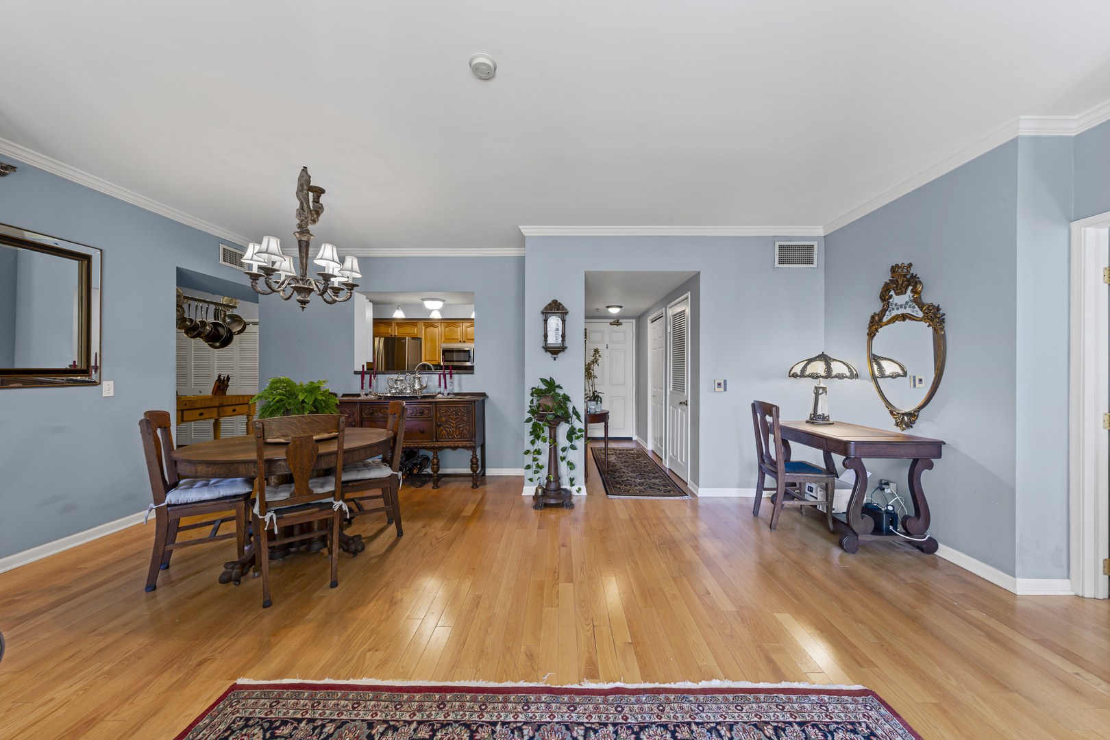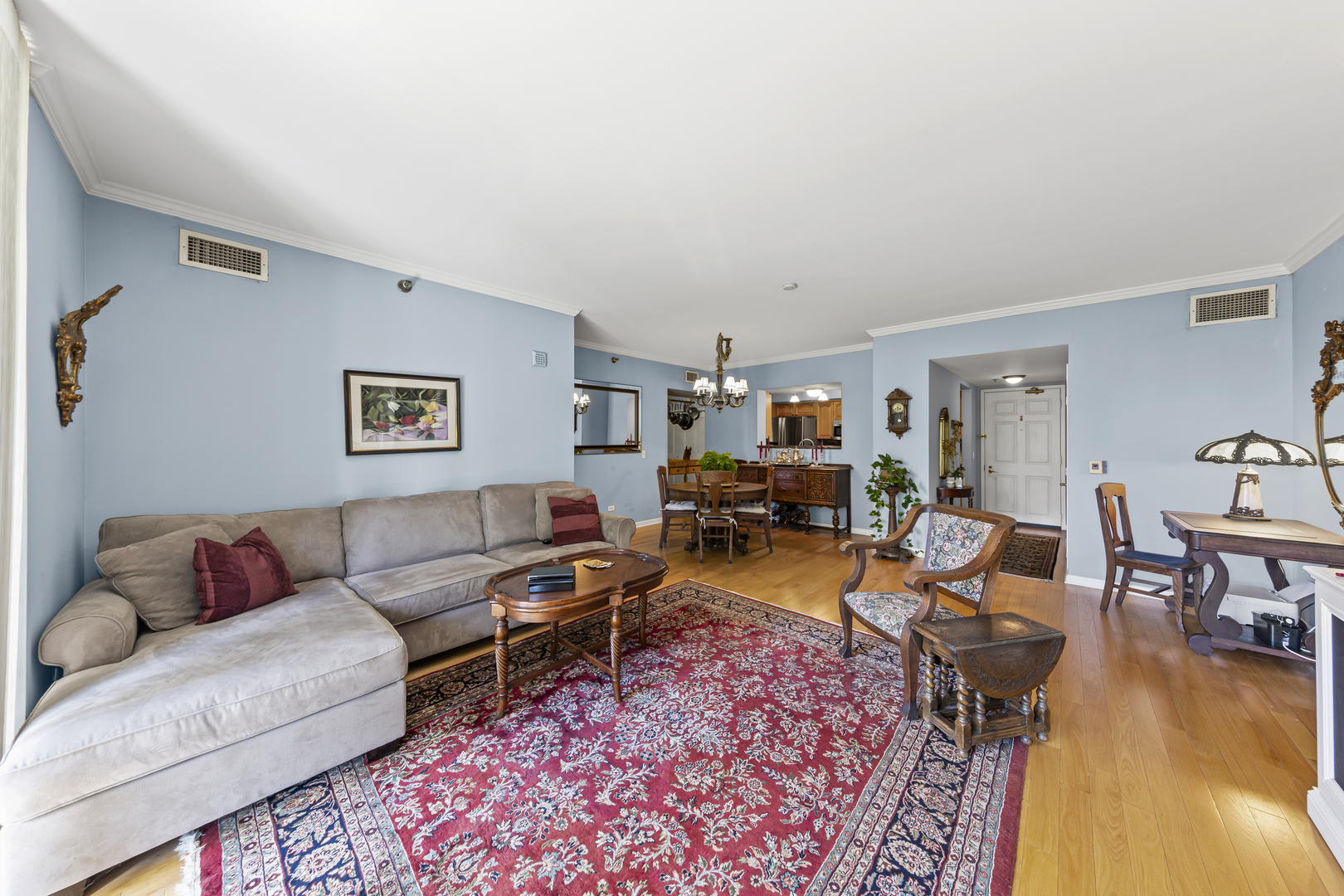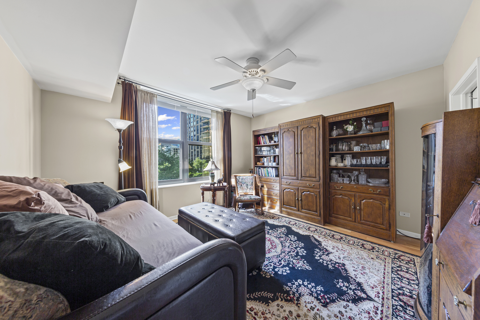 Welcome to the prestigious full amenity Park Newbury, a luxury condominium complex by the renowned Loewenberg & Associates overlooking Washington Square Park and the historic Newbury Library. The building exterior exudes opulence and grace with the center fountain and professionally landscaped gardens. Enter through the recently renovated lobby and be greeted by the professional, 5 star 24-hr door staff (truly the friendliest door staff in the city!) Head up the elevators to unit #608, one of the largest 2 bedroom floor plans in the building with skyline and treetop views for miles. An expansive chef’s kitchen, appointed with warm honey-toned wood cabinetry and sleek granite countertops (PLUS an under counter wine fridge) opens seamlessly to the dining and family rooms-both accented with gleaming hardwood floors and extending out to a remarkable 18-foot balcony. Curl up on the couch in front of the fireplace in the coming cold months while gazing out over the balcony to the city beyond. Just off the kitchen, a versatile bonus room offers endless possibilities – currently designed as a chef’s prep area with additional custom cabinetry and ample counter space, it could easily serve as a third bedroom, private home office, or charming breakfast nook (in addition to the full dining room). The thoughtful split floor plan enhances privacy, ensuring no shared walls between the two bedrooms. The primary is adorned with two extra large walk in closets, a large set of windows overlooking the skyline, and a huge primary bathroom with separate shower and double sinks. The large second bedroom is also outfitted with a large, built out walk in closet and is positioned right next to the guest bath for convenience. Deeded prime parking spot #16 is included with the price. This well planned building has 5 elevator banks, a larger than life state of the art fitness center, a renovated party room, business center, two sundecks, a receiving room, and an onsite dry cleaners. Private MASSIVE 80 sq. ft. storage room with a steel door included in the price. The Park Newbury is dog friendly, has onsite management, and an onsite engineer. Walk to the Mag Mile, Oak Street Beach, and all of the shops and restaurants you could imagine. Please exclude the butcher block counter in the current breakfast nook.