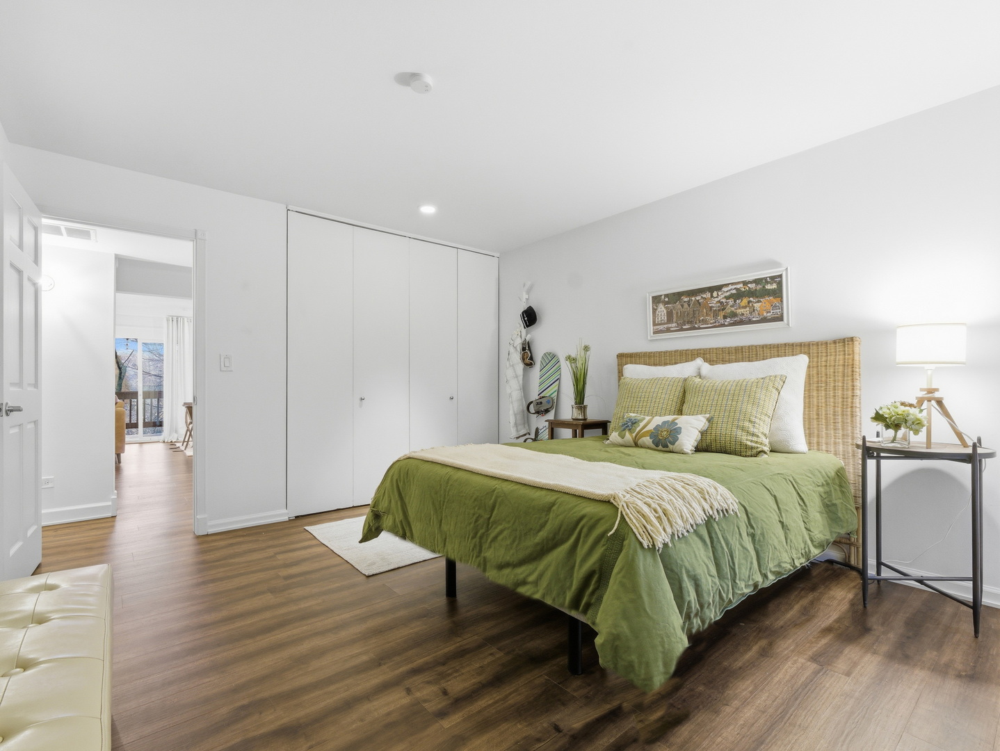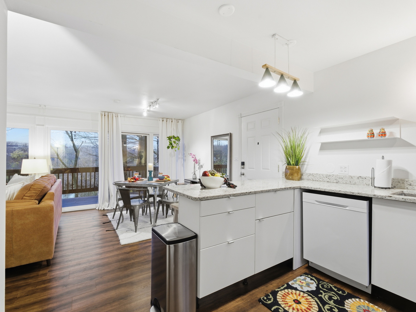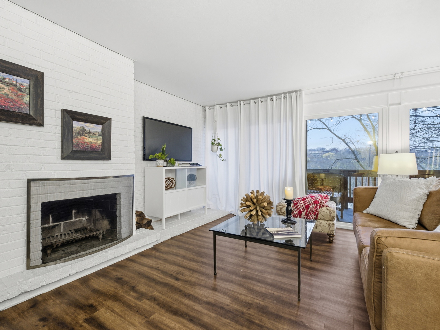 Your ticket to tranquility! Spacious and bright, this beautiful 2-bedroom 1 full bath end unit condo offers four seasons of spectacular views. Four Lakes Village is a lifestyle offering abundant recreational options – pool(s), tennis and volleyball, gym, skiing and snowboarding (they make their own snow), a pub, restaurant and convenient store. The living/dining room features a painted brick wall framing a cozy wood burning fireplace. Another full wall of sliding glass doors invites you to an entertainment-sized balcony with reposeful lake views and sunsets that never get old! Contemporary kitchen with stone countertops, stainless appliances, breakfast bar, and butler’s pantry. Spacious master bedroom and 2nd bedroom both with ample closet space. Recently renovated full bath is on-trend. In unit laundry with new washer and dryer included. Separate storage room offers plenty of space for all your belongings. Includes an assigned parking space and ample adjacent visitor parking. Recent updates include new HVAC, bedroom windows, washer and dryer, freshly painted walls, and the deck has been freshly stained. Conveniently located close to shopping, restaurants, expressways, and Metra. Welcome to your new maintenance free and convenient lifestyle!