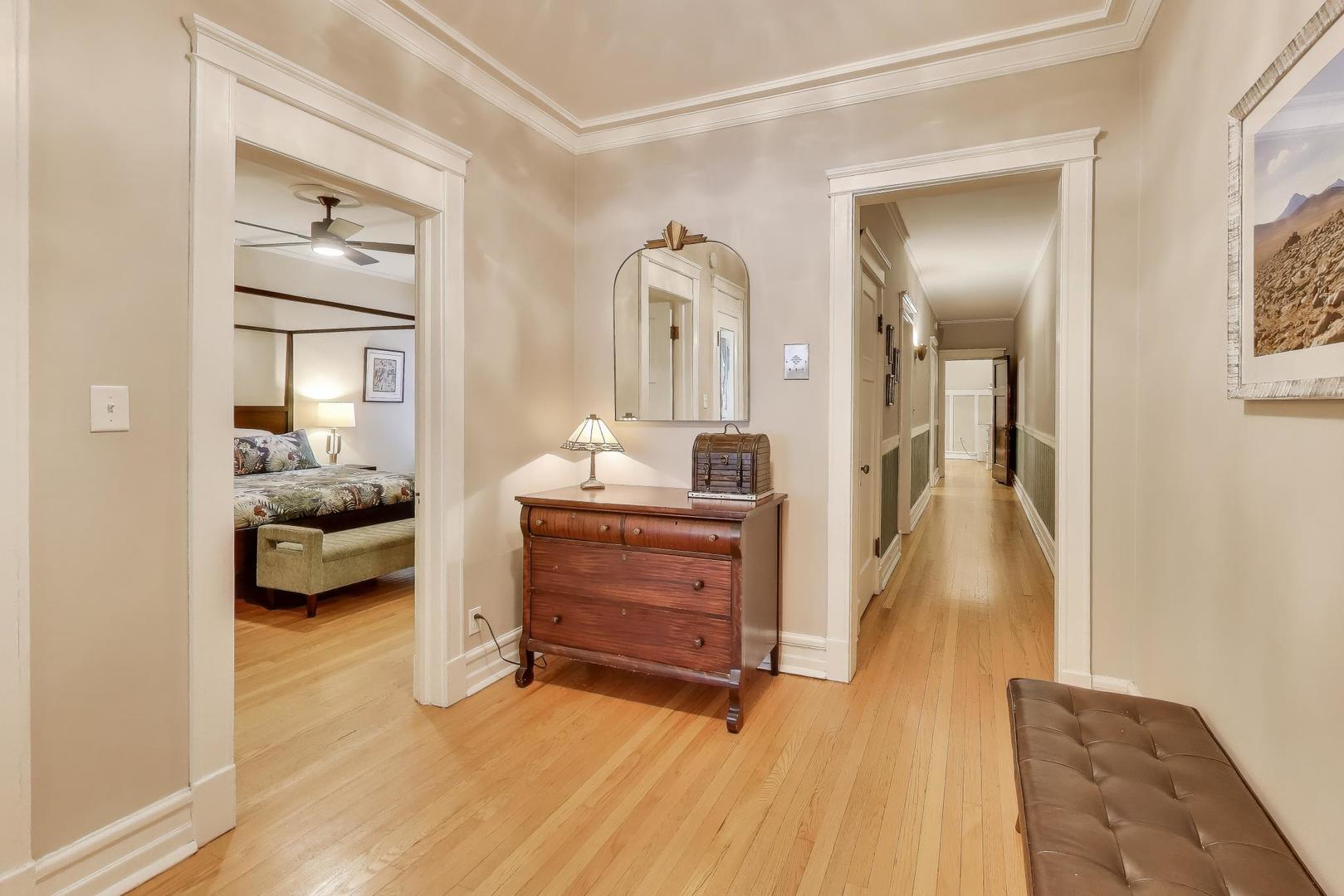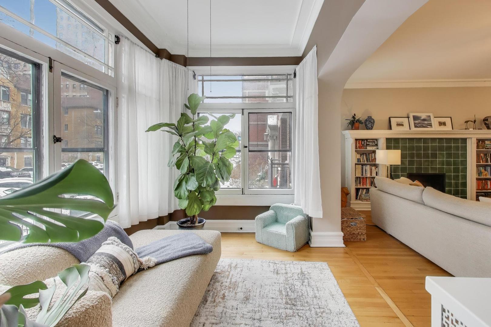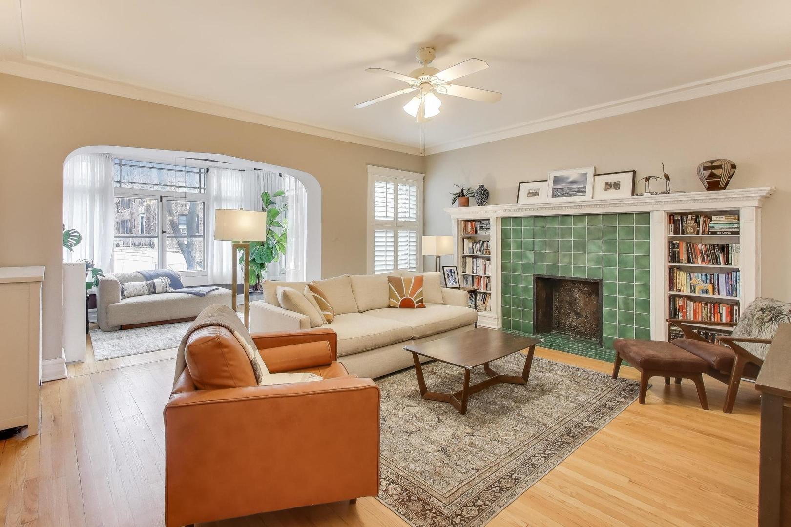Welcome to 5522 S Everett Ave, a stunning 3-bedroom, 2-bathroom condo offering nearly 2,000 sqft of beautifully appointed living space in the heart of Hyde Park. Situated in a charming turn of the century low-rise building, this condo perfectly blends classic charm and modern upgrades. Lovingly maintained, original hardwood floors flow throughout the spacious 7-room layout, creating a warm and inviting atmosphere that lends itself to both entertaining as well as quiet days at home reading in the front sunroom. The standout fully renovated kitchen features stainless steel appliances including a dishwasher, full range and refrigerator. The 42 inch kitchen cabinets, with custom organized drawers and inserts, quartz countertops and extra large white basin sink show that no expense was spared. Enjoy meals in the adjacent elegant formal dining room with original details not to be missed: the beamed ceiling and original built in buffet. The living area includes a decorative fireplace surrounded by original tile work and built-in shelving, adding a cozy touch to this sophisticated home. The updated bathrooms enhance the home’s appeal with thoughtful, contemporary finishes that mesh both vintage charm and modern convenience. Step out onto the newly built private porch to enjoy a quiet moment or a cup of coffee. Additional conveniences include in-unit laundry with a combo washer/dryer, a built out walk-in pantry and many walk-in closets that provide ample storage within the unit. Additional storage is available in the building’s common area just below as well as a separate full washer and dryer dedicated to the unit for larger loads. Building amenities include a small gym and a common laundry area, offering practical and enjoyable features for daily living. The condo is in a walk-up building, providing easy access without the hassle of waiting for an elevator. Steps from Promontory Point, the park/lake, transportation, restaurants, shopping and the museum.