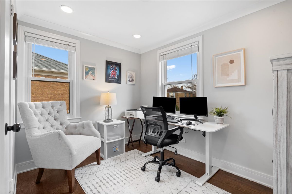 Welcome to this elegantly appointed brick Georgian home in the heart of Oriole Park, Chicago. This residence offers a harmonious blend of classic charm and modern updates, setting a high standard for comfortable living. As you enter, you’re greeted by gleaming hardwood floors that seamlessly flow throughout the sun-drenched main level. The spacious living and dining area invites gatherings, leading effortlessly into the kitchen, which was recently renovated with stainless steel appliances that cater to both the everyday chef and culinary enthusiast. Ascend to the second floor, where you’ll find three generously sized bedrooms, each providing a peaceful retreat. The recently renovated bathroom exudes luxury, showcasing a modern design complete with a soothing soaking tub. The home’s practicality is matched by its thoughtful conveniences, including central air conditioning, gas heat, and an efficient forced air system. The full basement offers a blank canvas, ready for your personal touch, while the modern washer and dryer, installed in 2020, add a layer of ease to daily life. Step outside to discover an expansive backyard, perfect for outdoor enjoyment, alongside a charming patio and common outdoor space. The oversized two-car garage stands as a testament to the home’s commitment to both style and function. This property, with its impeccable curb appeal, awaits a new owner to create lasting memories.
