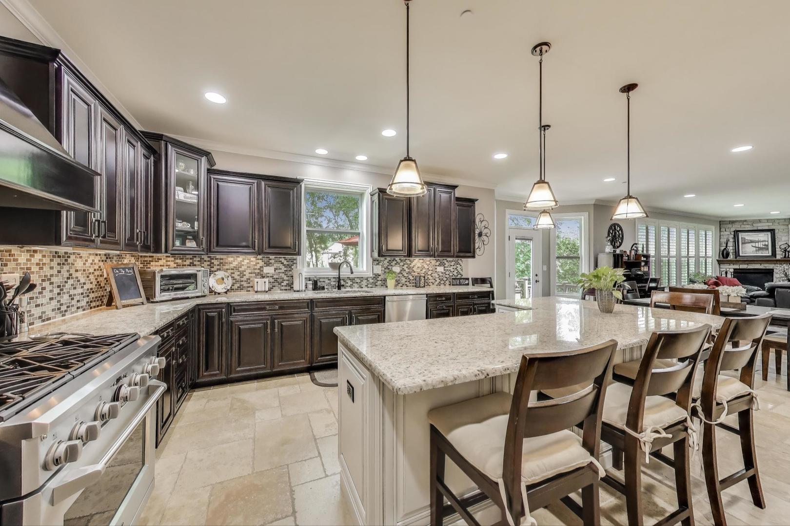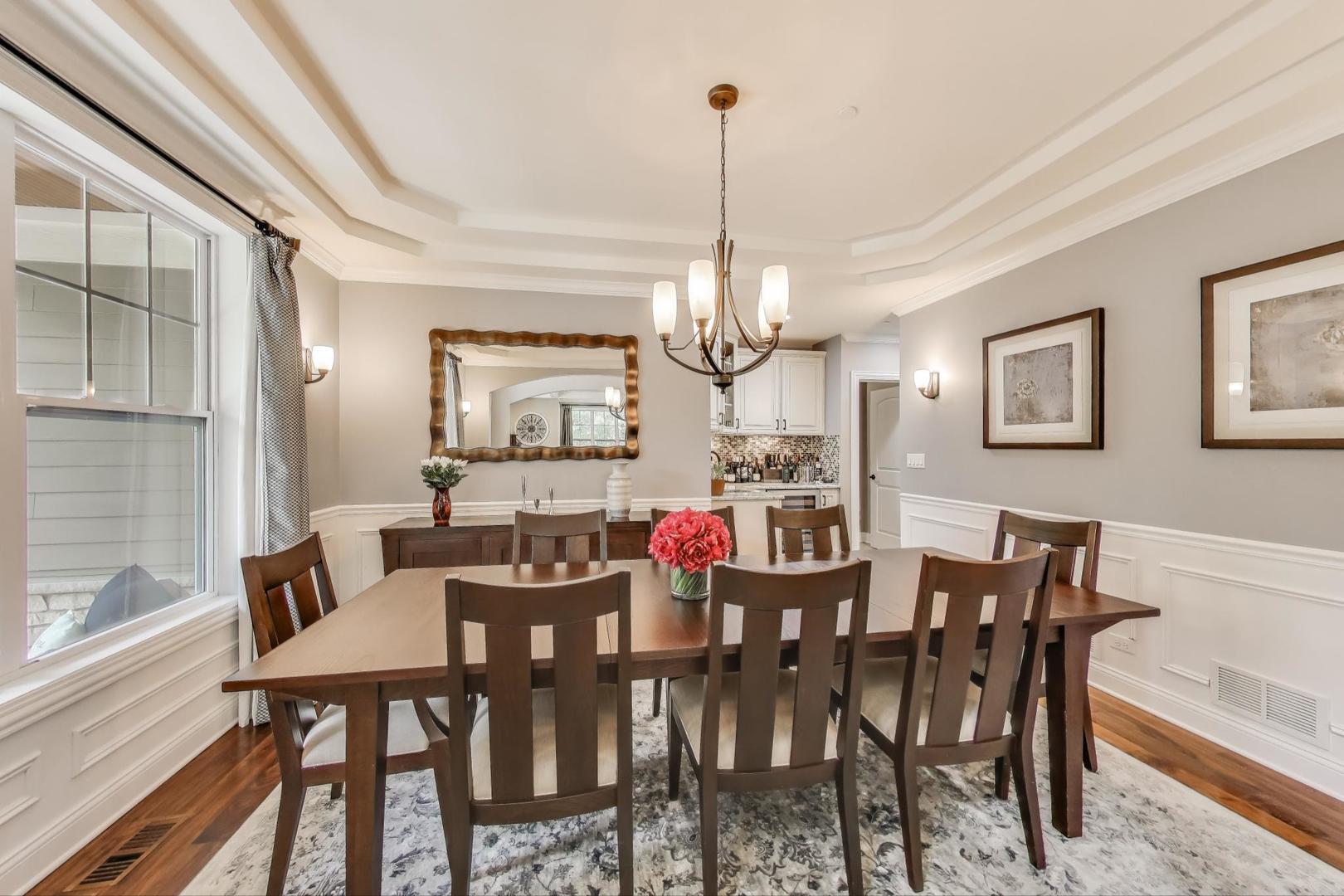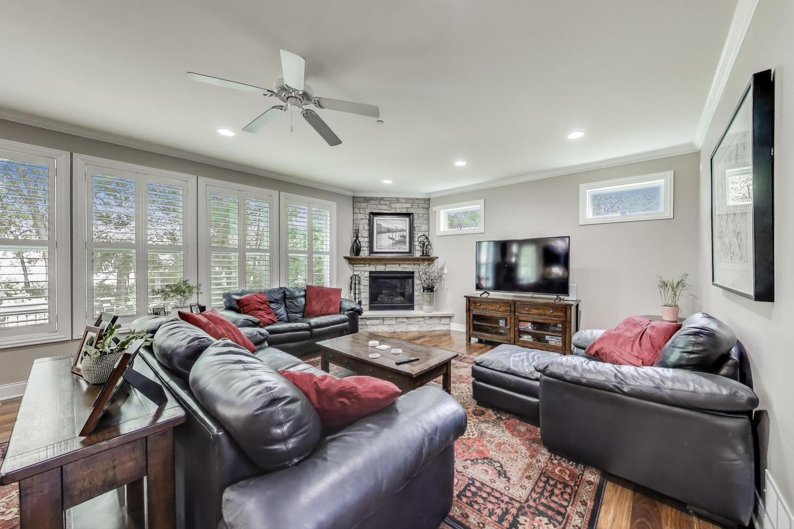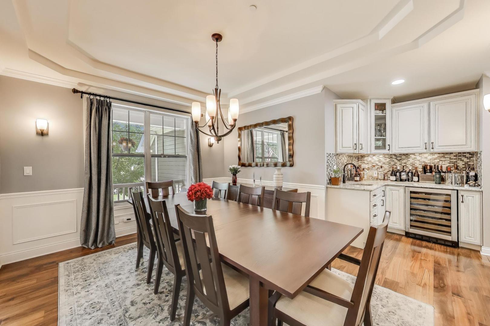 East Coast elegance meets Midwestern charm in this beautifully crafted shingle-style residence, ideally located just blocks from vibrant downtown amenities-including restaurants, boutique shops, the train, and top-rated schools. This one owner home, built in 2014, 5,700 sq.ft approx. was thoughtfully designed for modern living, featuring an open-concept main floor and a spacious backyard ideal for entertaining. From the inviting front porch to the moment you step through the front door, you’ll be struck by the attention to architectural detail throughout. The heart of the home is a stunning family room anchored by a stone fireplace, seamlessly flowing into the kitchen and dining area. Expansive windows throughout flood the interior with natural light, creating a warm and welcoming atmosphere. Upstairs, the second level offers generously sized bedrooms, each with excellent closet space and access to multiple bathrooms and a well appointed laundry room. The luxurious primary suite is tucked away in its own private wing and features two walk-in closets, and a spa-inspired bathroom. The fully finished lower level is equally impressive, offering a custom wet bar, stylish ambient lighting, a fifth bedroom, and abundant storage. Step outside to a beautifully landscaped backyard complete with a deck and slate patio-perfect for outdoor gatherings. Additional highlights include an attached three-car garage with a fourth tandem space, offering ample room for vehicles and storage. This exceptional home combines timeless style, modern comforts, and a highly desirable location. A must-see property for discerning buyers.