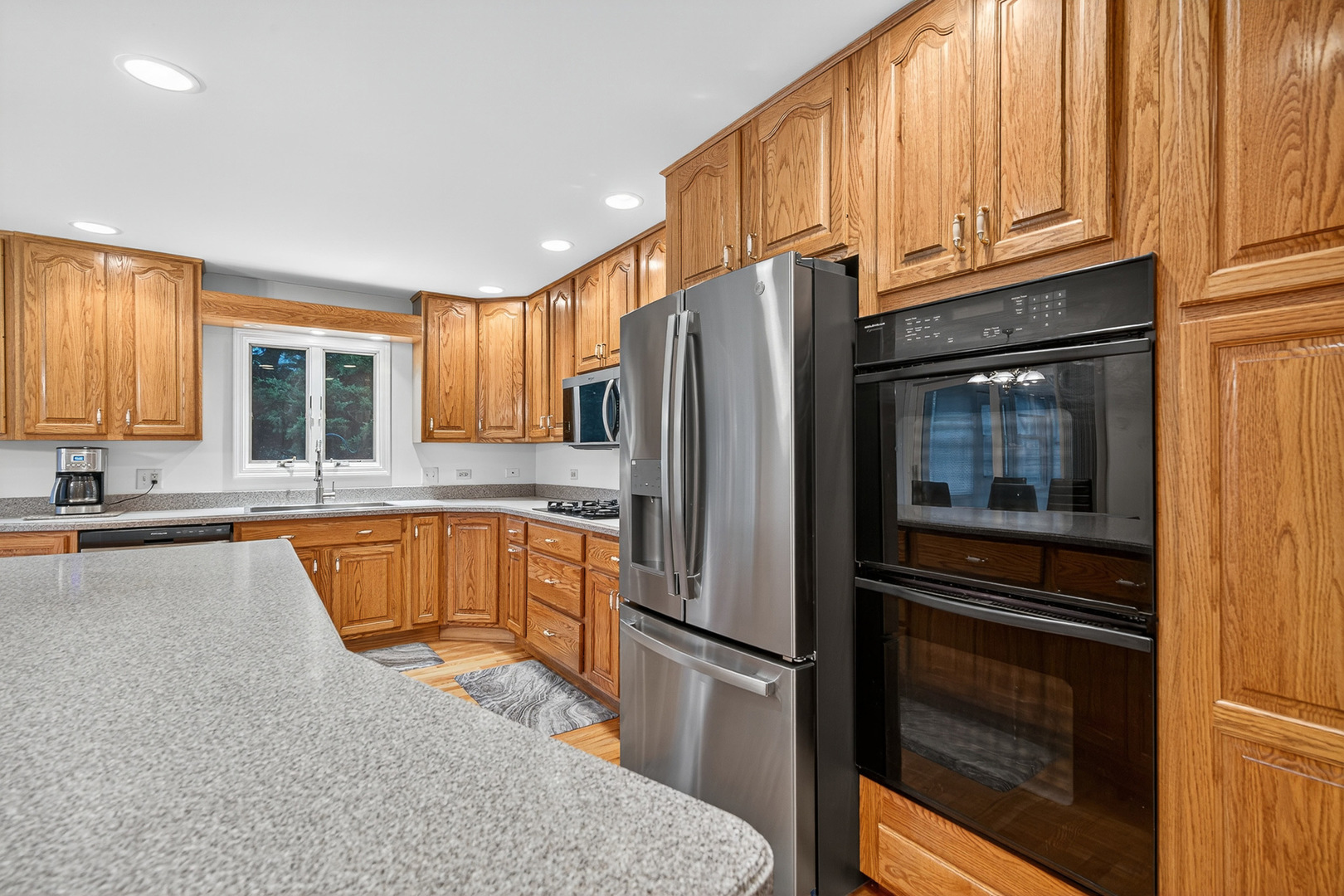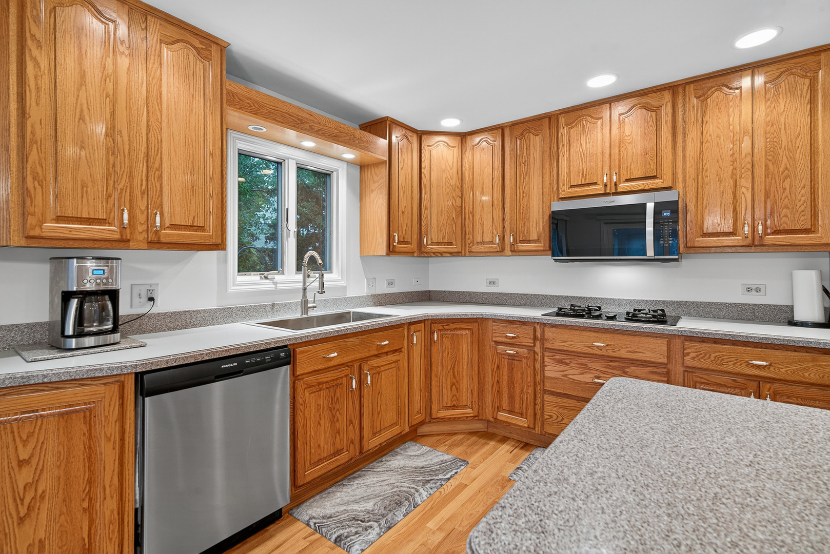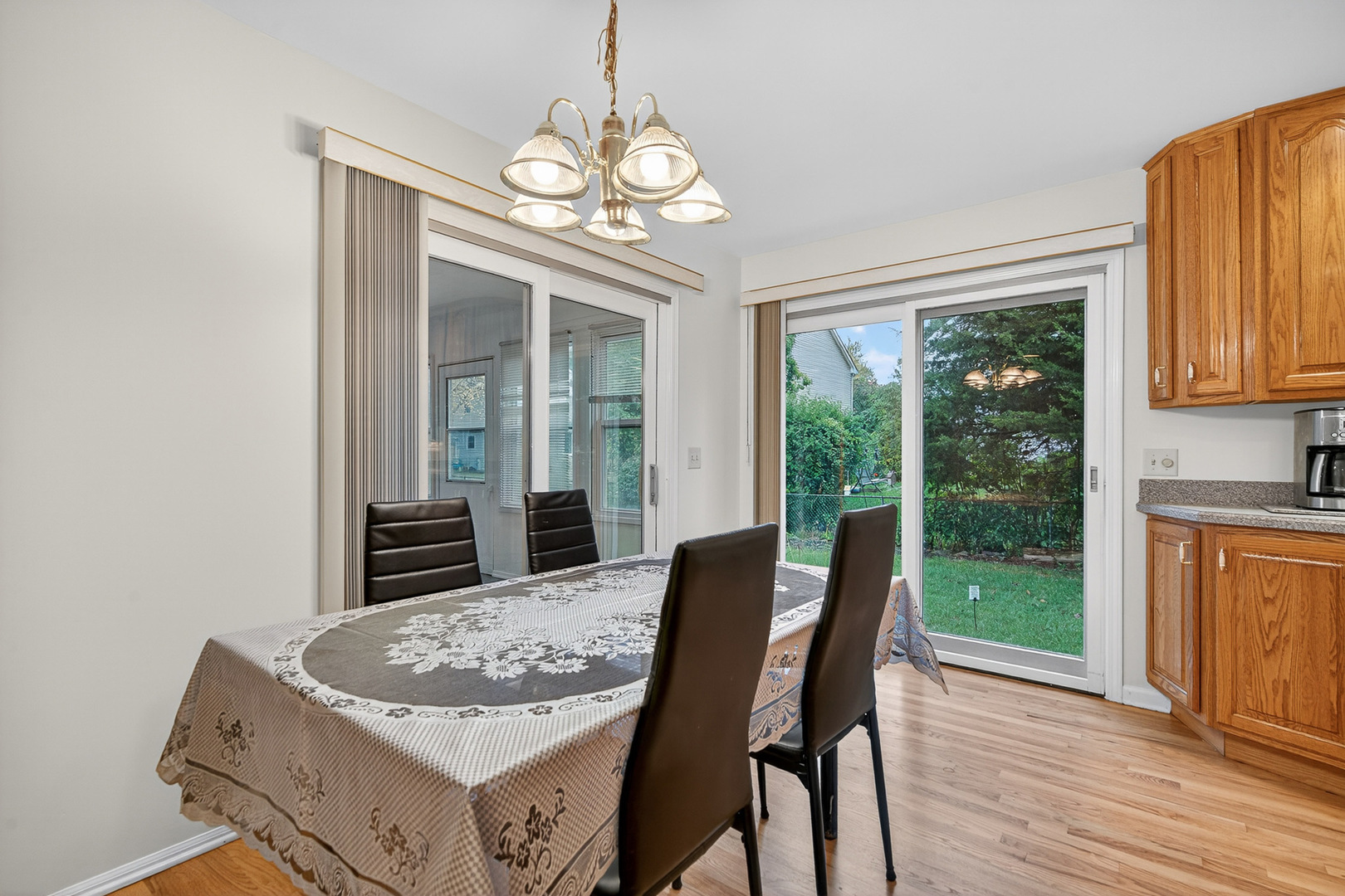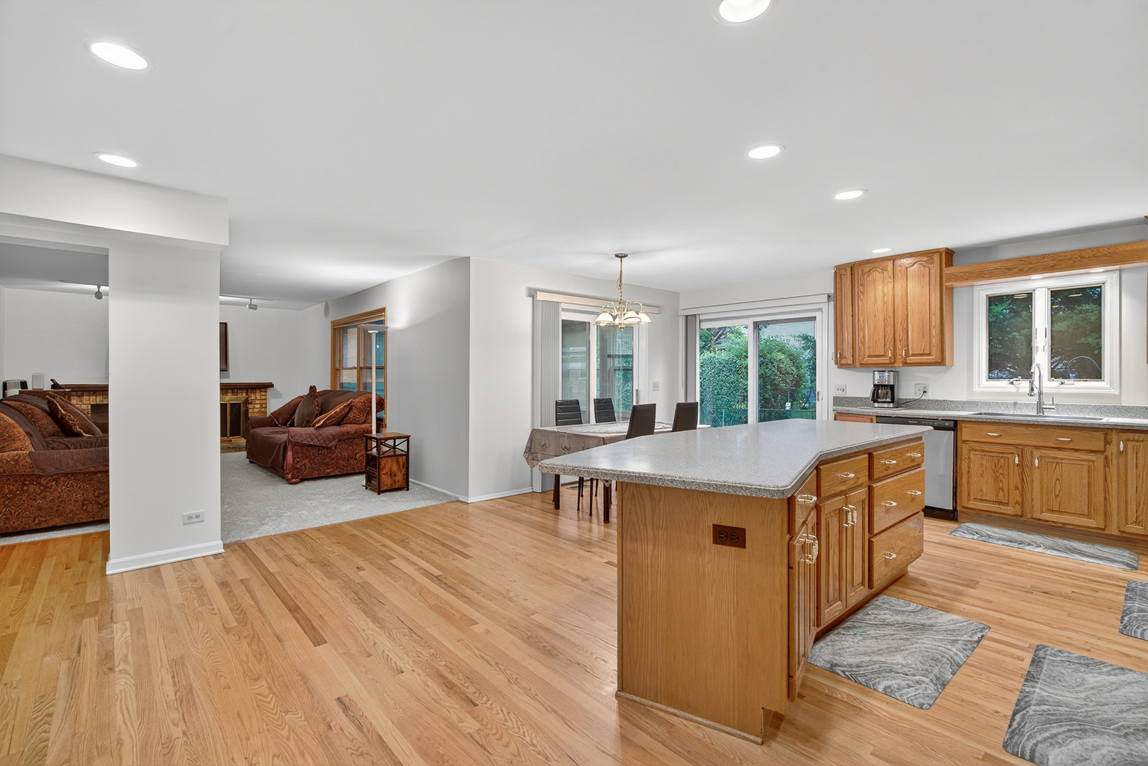Welcome to this spacious 5-bedroom, 2.5-bath home in the desirable Strathmore subdivision. The first floor offers a warm and inviting layout with a family room featuring a brick wood-burning fireplace that flows seamlessly into the large kitchen. The kitchen includes an island with breakfast bar, double oven, cooktop, pantry cabinet, table space, and a built-in desk with extra storage. A formal dining room and living room sit just off the kitchen, along with a convenient half bath for guests. The bright three season room with a gas line for outdoor cooking leads to the fenced backyard with an additional gas line ready for your BBQ. Upstairs, you’ll find five generously sized bedrooms including a primary suite with private en suite with walk-in shower. The updated hall bath features a new shower (2023). Additional updates include new carpet and freshly sanded and oil-stained hardwood floors in the kitchen. The partial unfinished basement includes laundry with sink and offers endless potential for additional living space, office, or storage. Enjoy the 2-car attached garage and proximity to parks, shopping, dining, and transportation. Zoned for highly rated District 54 schools and Schaumburg High School!